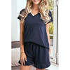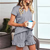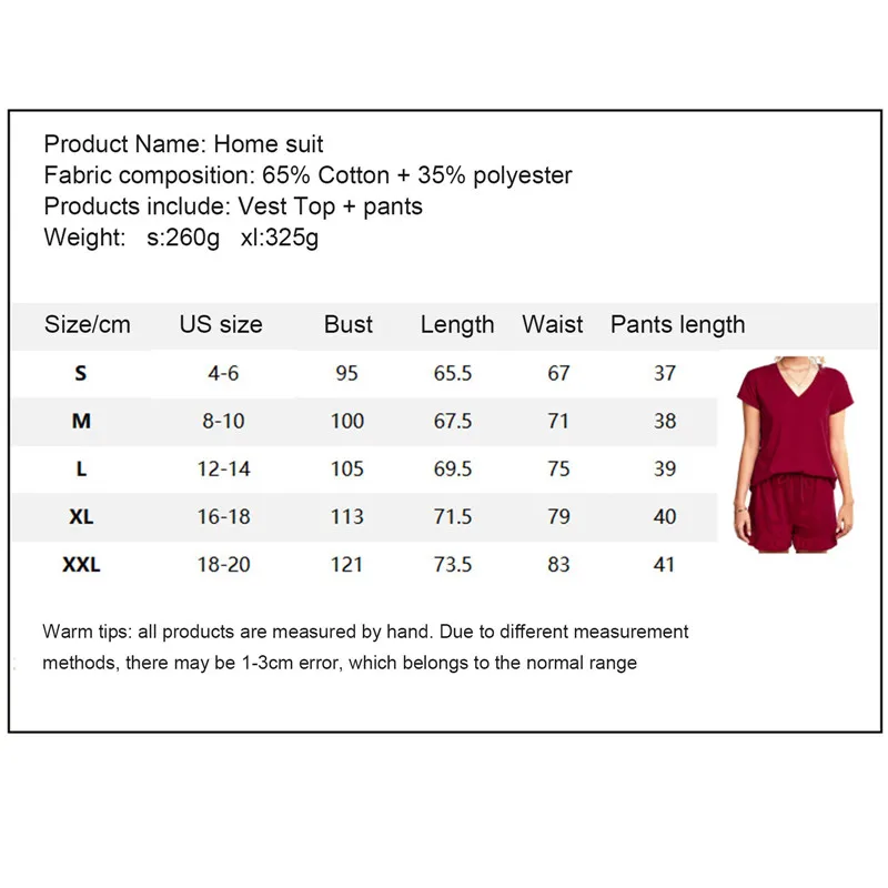 This Pajama suit is a V-neck short sleeve top with shorts. The shorts are equipped with elastic band at the waist. The drawstring is more convenient and loose fitting. The hem is fashionable and lovely.