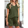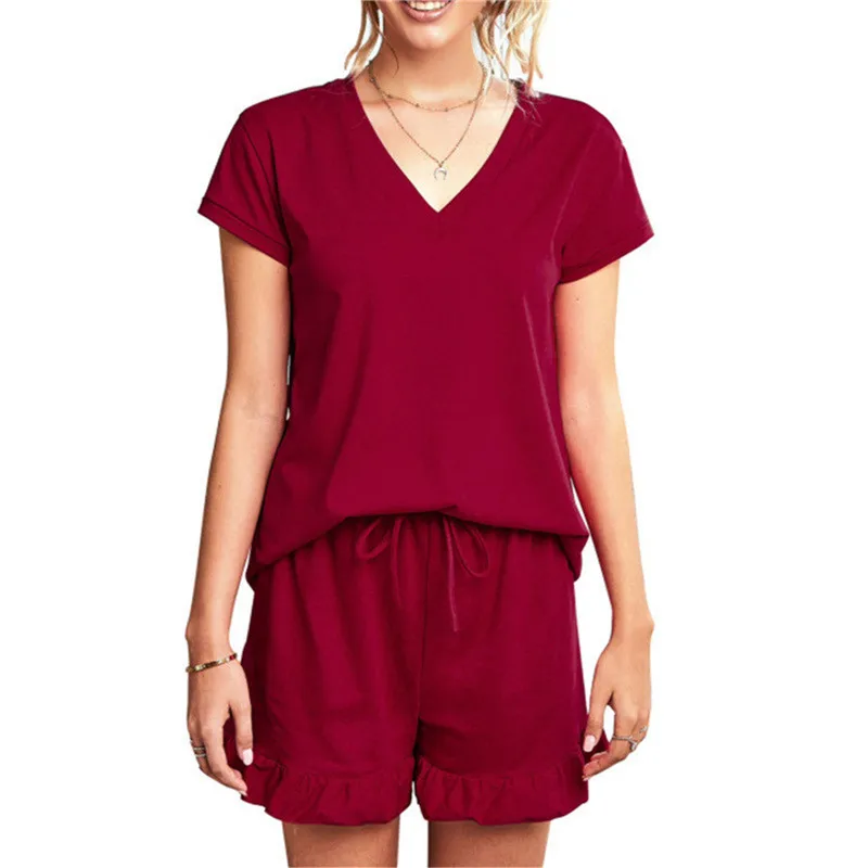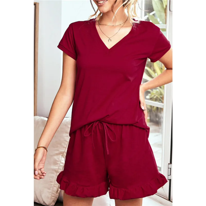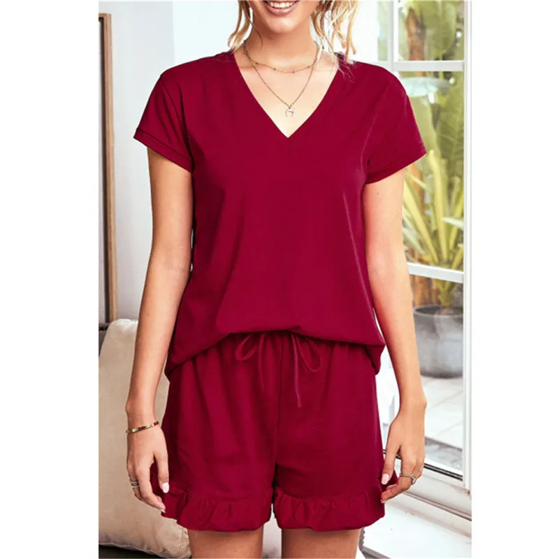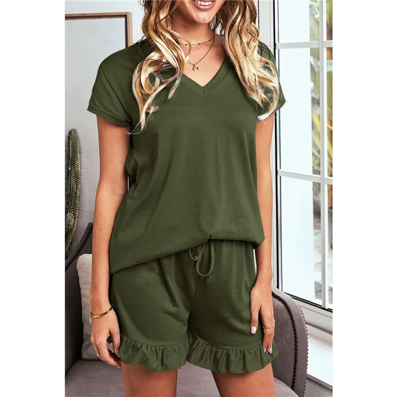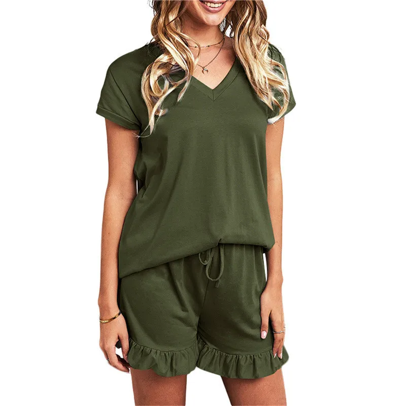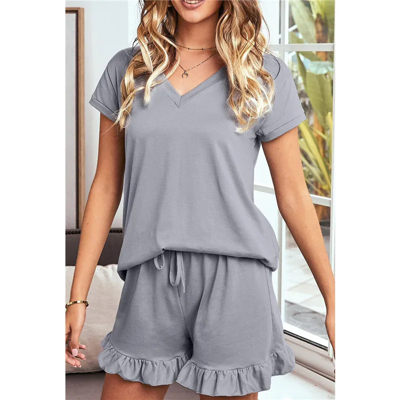 1 Set Summer Pajamas Girl’s Cotton Women’s Solid Color Short Sleeve V-neck T-Shirt Top Drawstring Shorts Housewear Pajamas