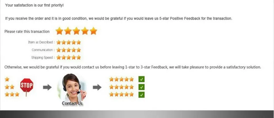 Since your feedback is very important to our business`s development, we sincerely invite you to leave positive feedback for us if you are satisfied with our product and service. It`ll just take you 1 minute. Thank you!