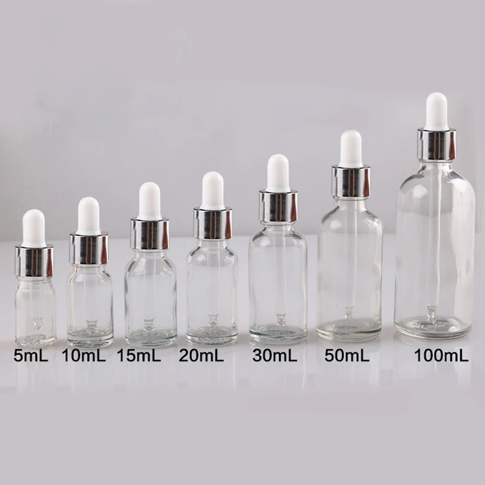 10pcs/lot 5ml to 100ml lab clear round glass Refined oil bottle with glass droppers silver circle for school experiment