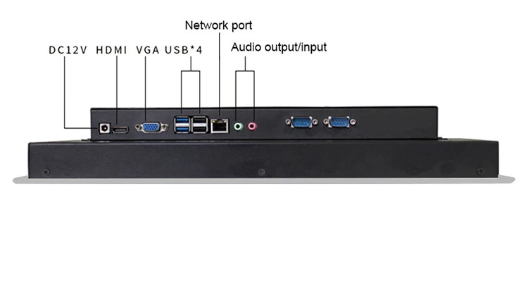 Interface:1 x VGA + 1 x HDMI + 2 * COM (default 232 protocol interface) +1 x RJ45 + 4 * USB + 1 x audio