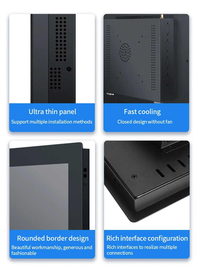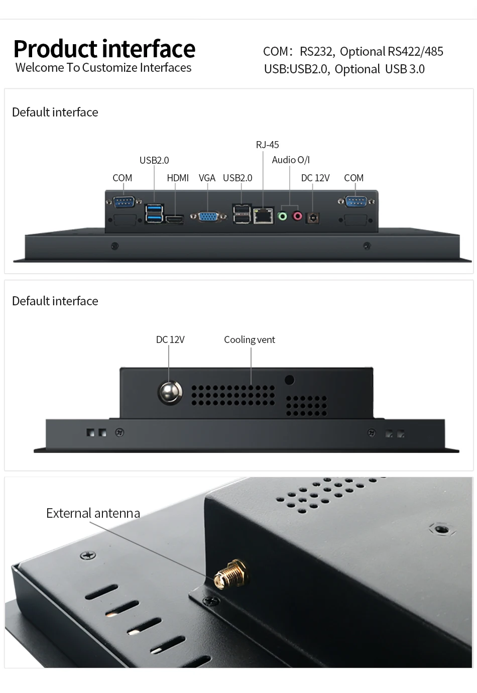 Interface:1 x VGA + 1 x HDMI + 2 * COM (default 232 protocol interface) +1 x RJ45 + 4 * USB + 1 x audio