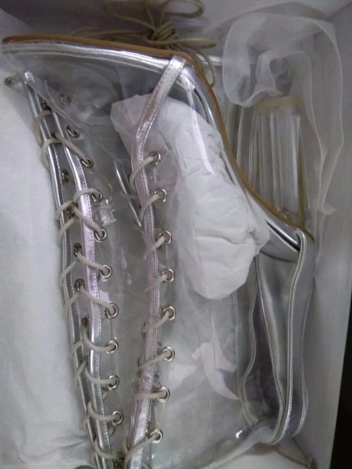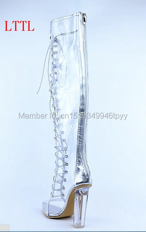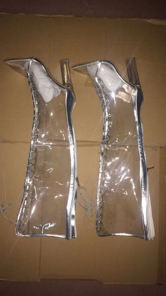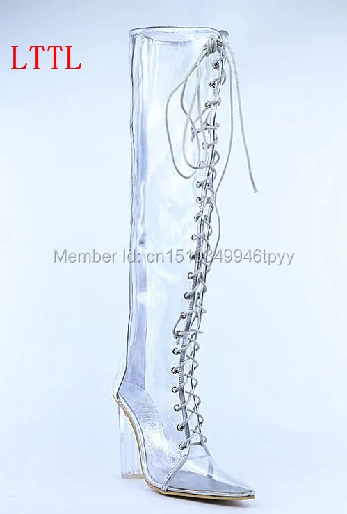 2016 Designer Women PVC Lace-up Knee High Boots Transparent Clear Boots Pointed Toe Perspex heel women rain-boots