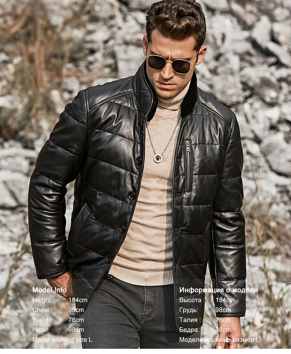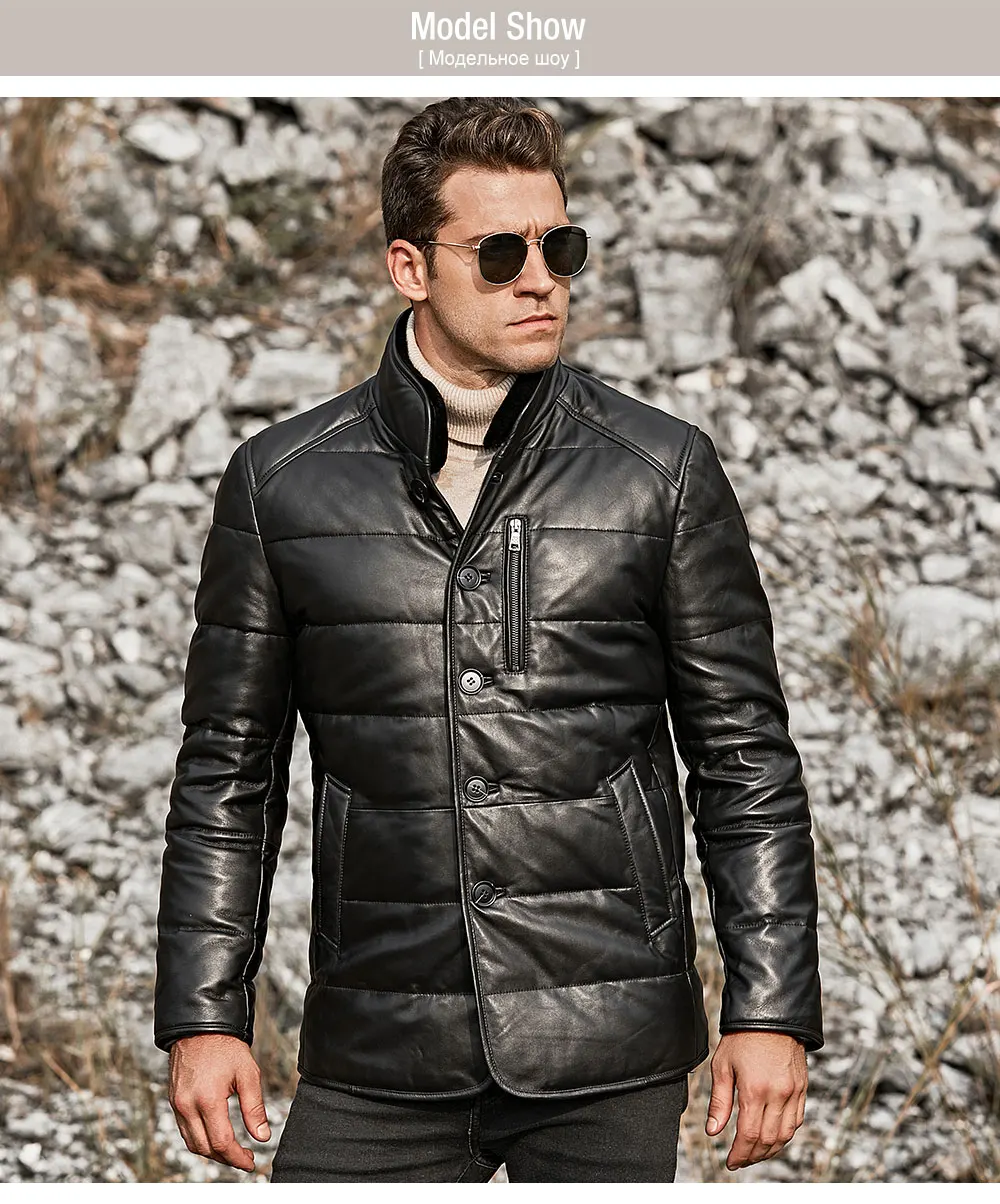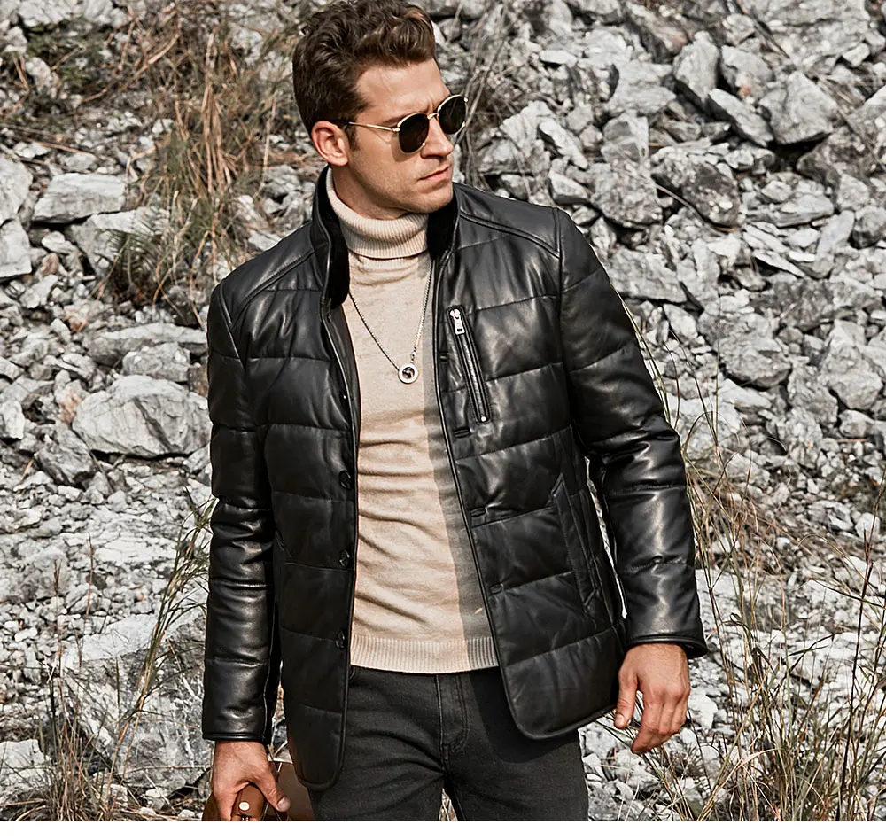 2018 Men’s Lambskin Genuine Leather Jacket Duck Down Jacket With Standing Collar Winter Down Coat Button closure