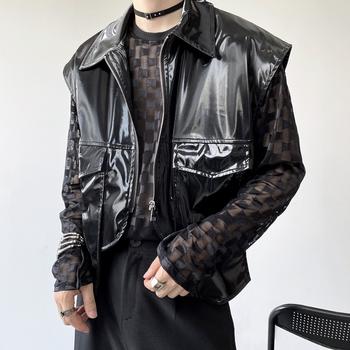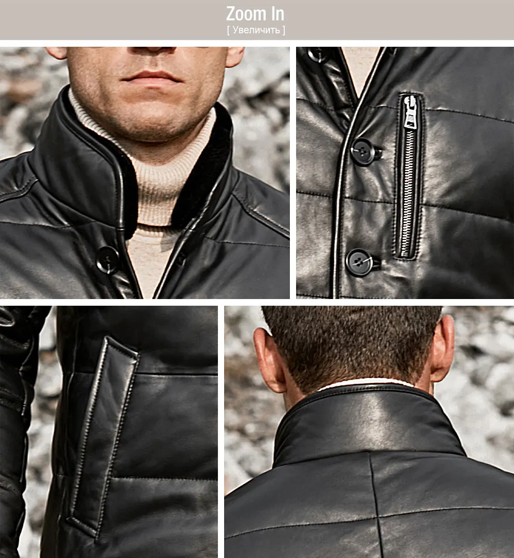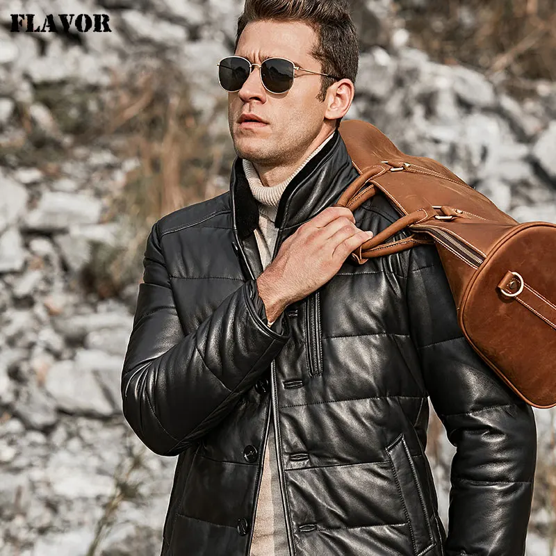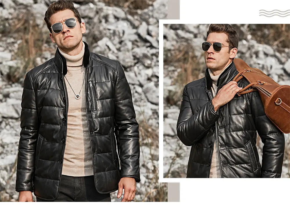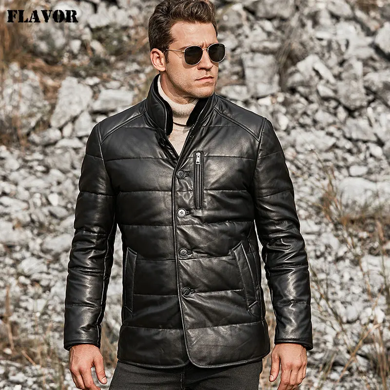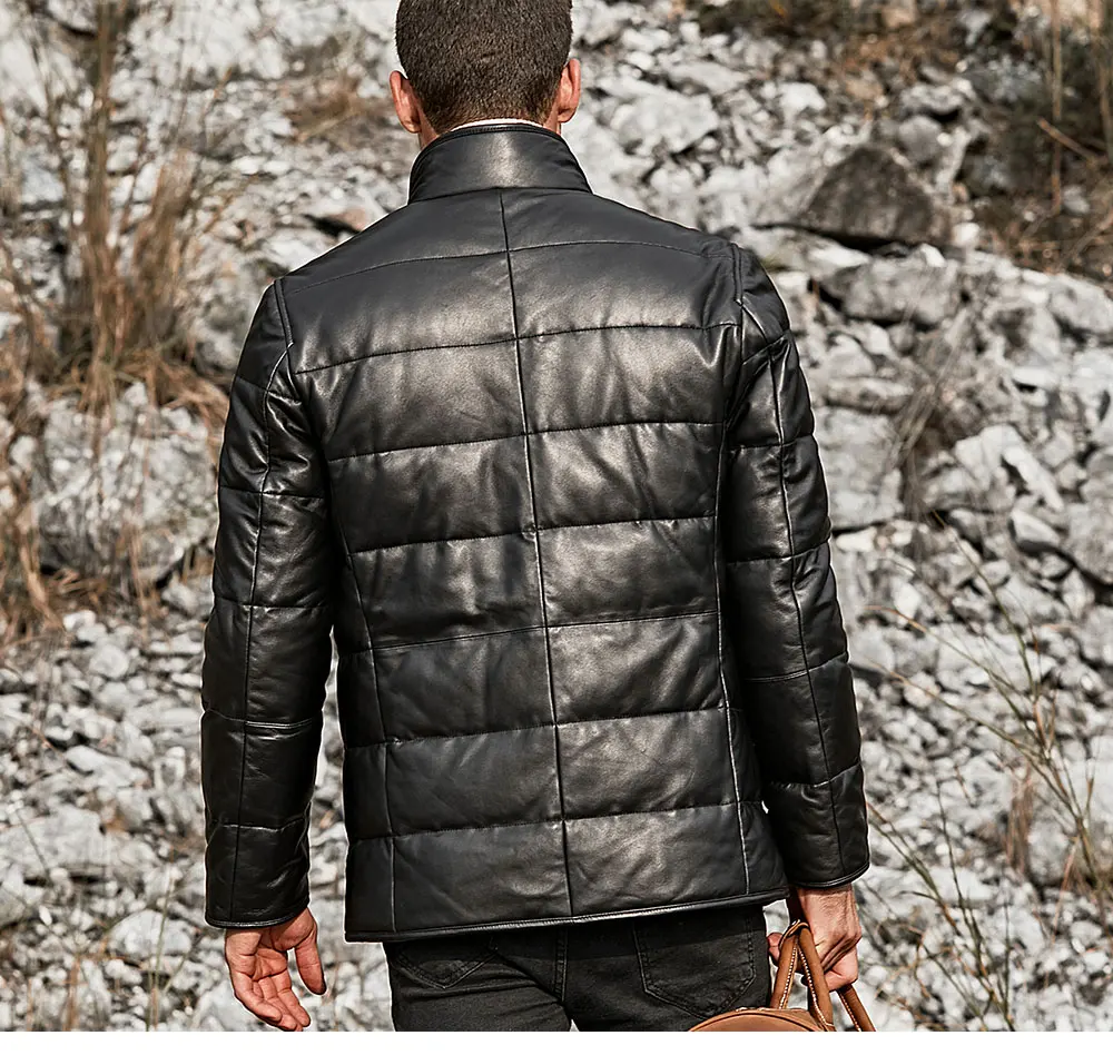 2018 Men’s Lambskin Genuine Leather Jacket Duck Down Jacket With Standing Collar Winter Down Coat Button closure