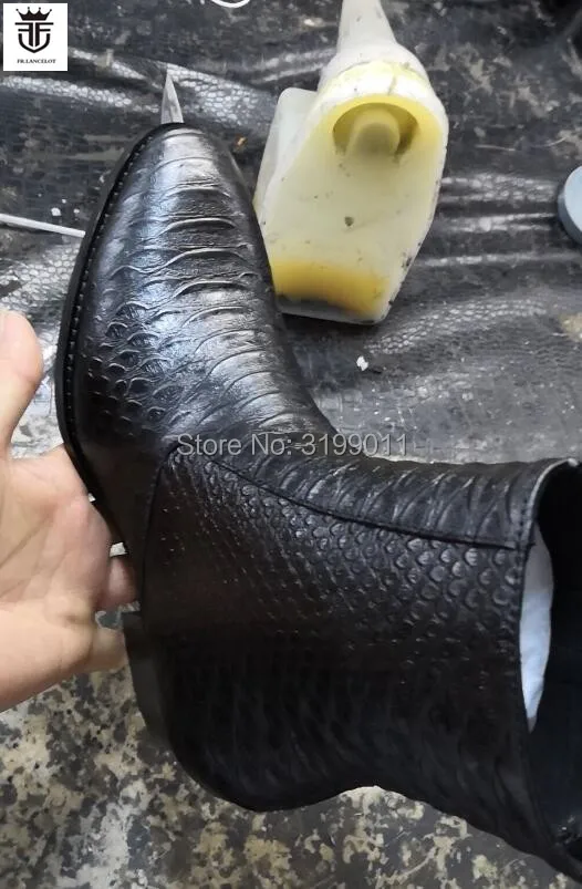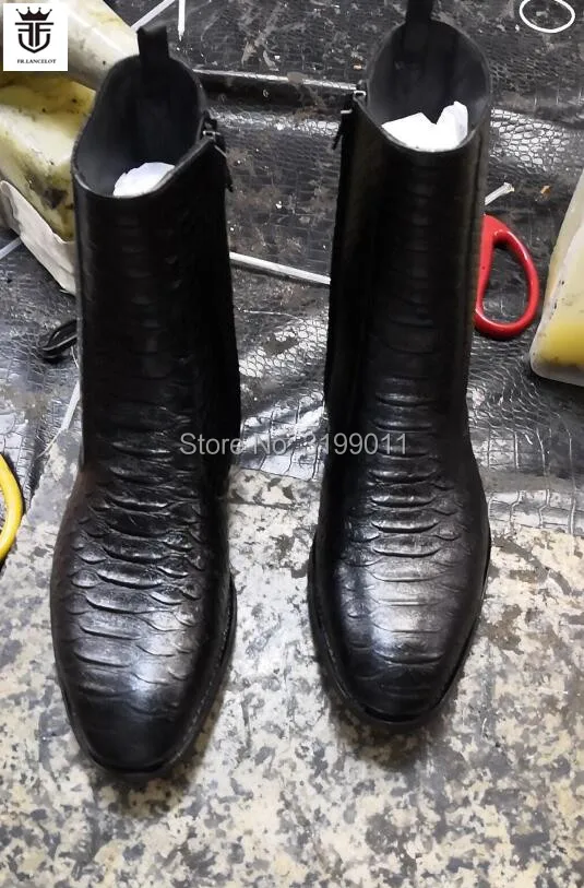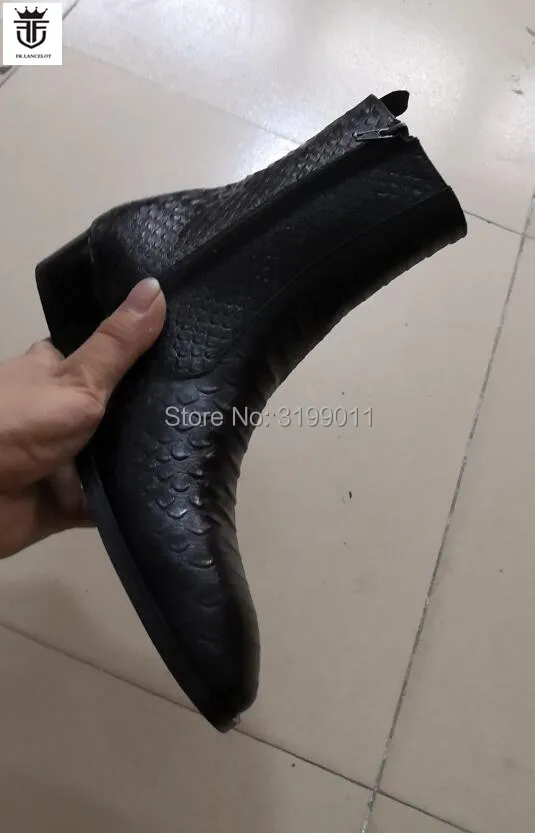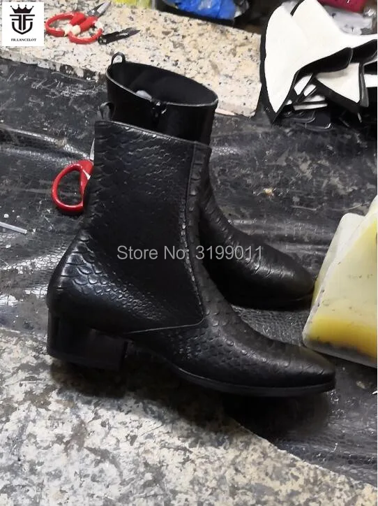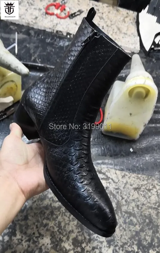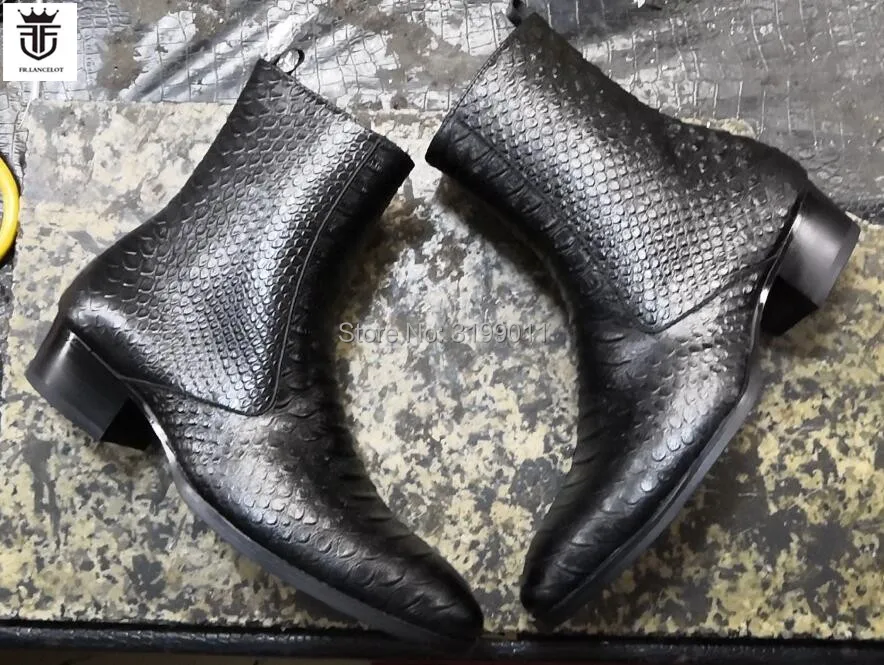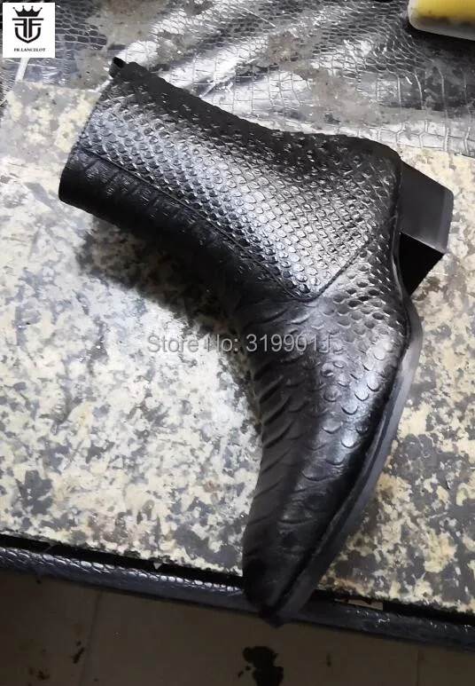 2020 New men boots black leather boots snakeskin print leather Chelsea boots men dress shoes point toe mujer botas med heel 5cm
