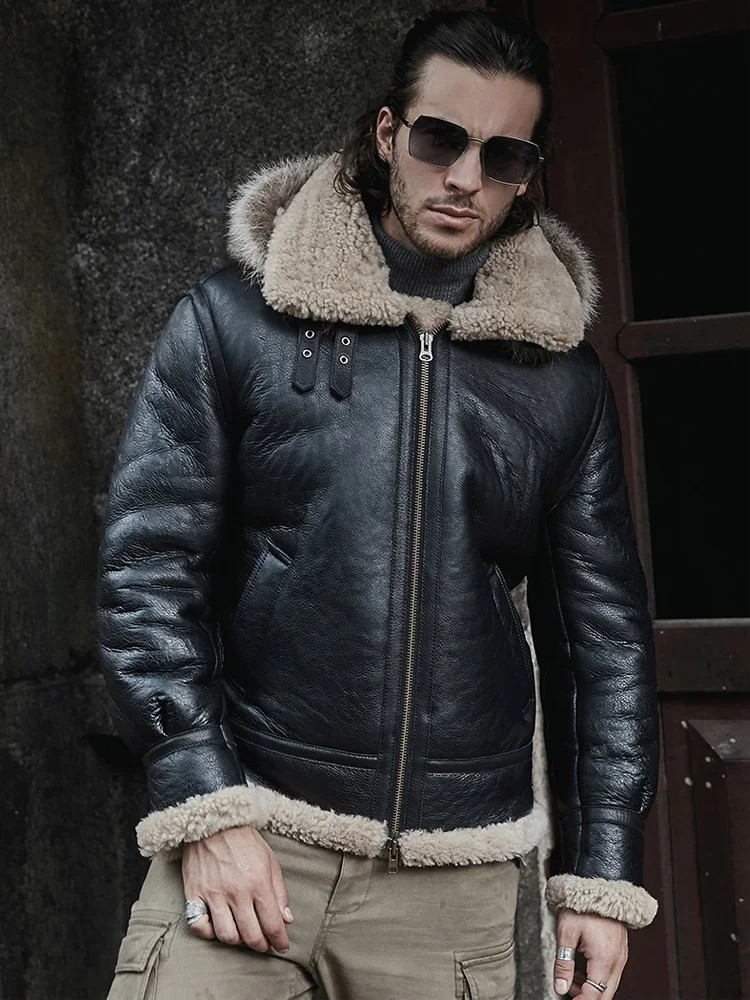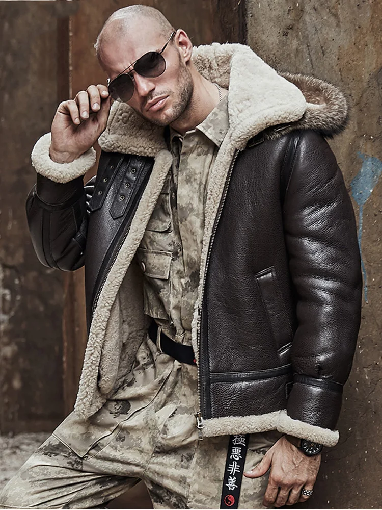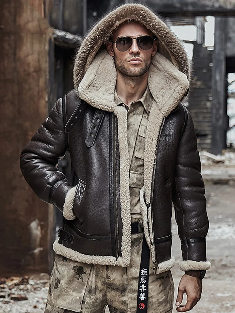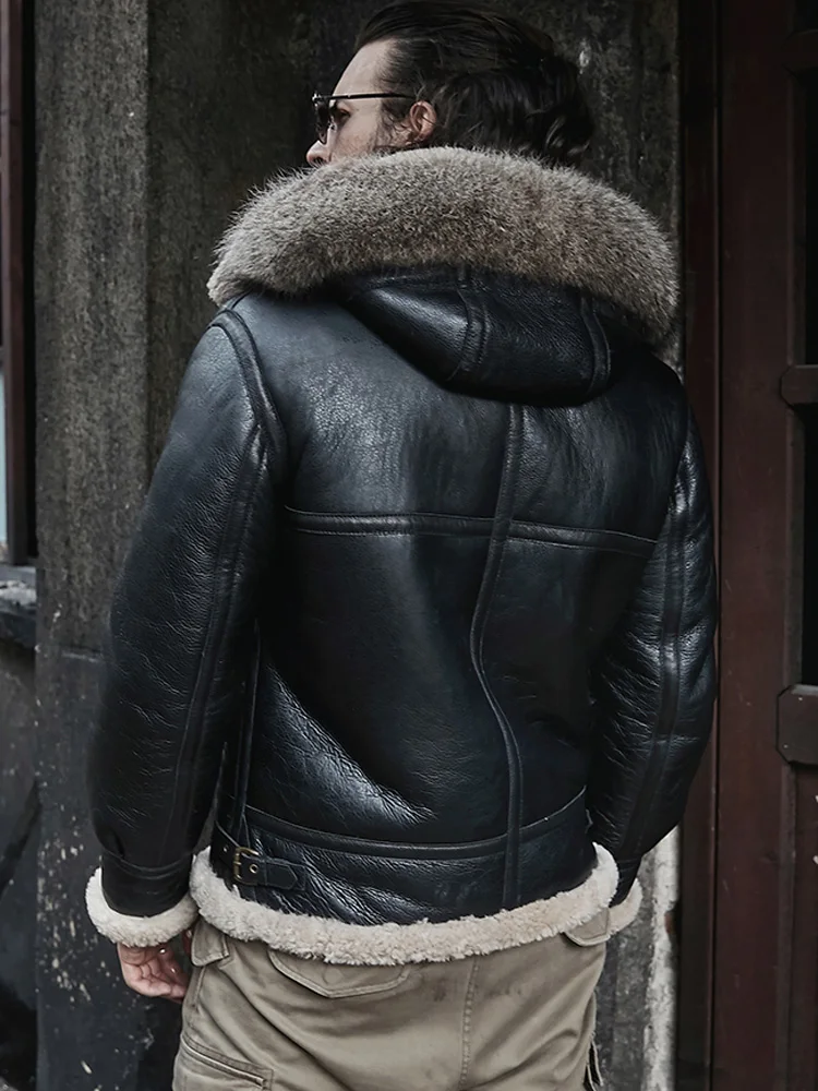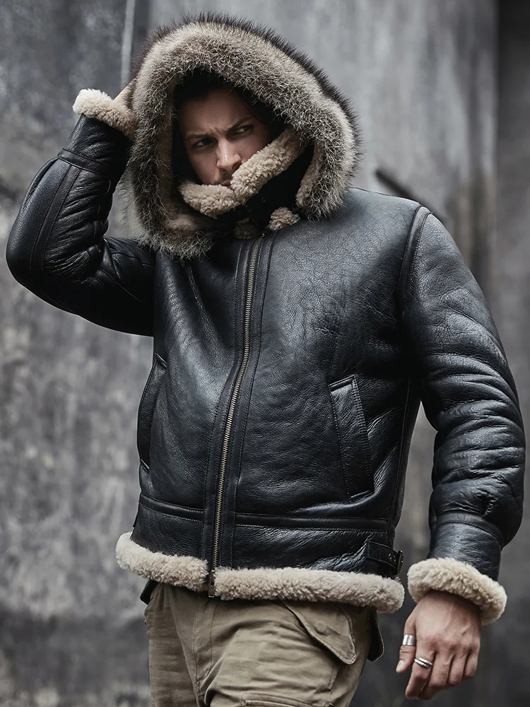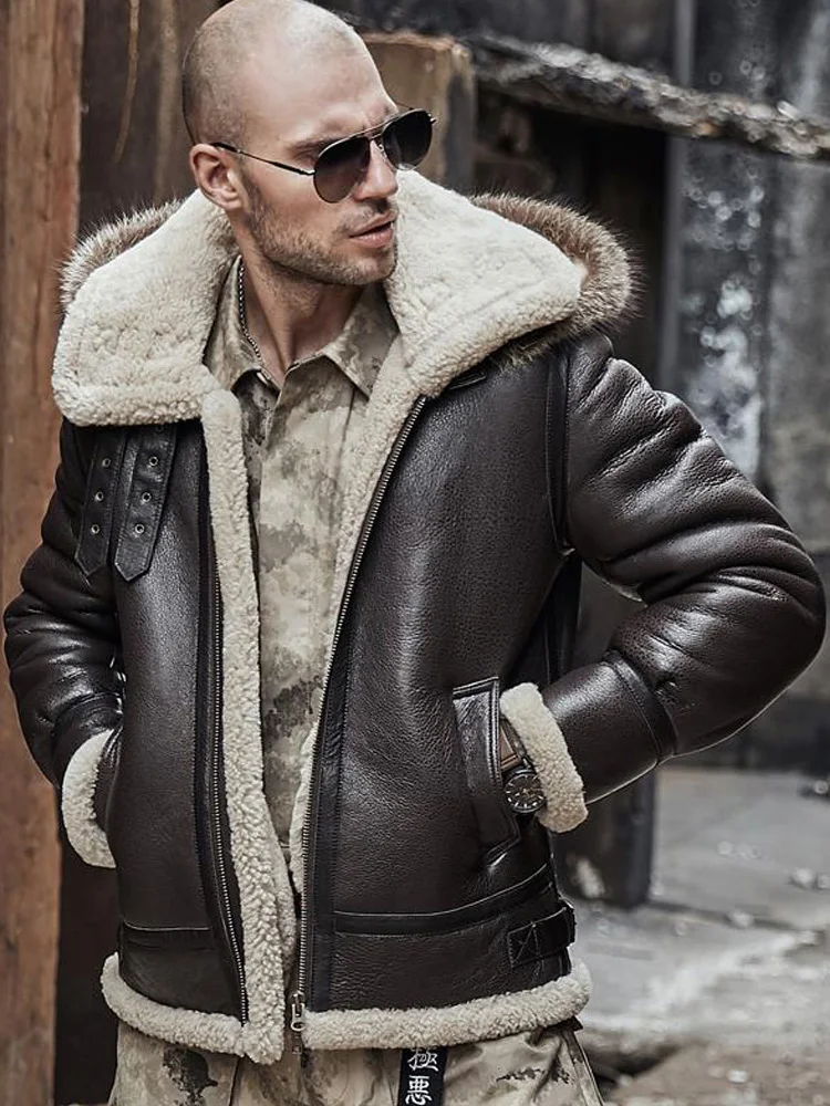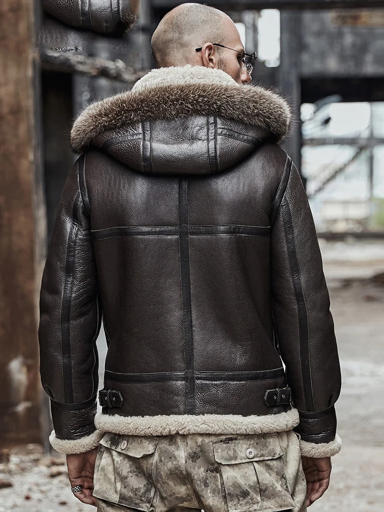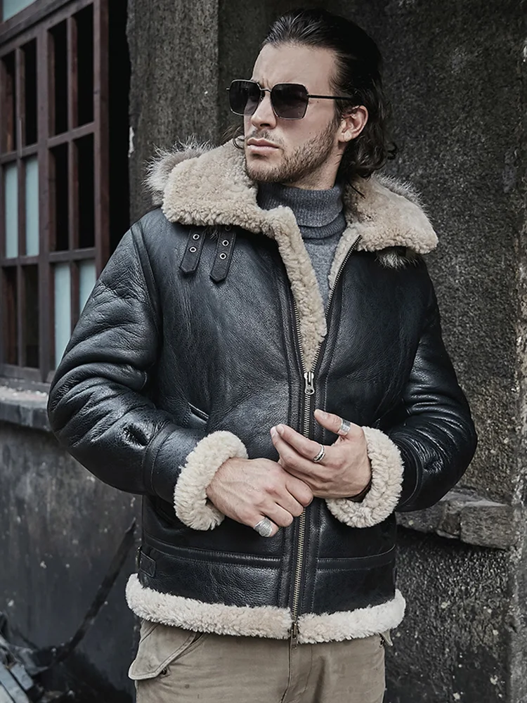 2020 New Mens Sheepskin Shearling Jacket Detachable Hooded B3 Flight Jacket Raccoon Fur Collar Aviator Coat