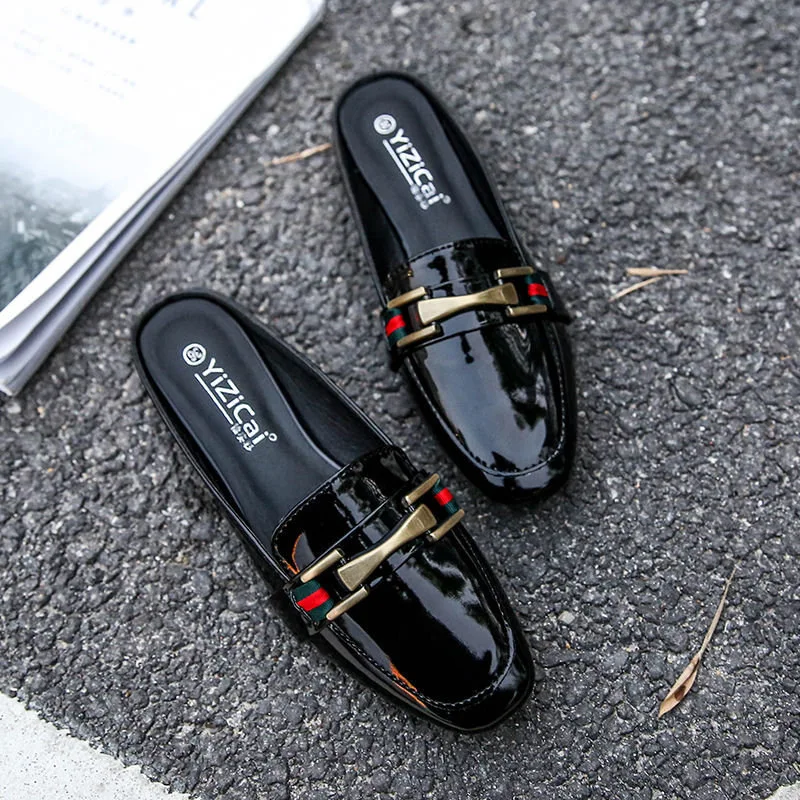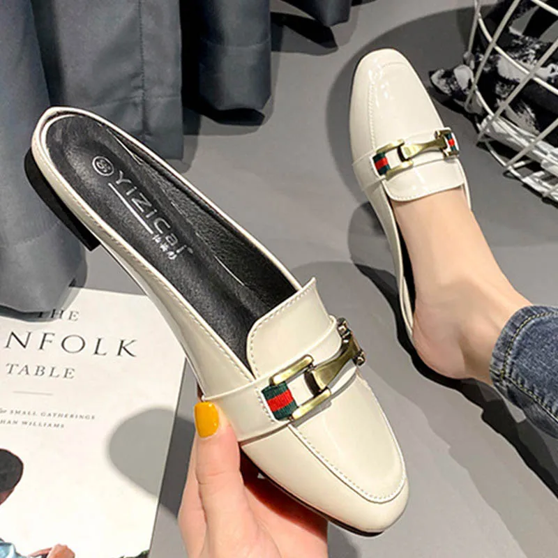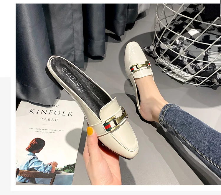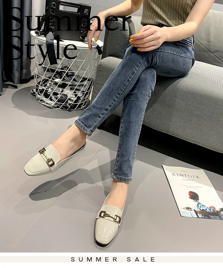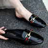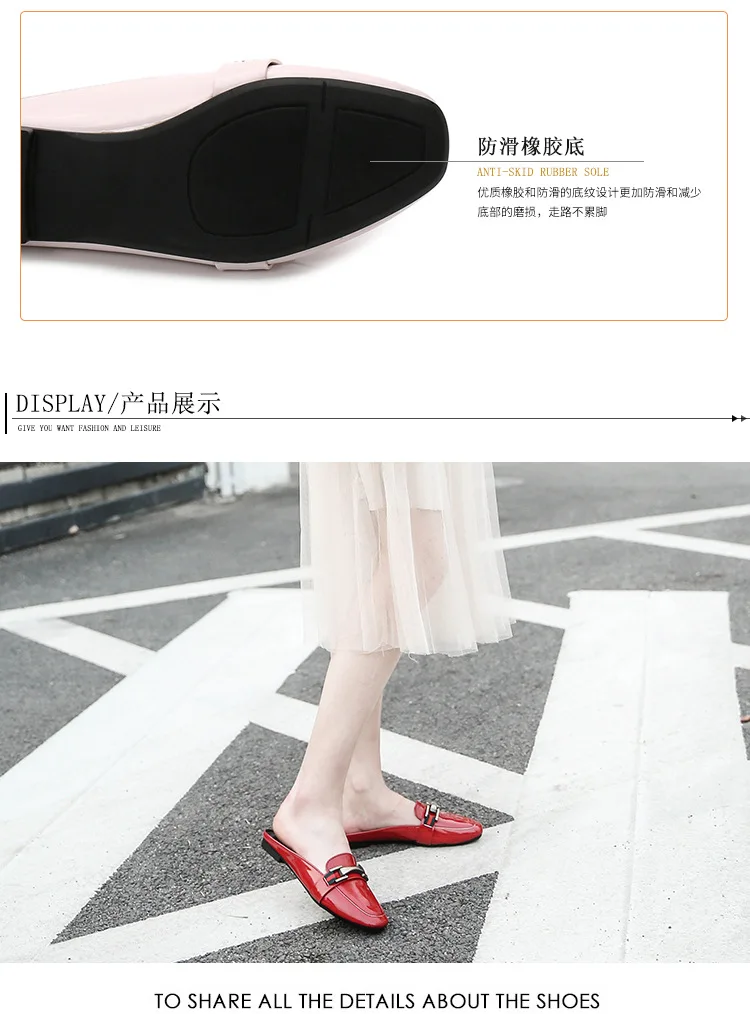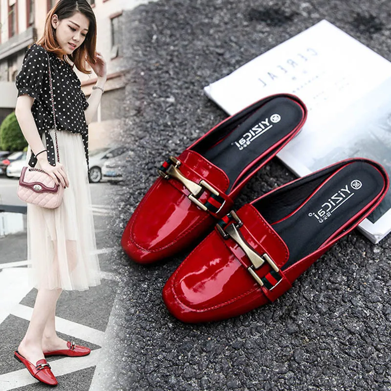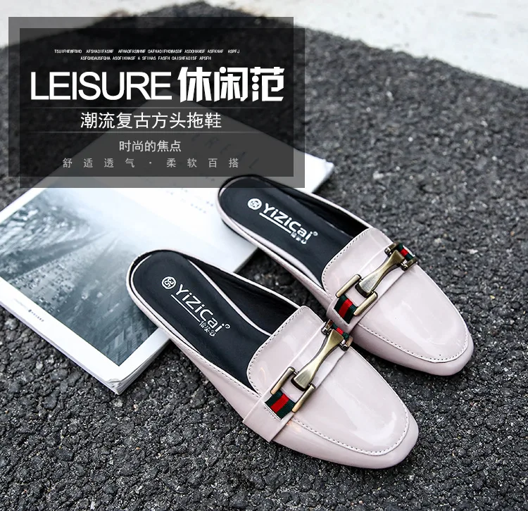 2020 Patent Leather metal buckle square toe mules woman slides women shoes sandals flip flops cover roe slippers women size34-42