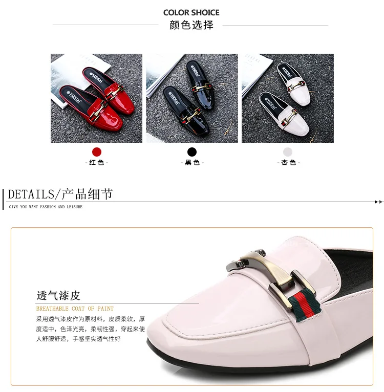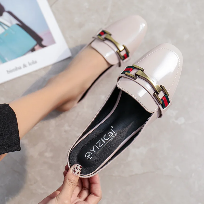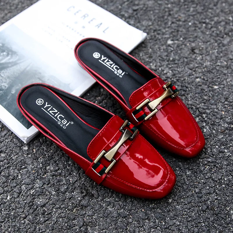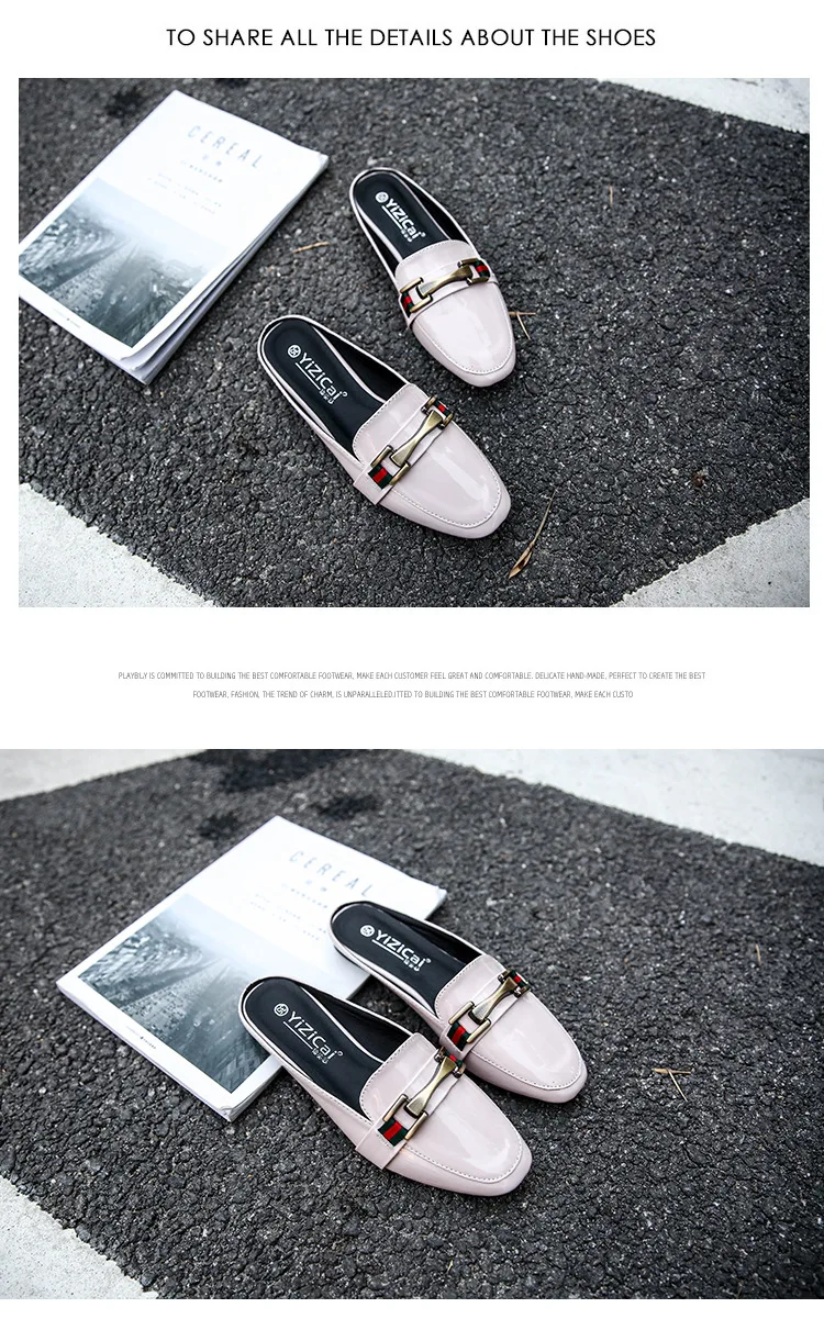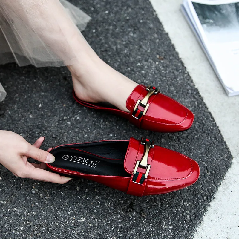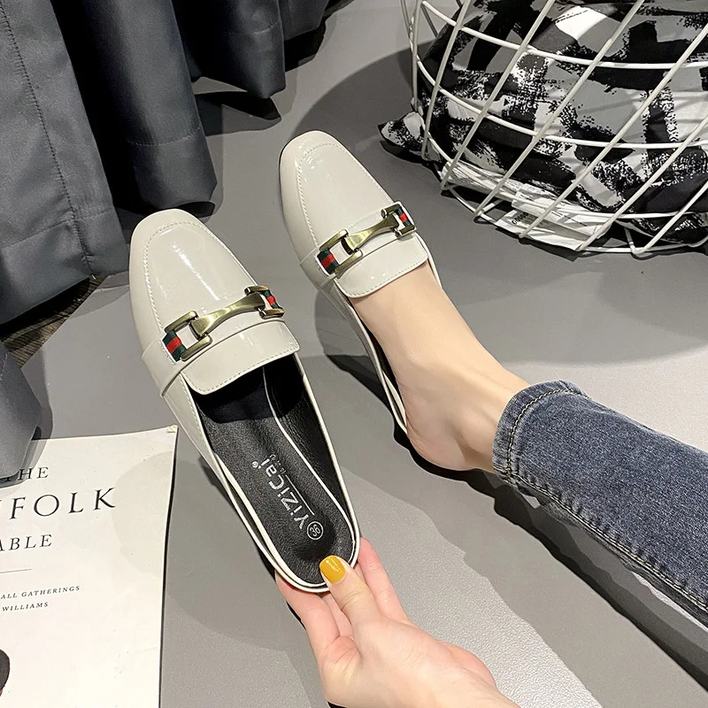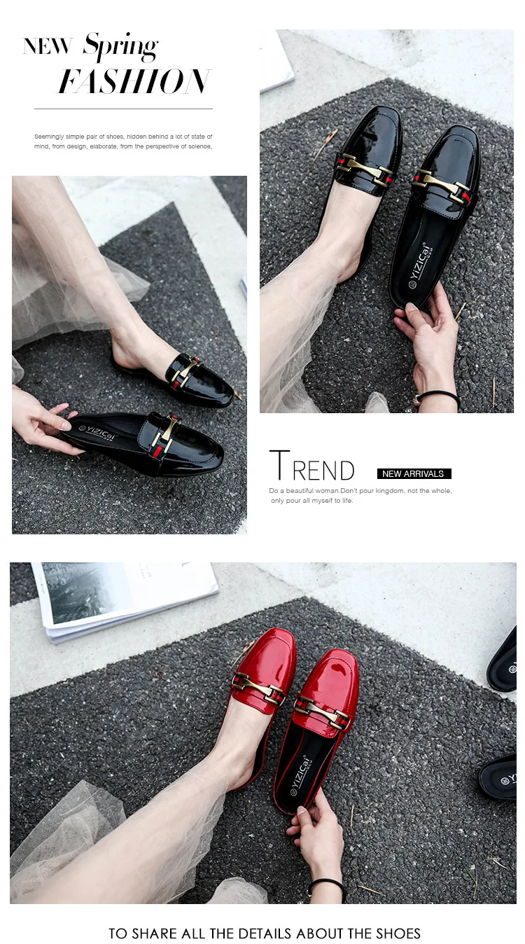 2020 Patent Leather metal buckle square toe mules woman slides women shoes sandals flip flops cover roe slippers women size34-42