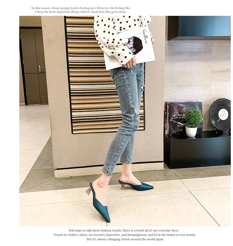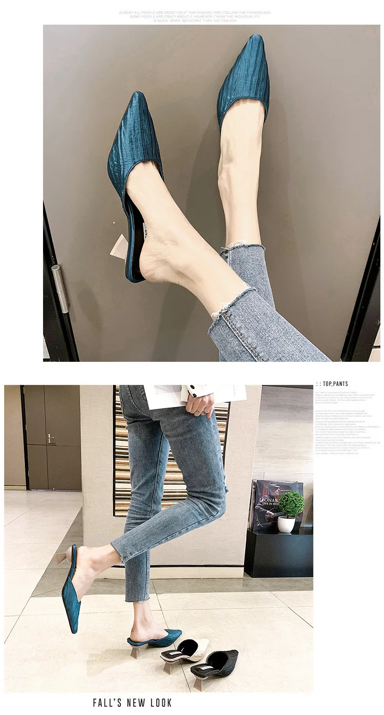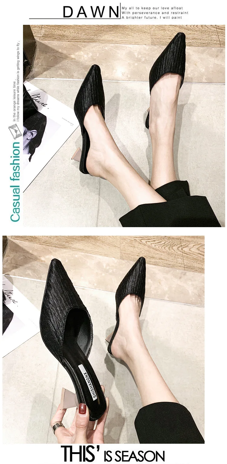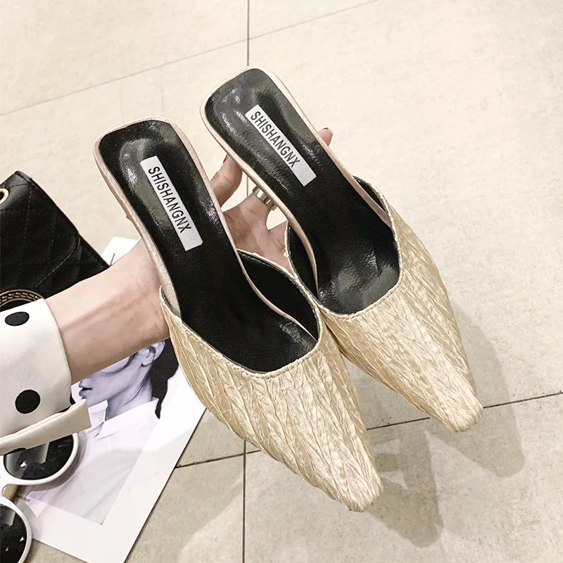 2020 Pleated Summer mules shoes woman pure elegant dress pumps korean strange high heels slippers women closed toe sandals satin