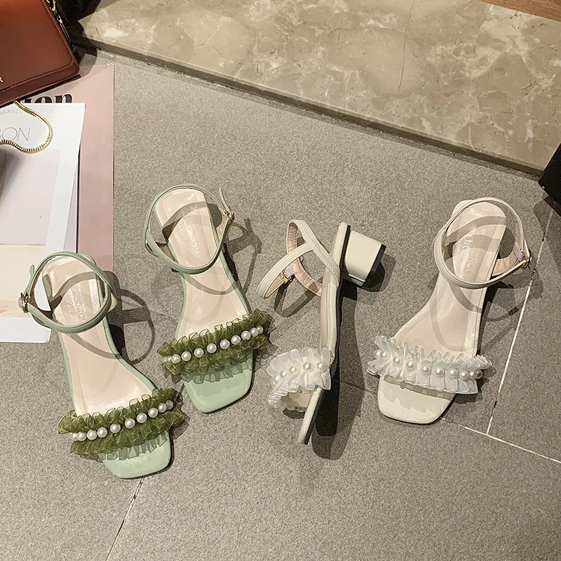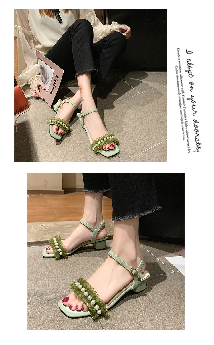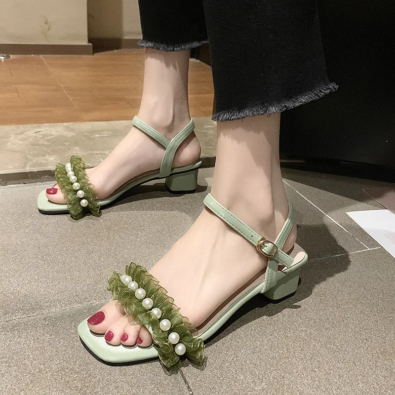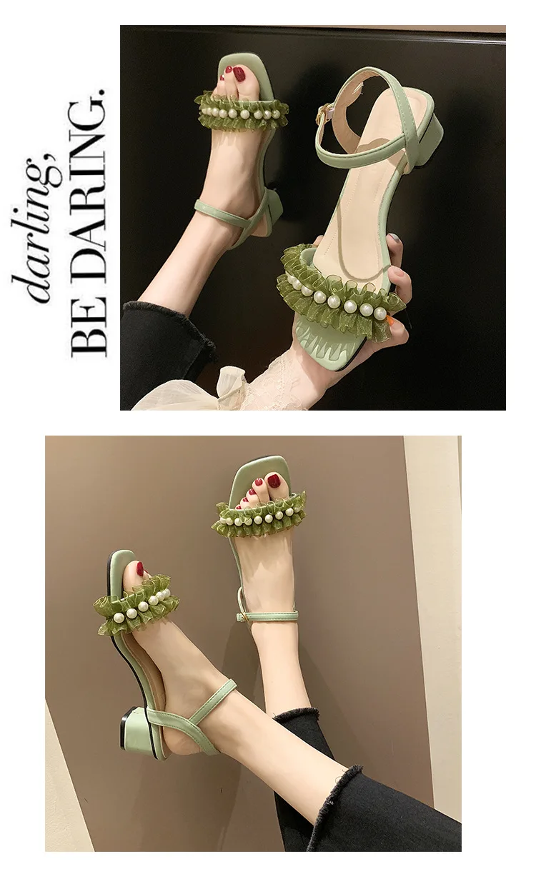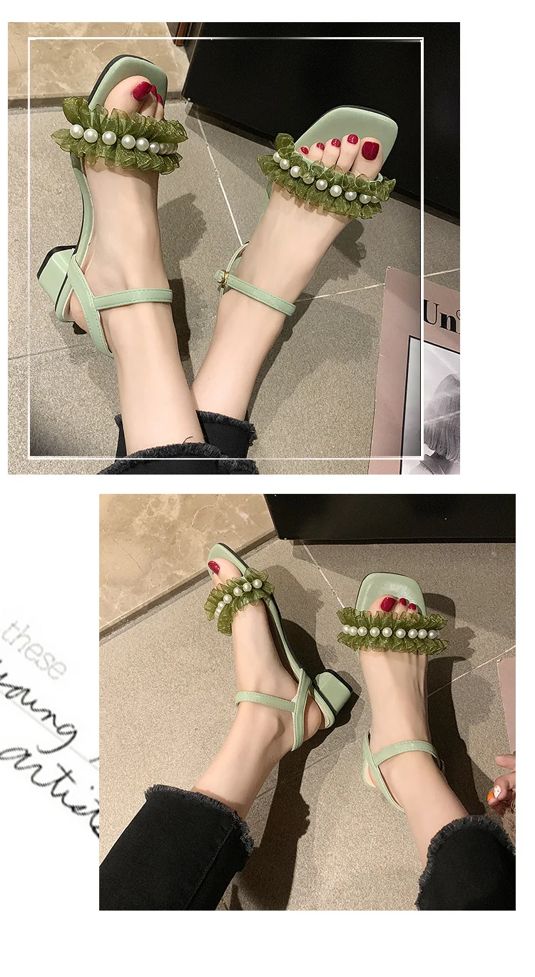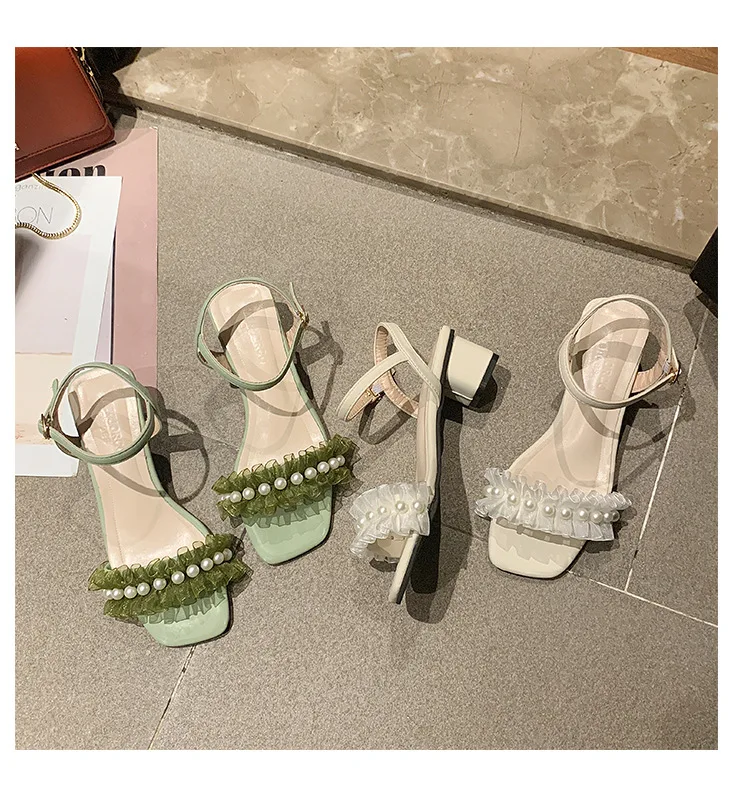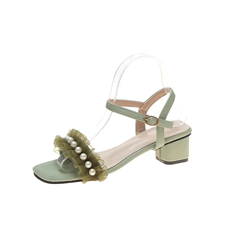 2020 summer fresh green pearl sandals women lace ruffles band gladiator sandalias mujer thick high heels dress/party shoes woman