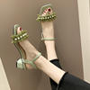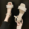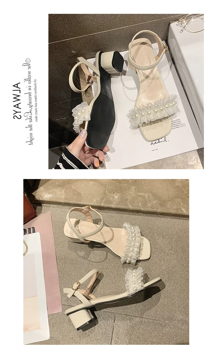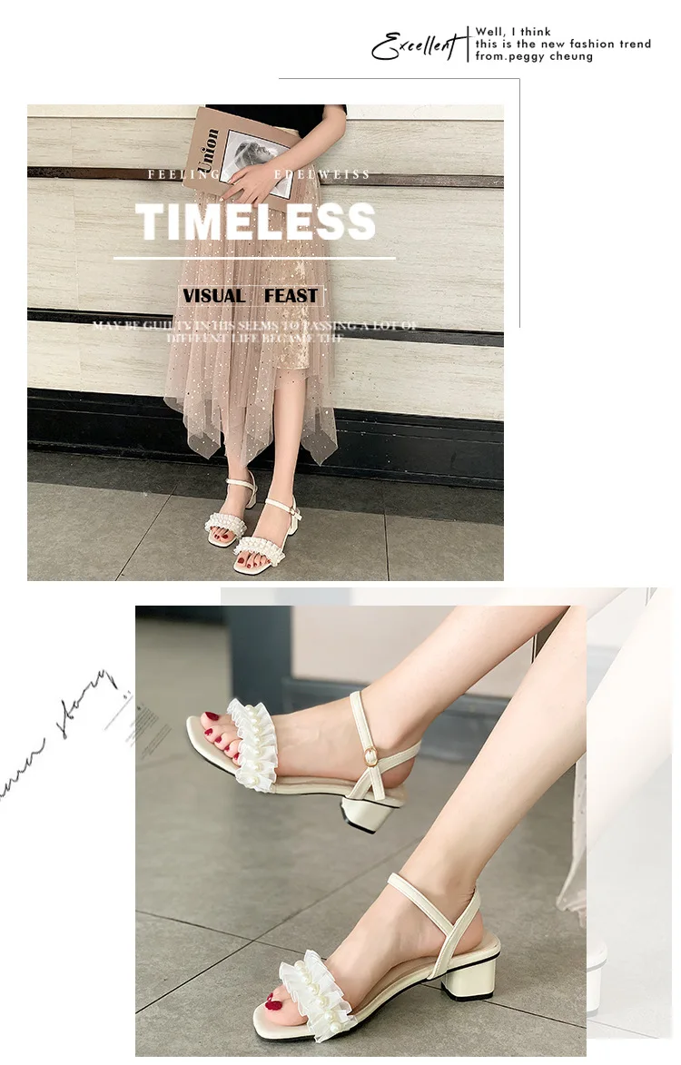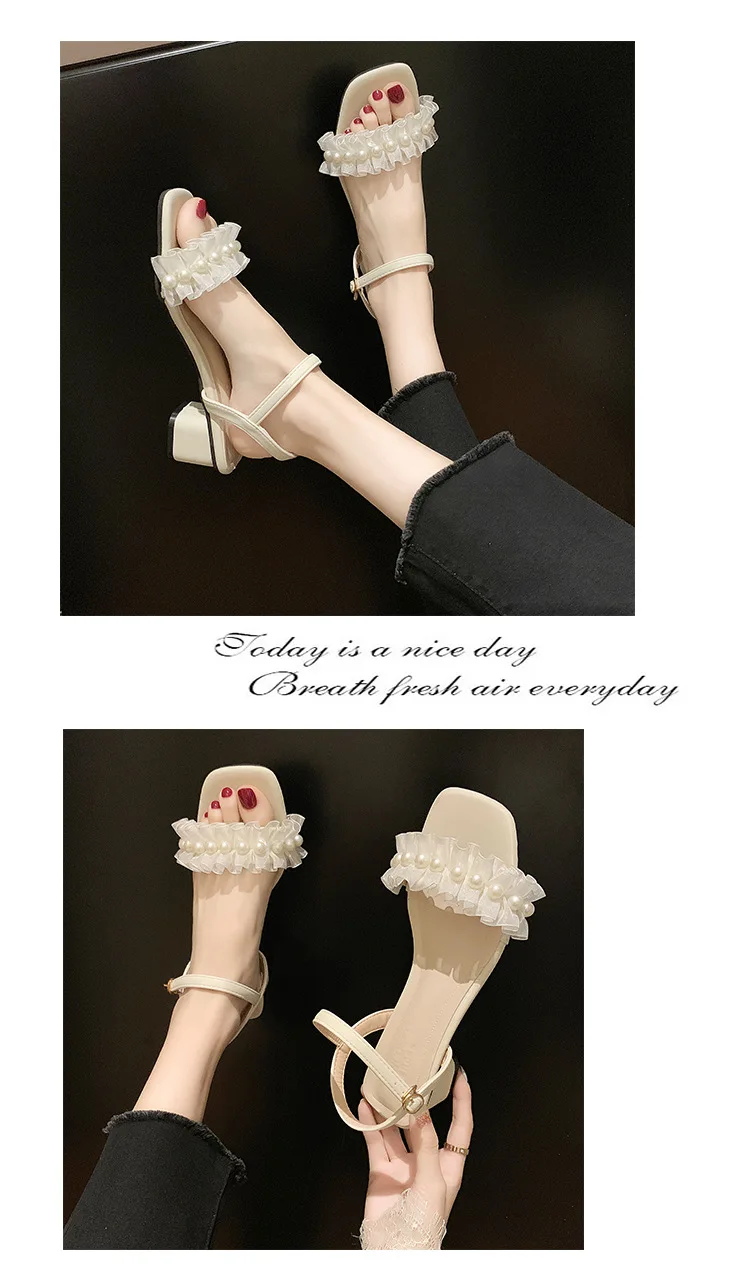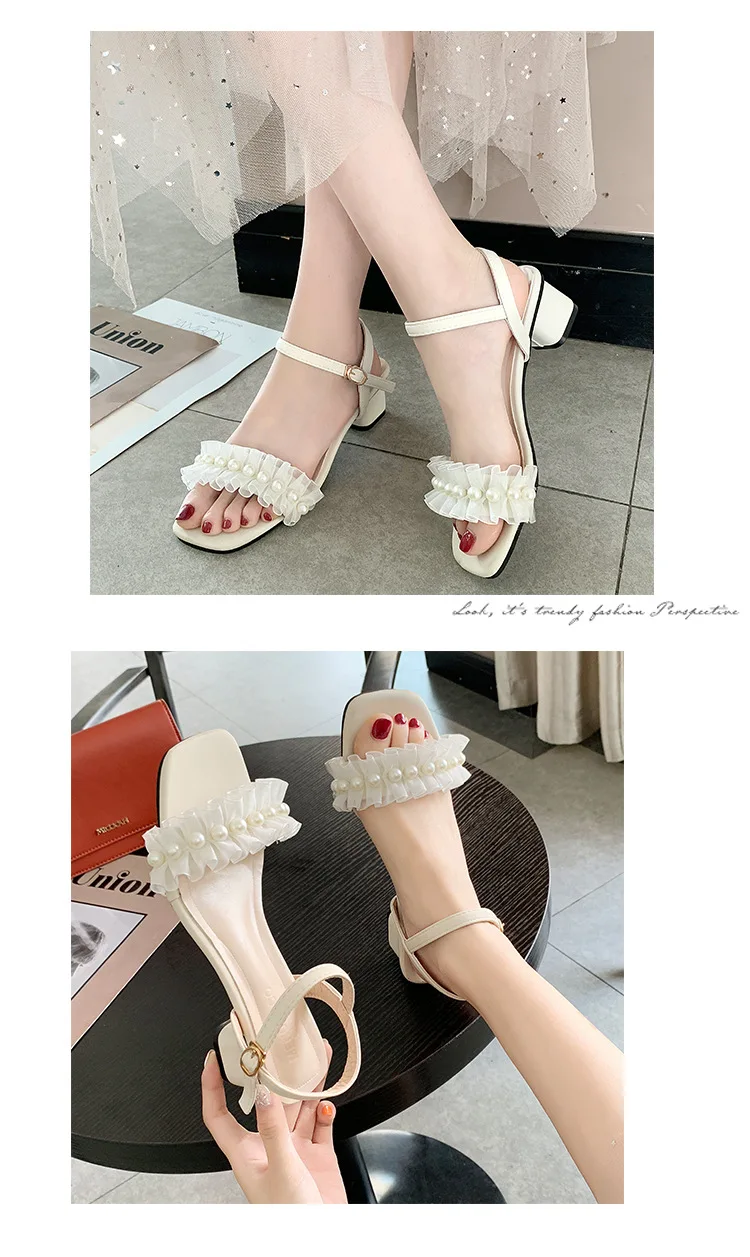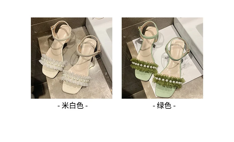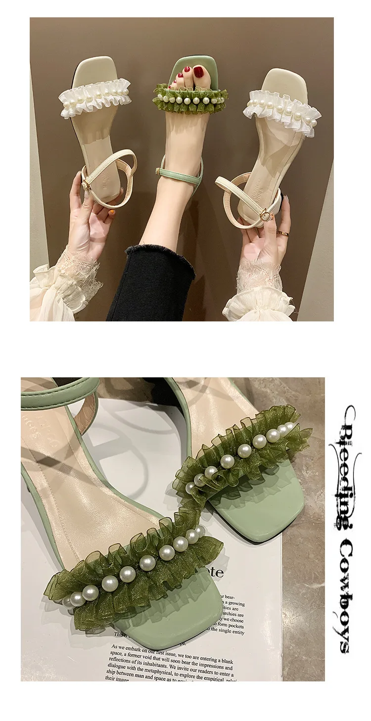 2020 summer fresh green pearl sandals women lace ruffles band gladiator sandalias mujer thick high heels dress/party shoes woman