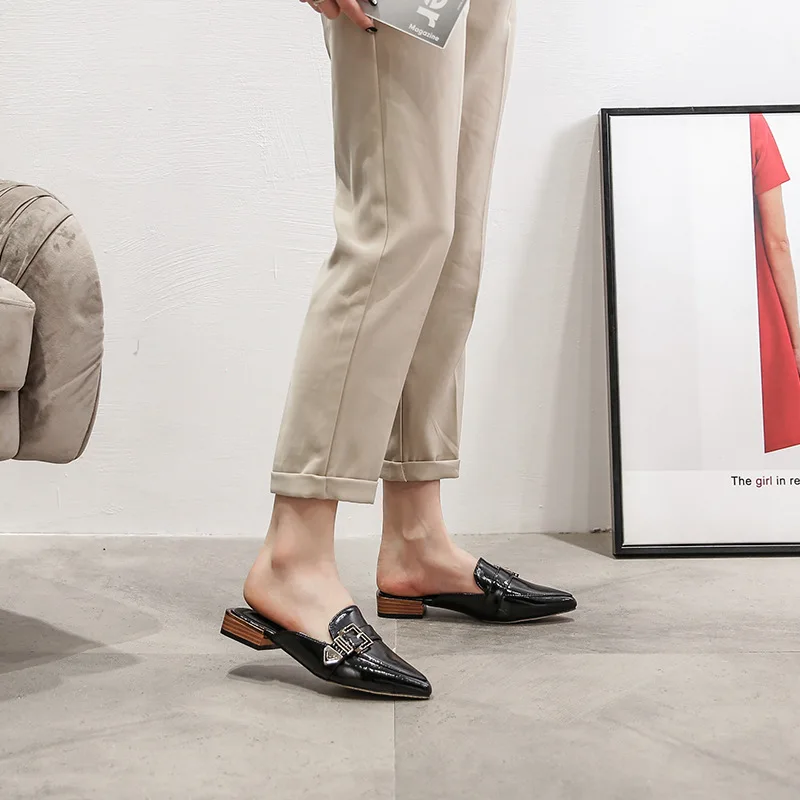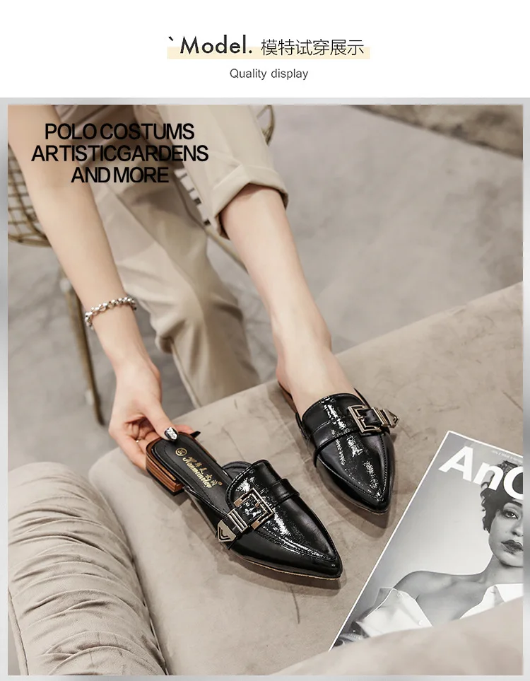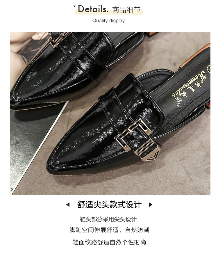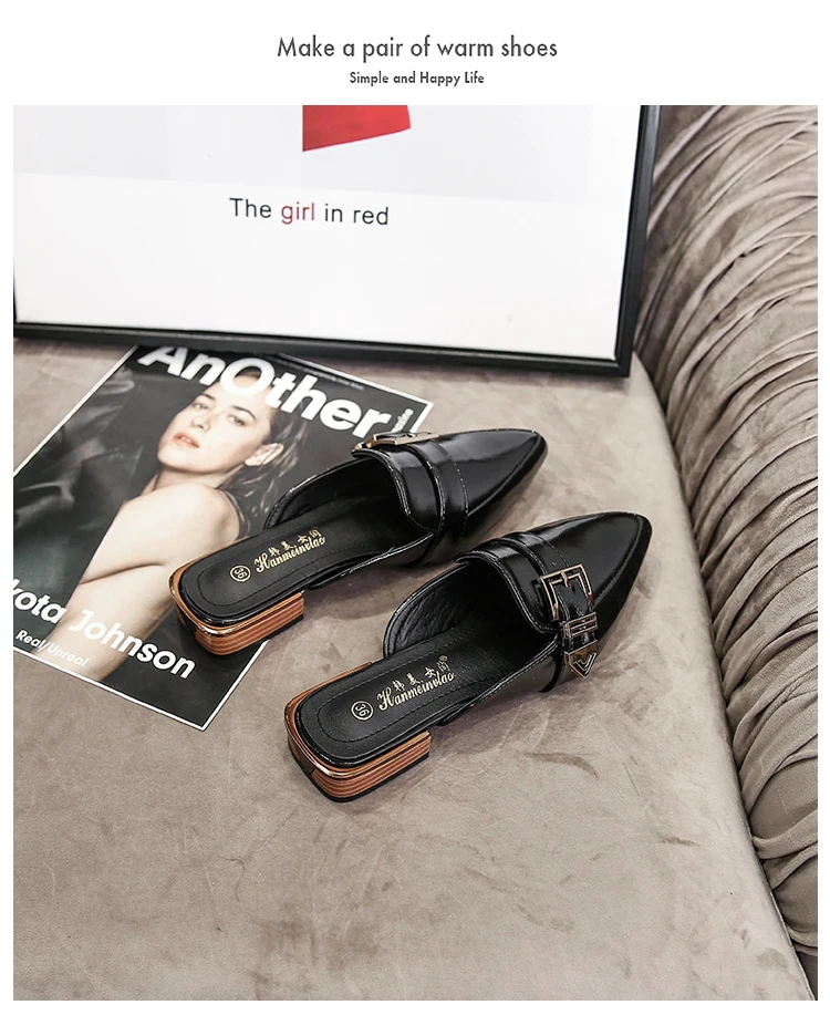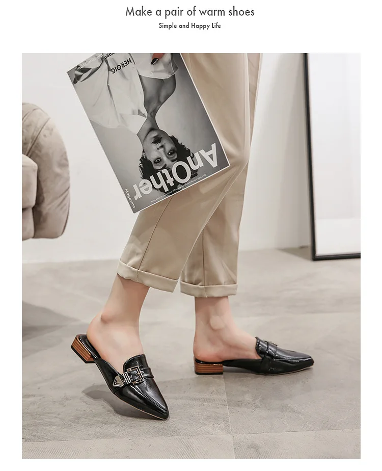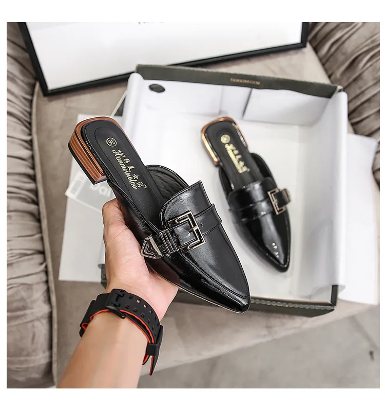 2021 Japanned Leather belt buckle mules women sandals summer shoes slides pointed toe wood heels slippers woman plus size 42/43