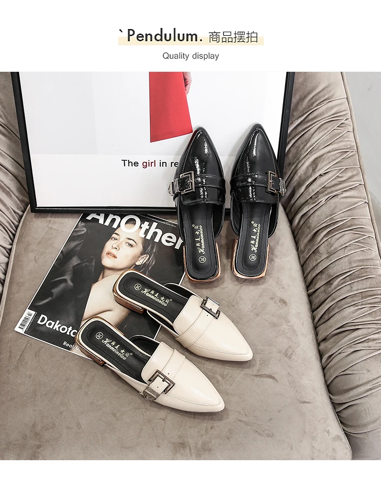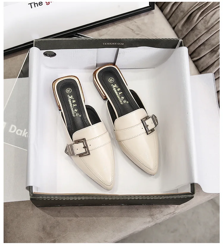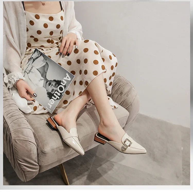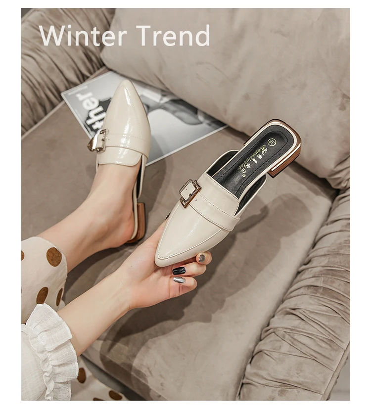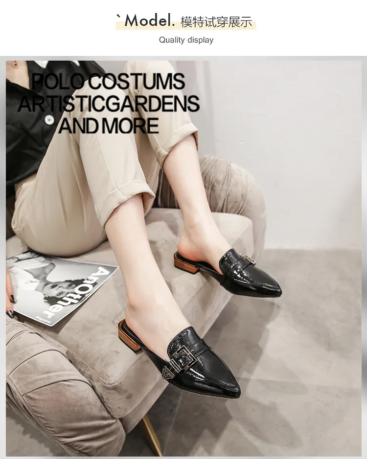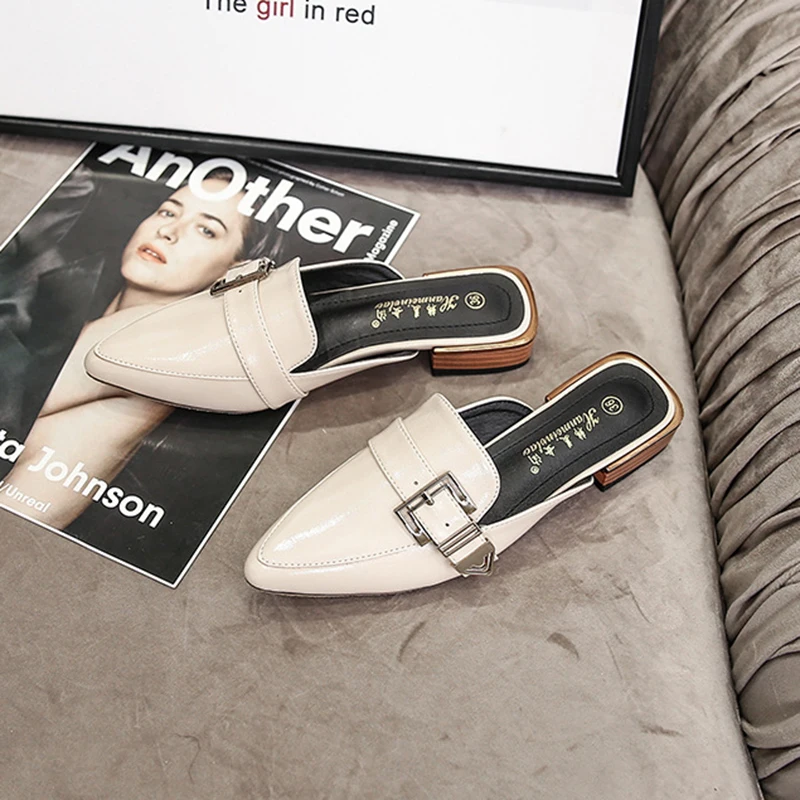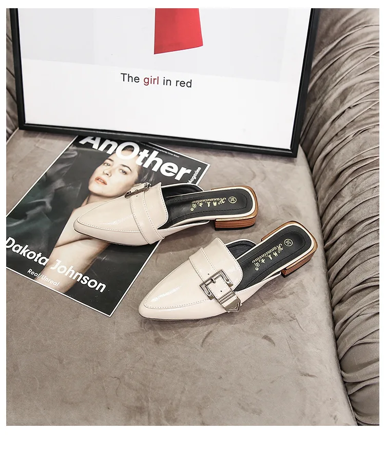 2021 Japanned Leather belt buckle mules women sandals summer shoes slides pointed toe wood heels slippers woman plus size 42/43