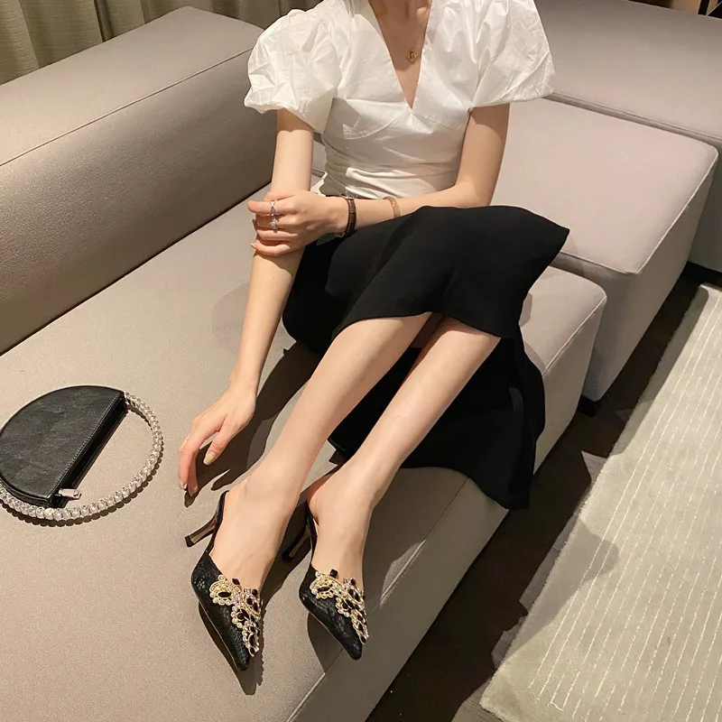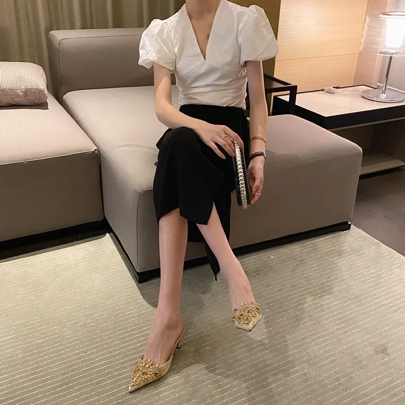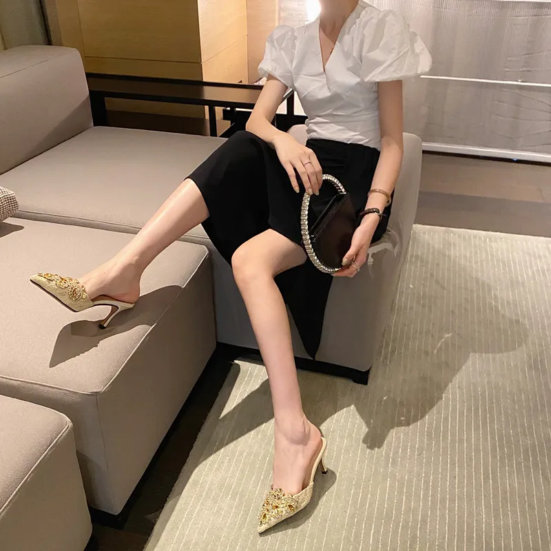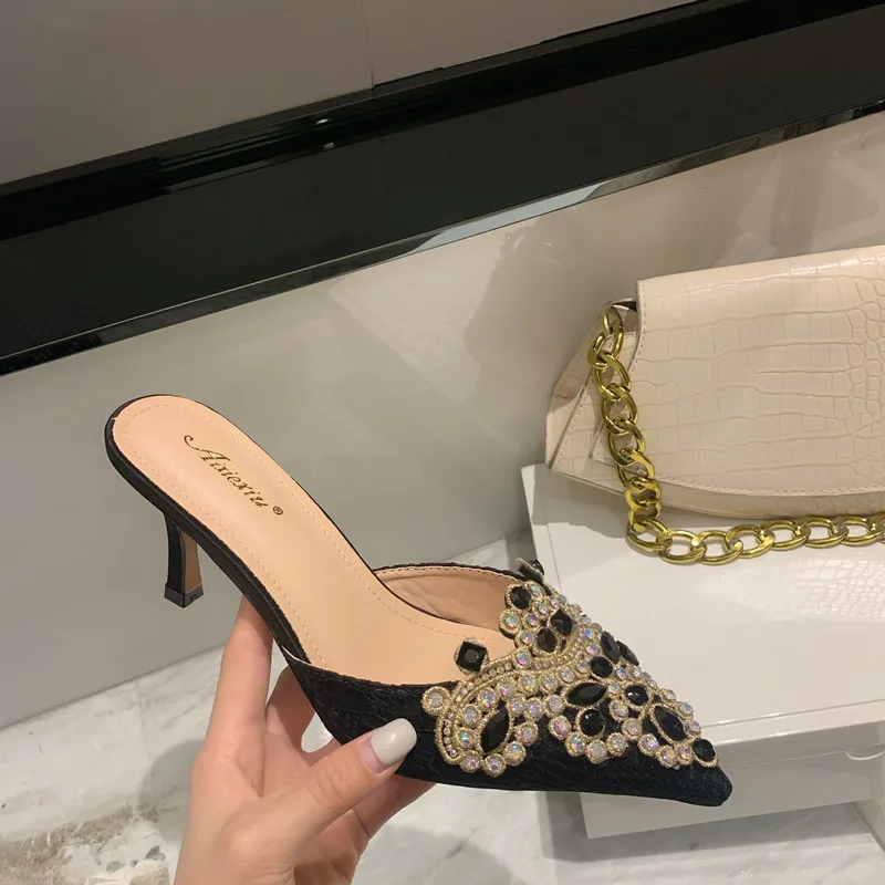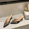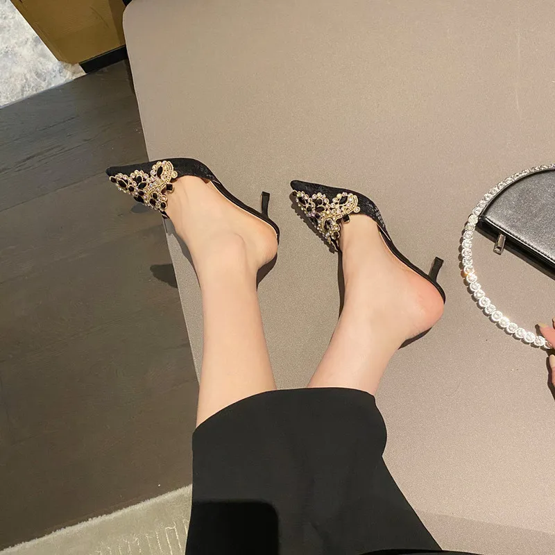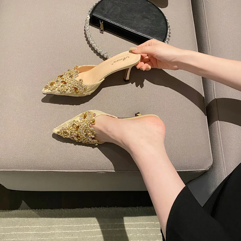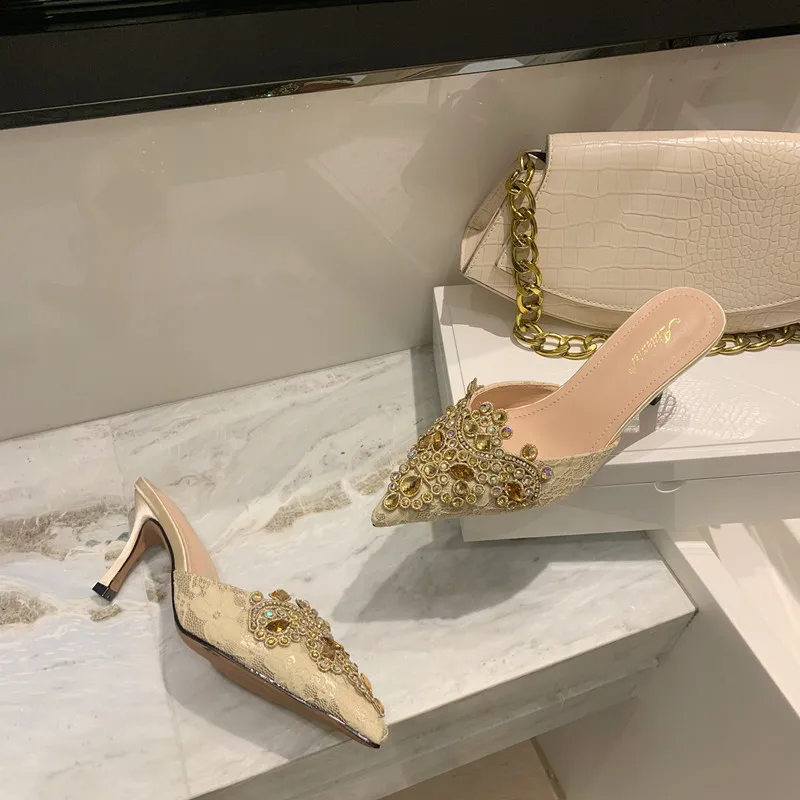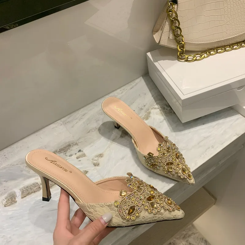 2021 Spring Women Slippers Mules Shoes Fashion Rhinestone Pointed Toe Hollow Colorful Slides Clear High Heels Sandals Slides 39
