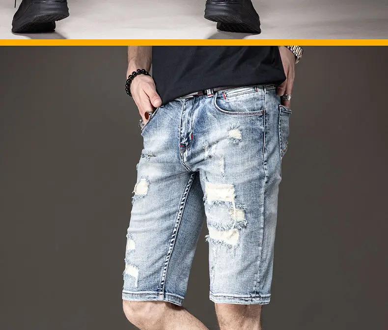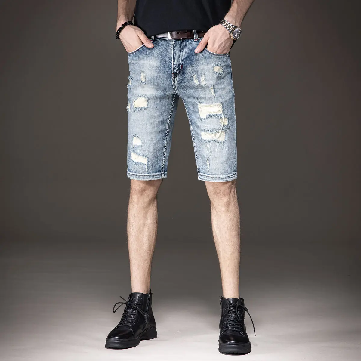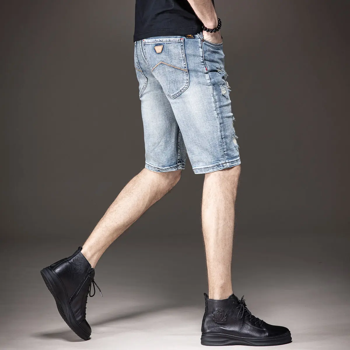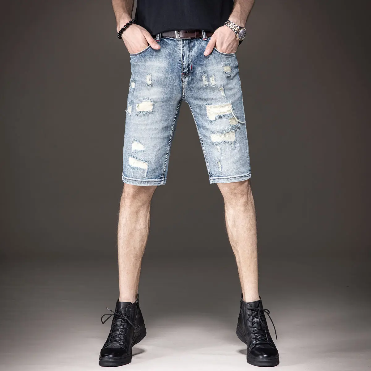 2022 summer light-colored ripped denim shorts men’s tide brand loose five-point pants men’s middle pants elastic pants men