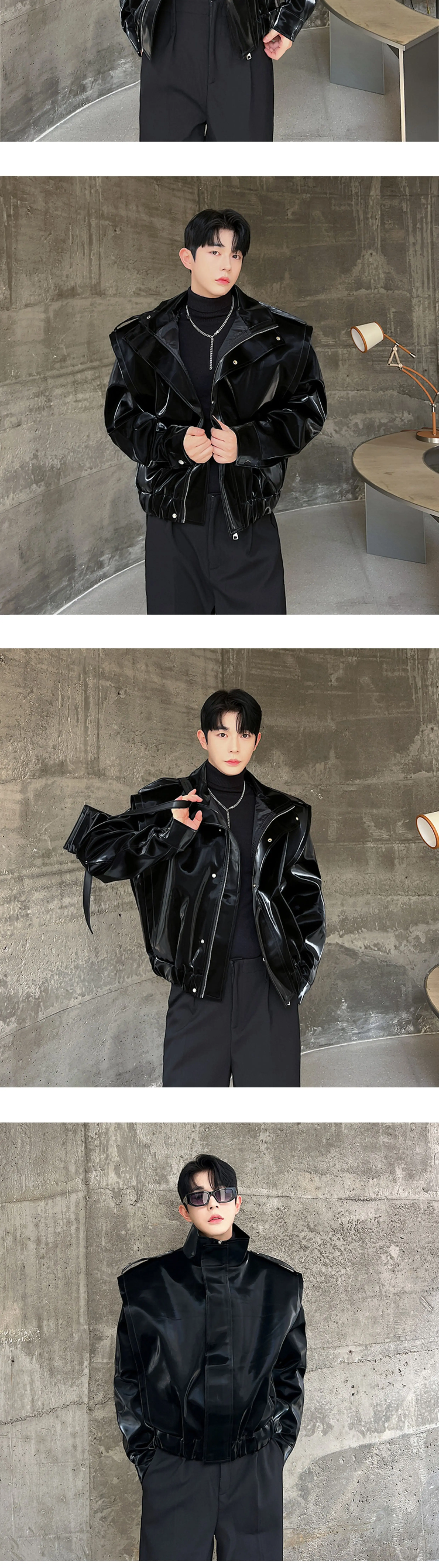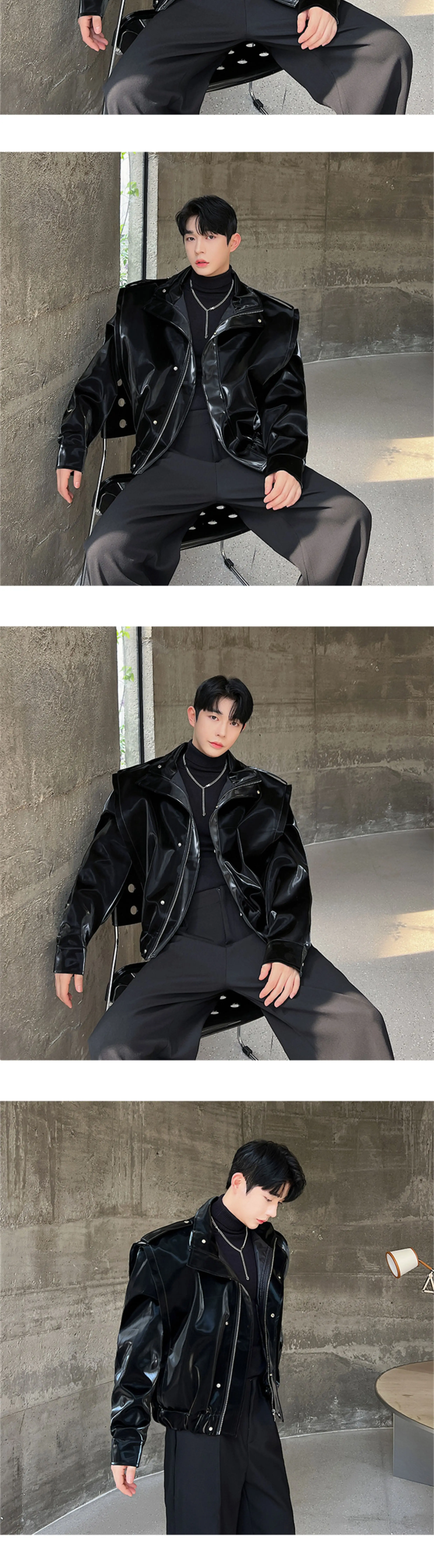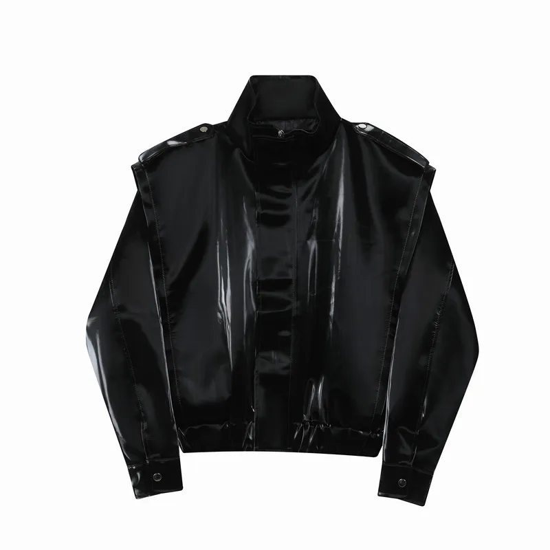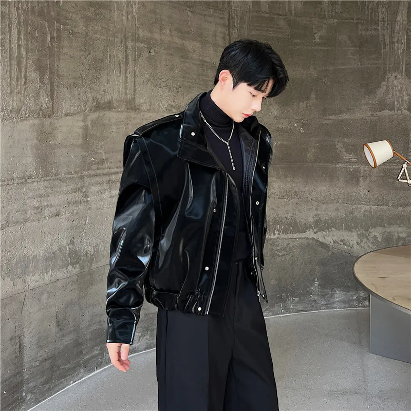 2023 Autumn Korean style unique fake two pieces design PU leather jackets for men casual loose Glossy PU jackets men,M-XL