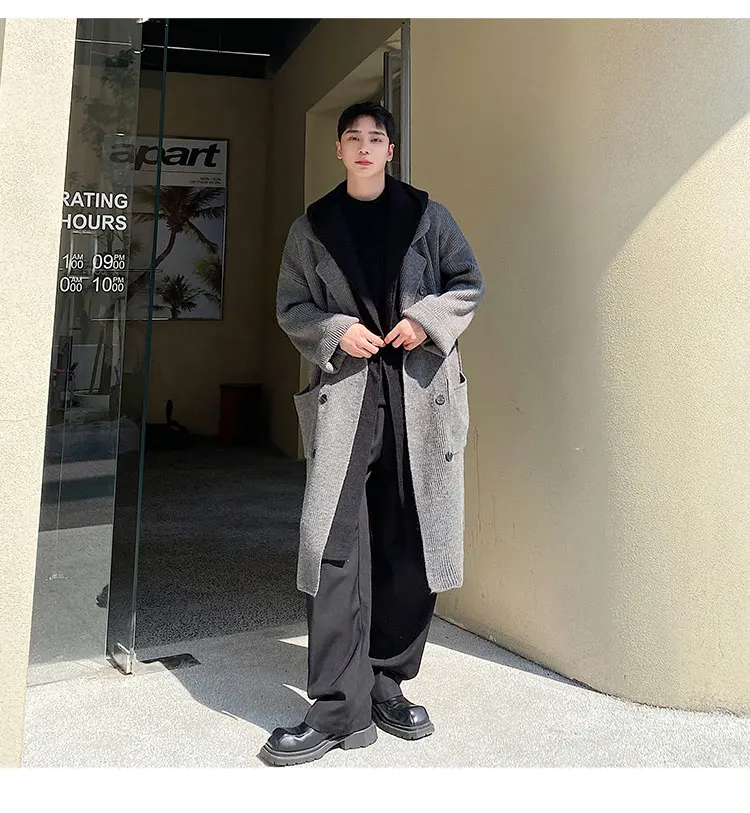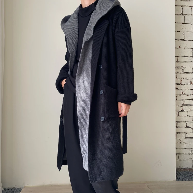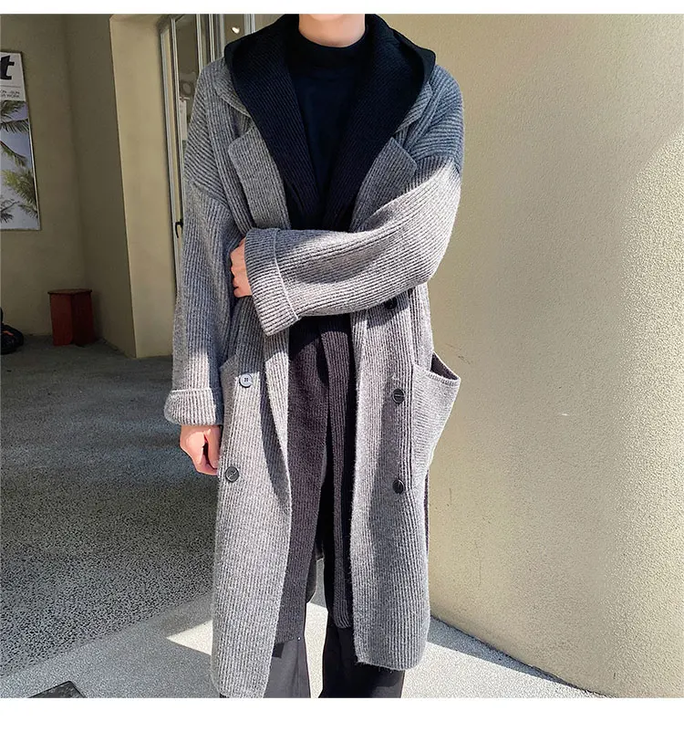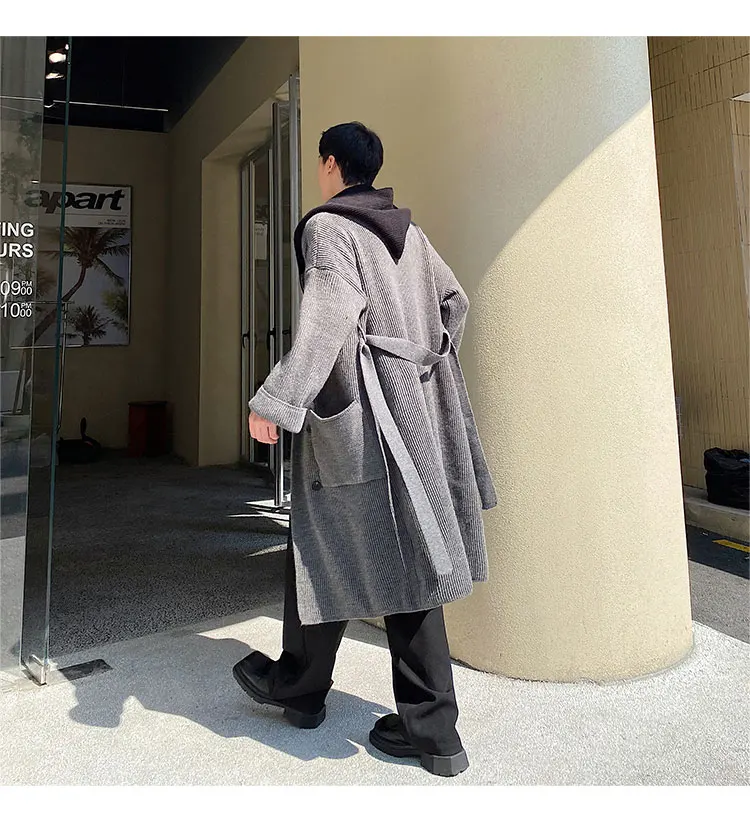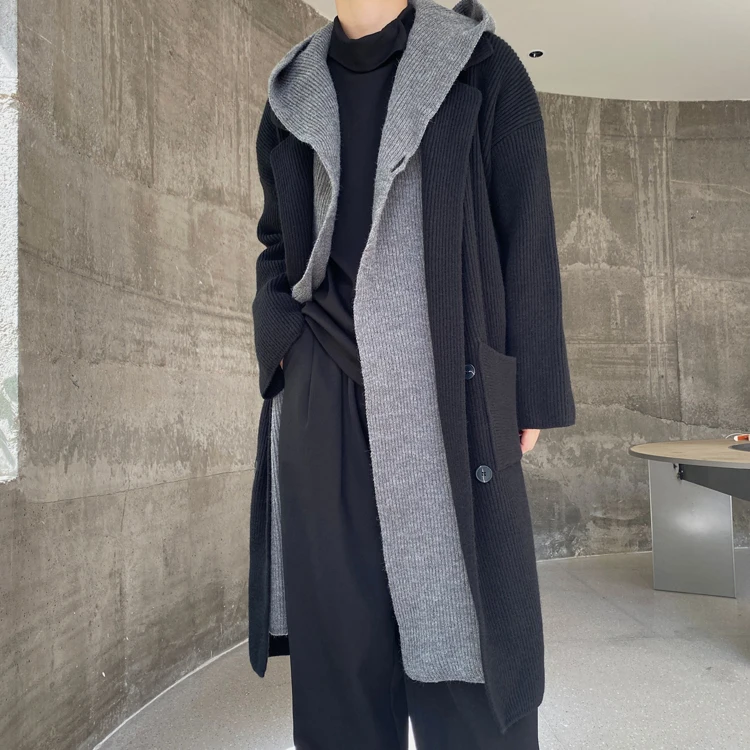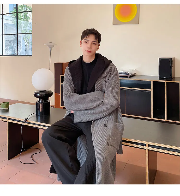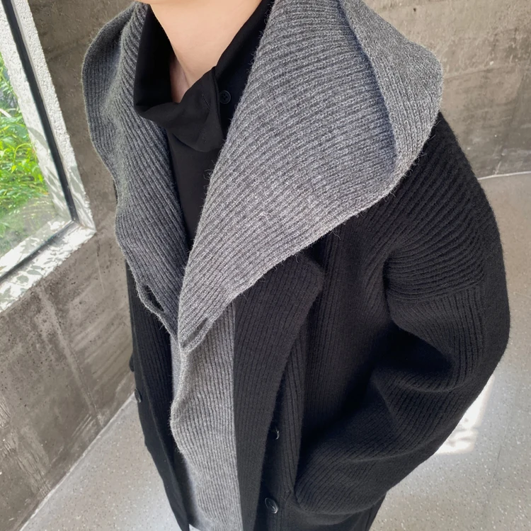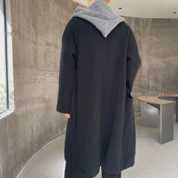 2023 Autumn mixed color unique Fake two-piece design Cardigan men casual loose long style thickened hooded knitting Cardigan