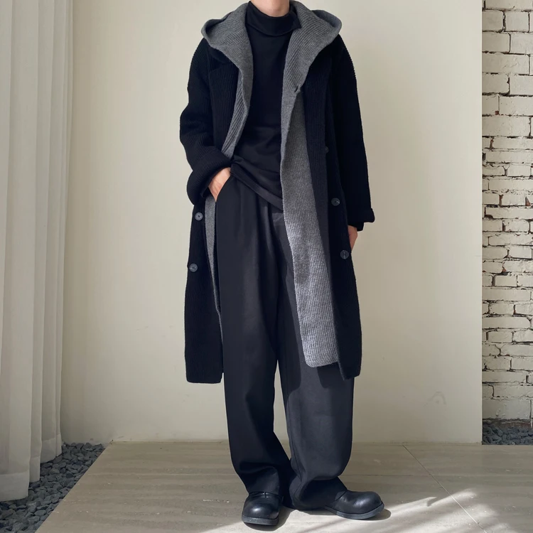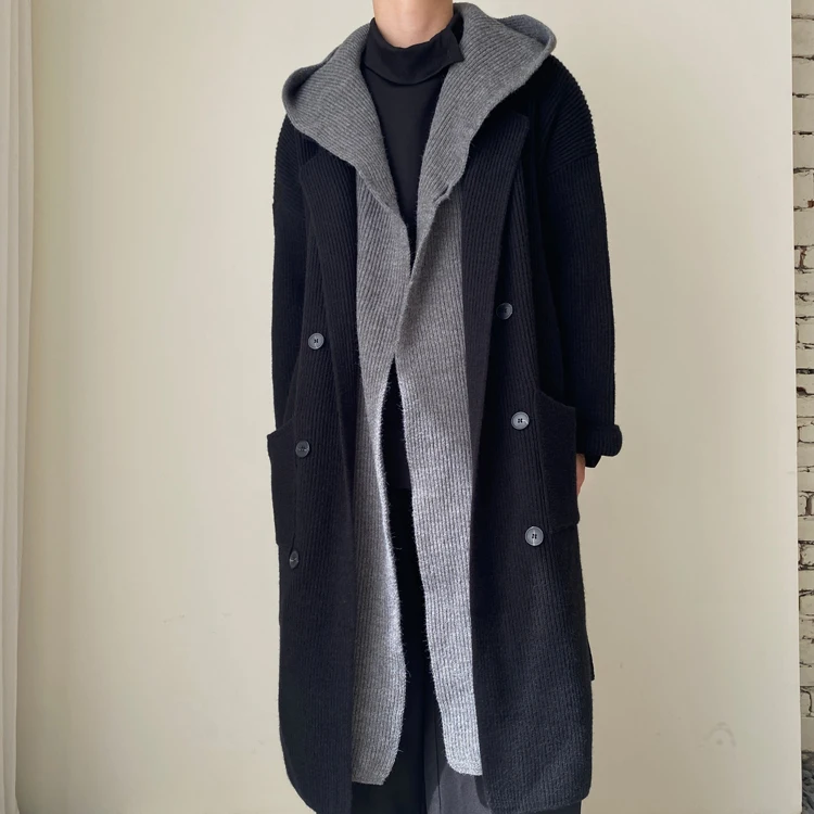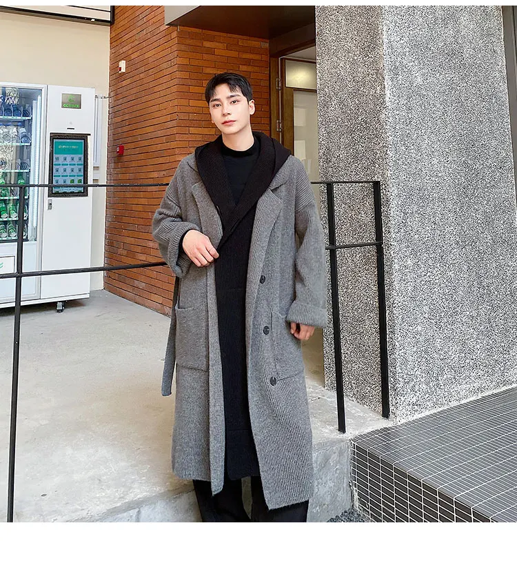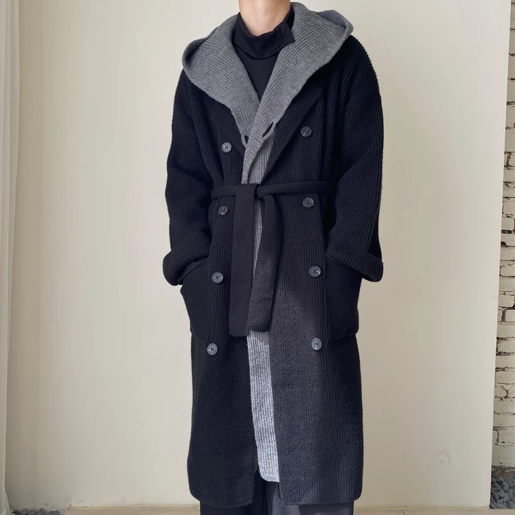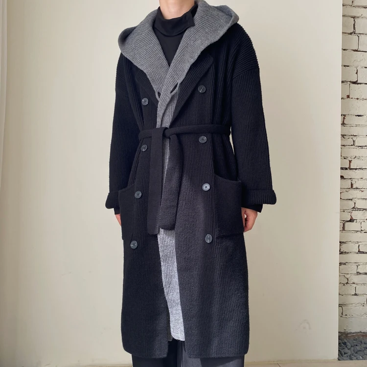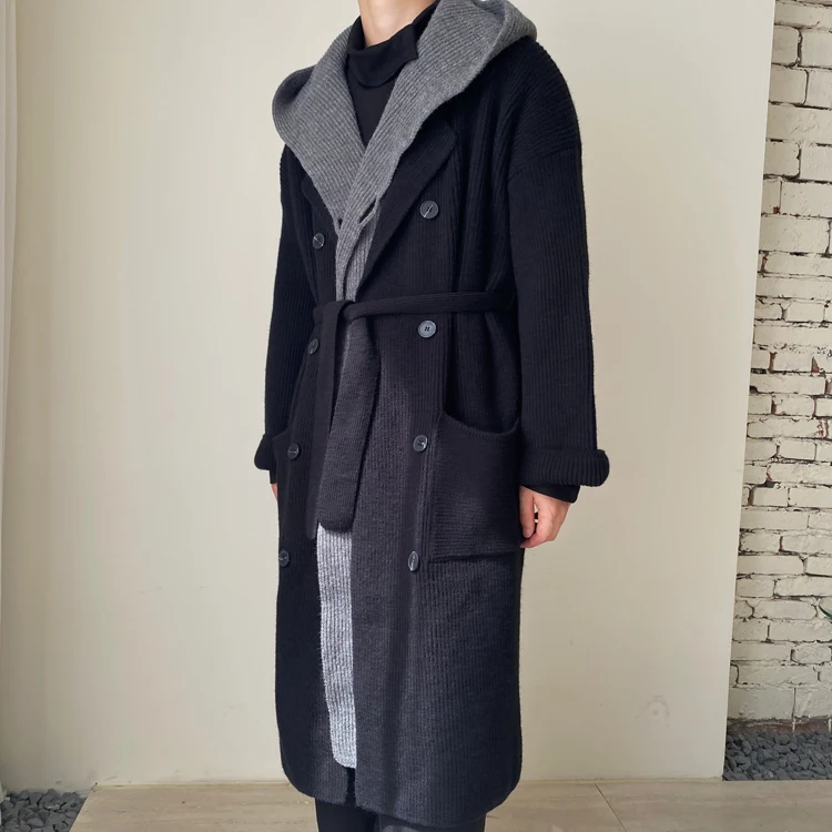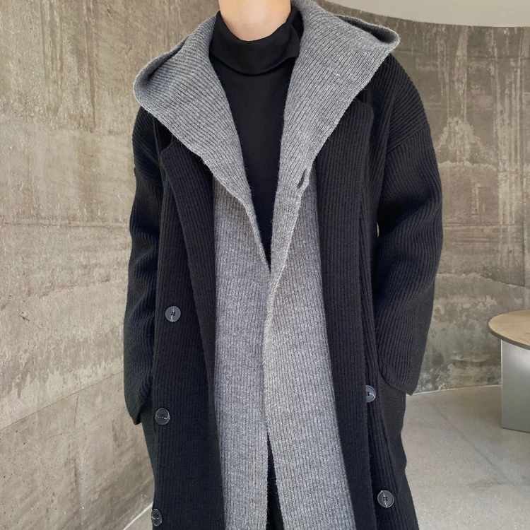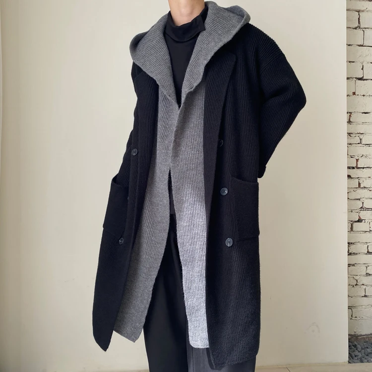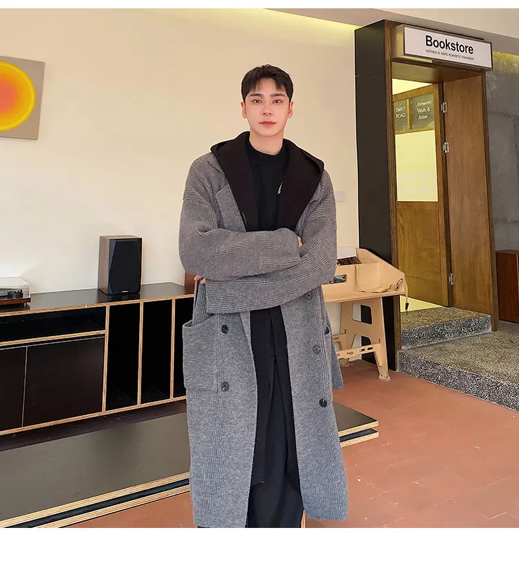 2023 Autumn mixed color unique Fake two-piece design Cardigan men casual loose long style thickened hooded knitting Cardigan