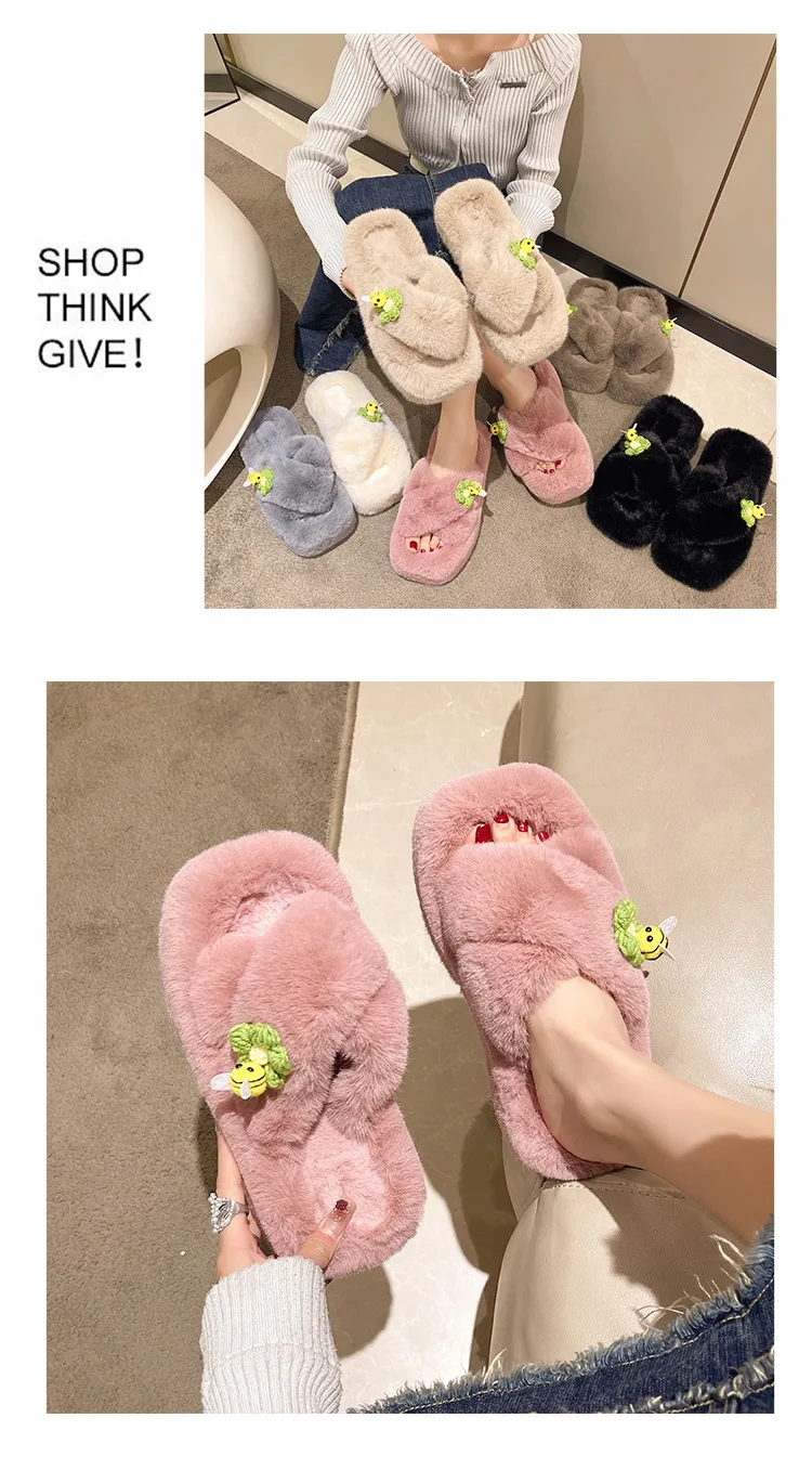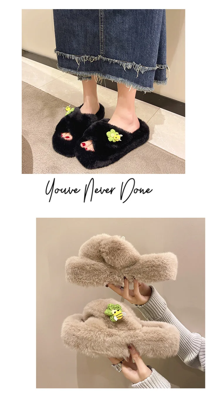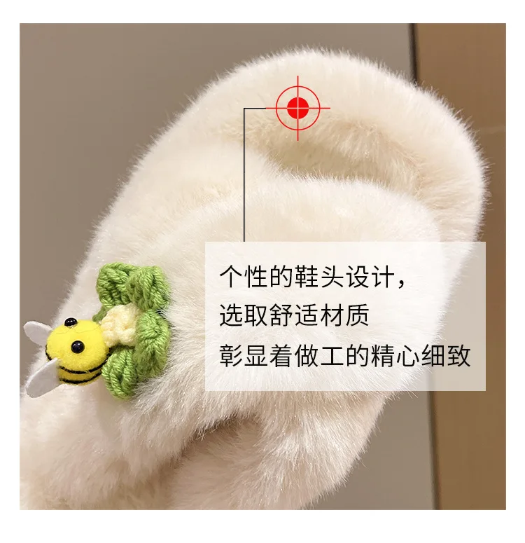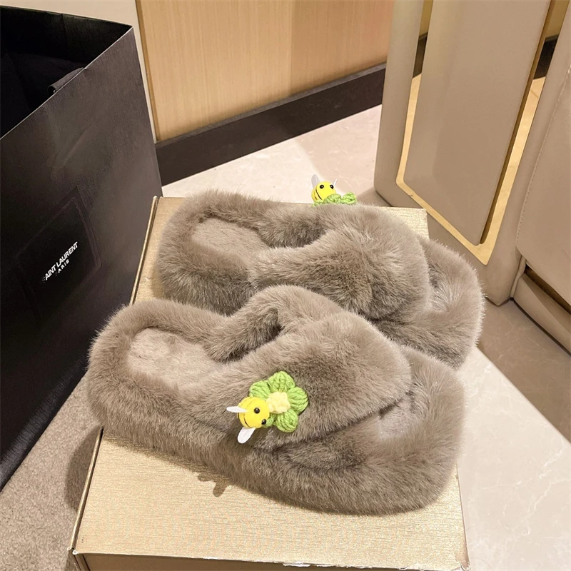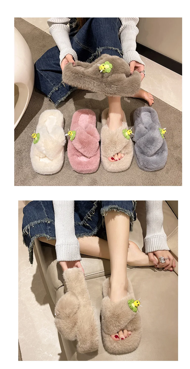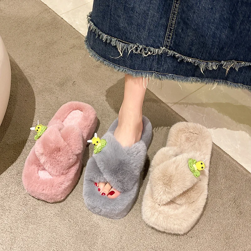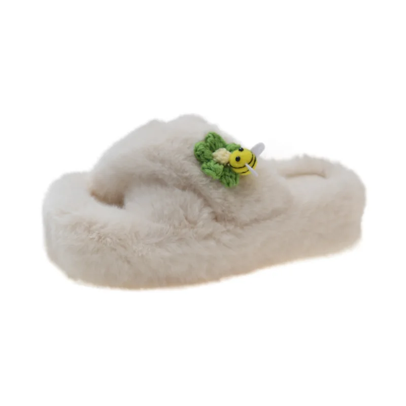 2023 Autumn/Winter New Cute Cartoon Bee Square Head Thick Bottom 5cm Cross Lining Plush Slippers for Women