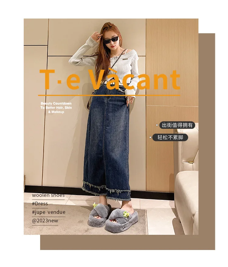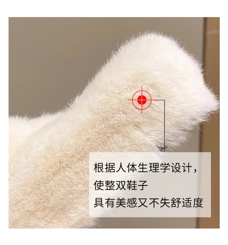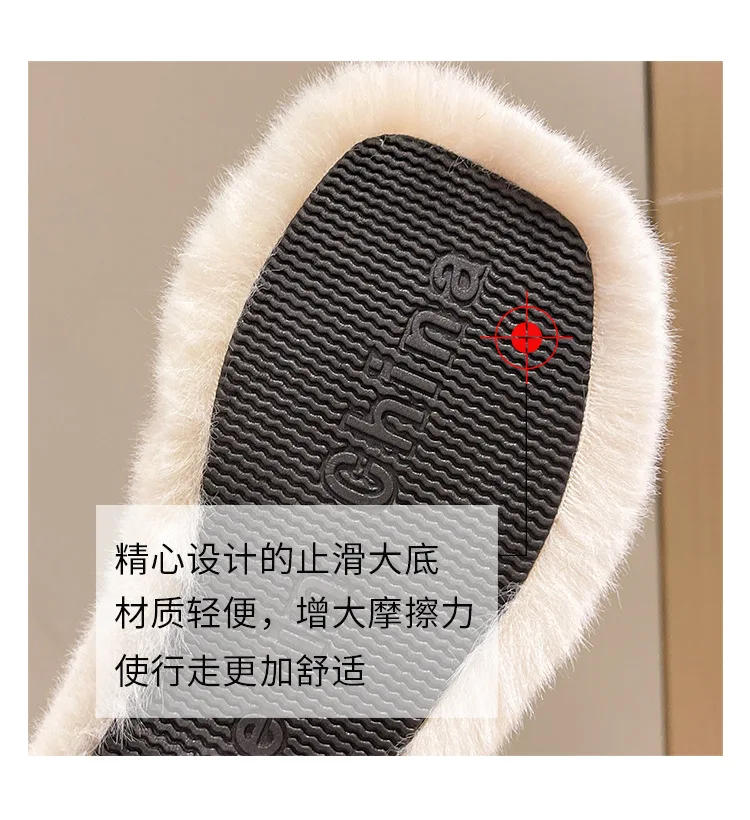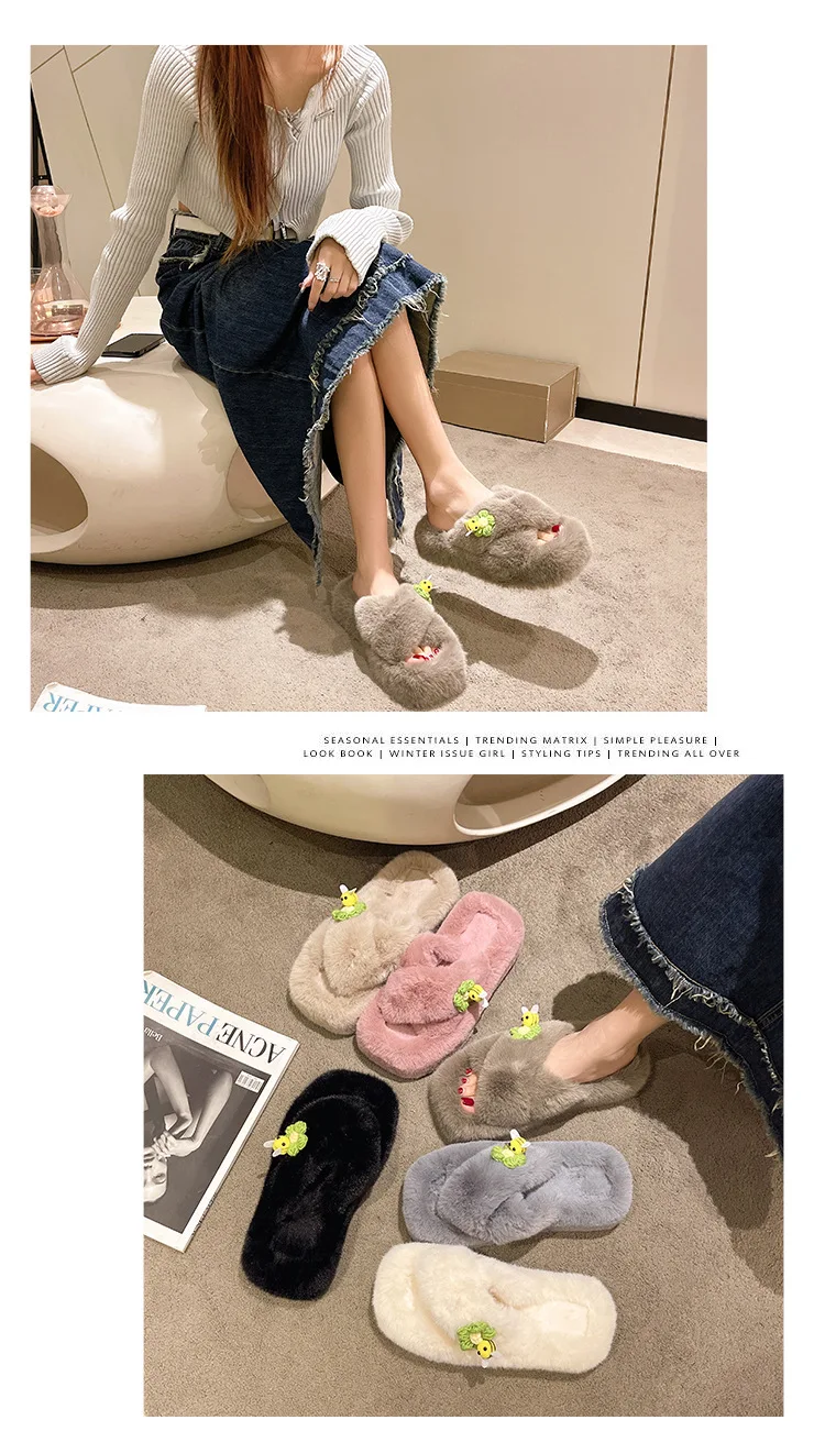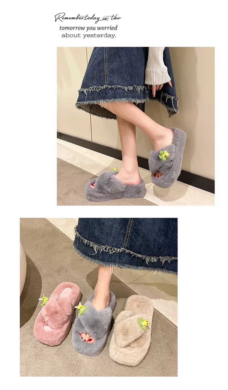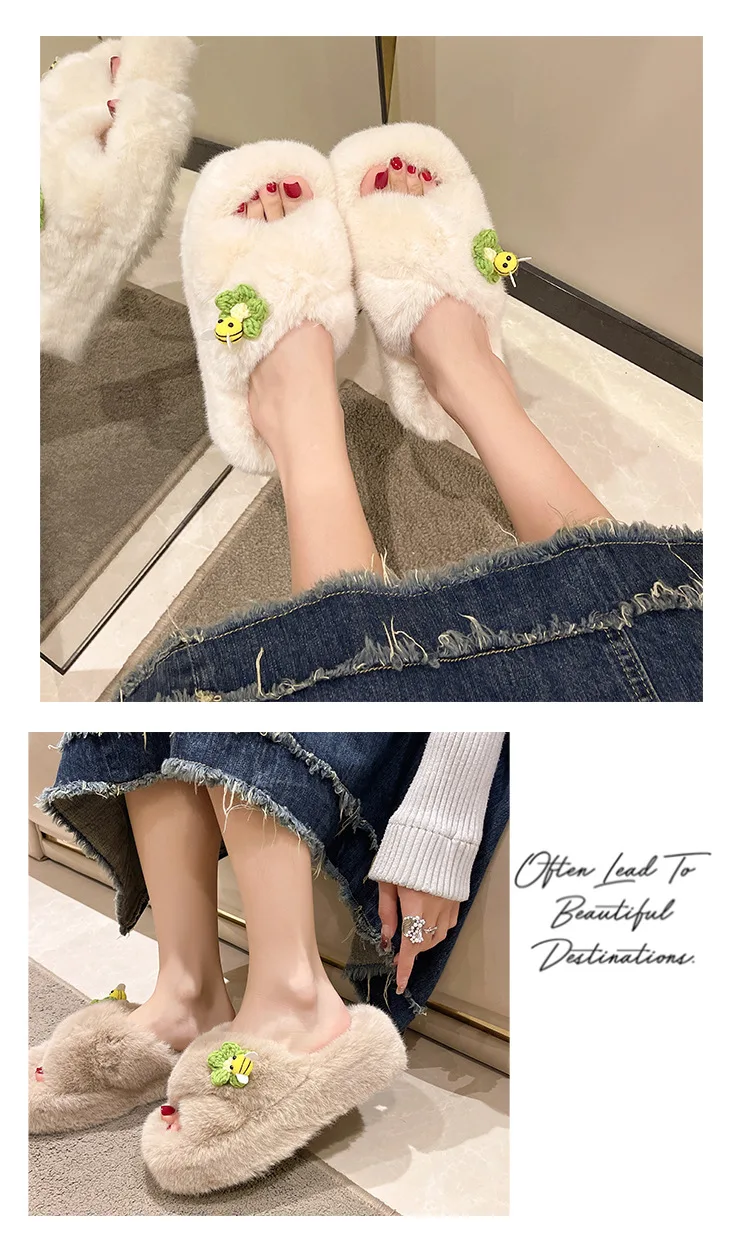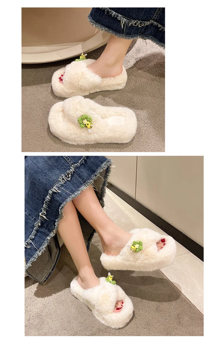 2023 Autumn/Winter New Cute Cartoon Bee Square Head Thick Bottom 5cm Cross Lining Plush Slippers for Women