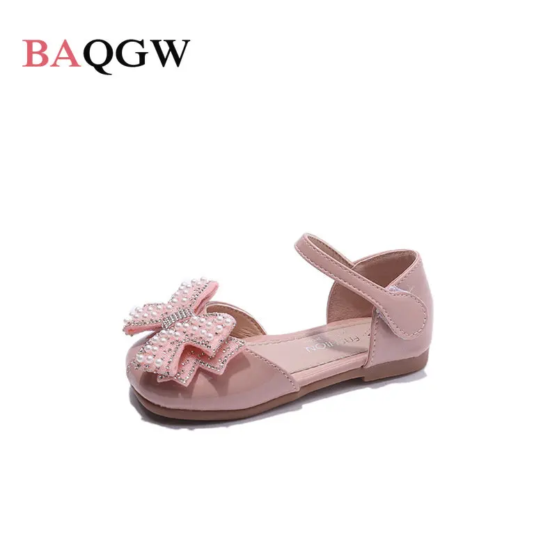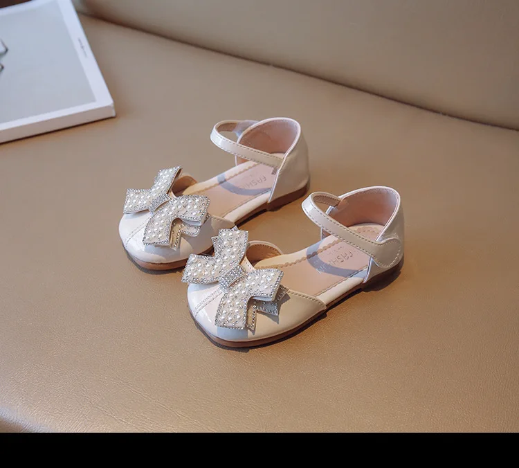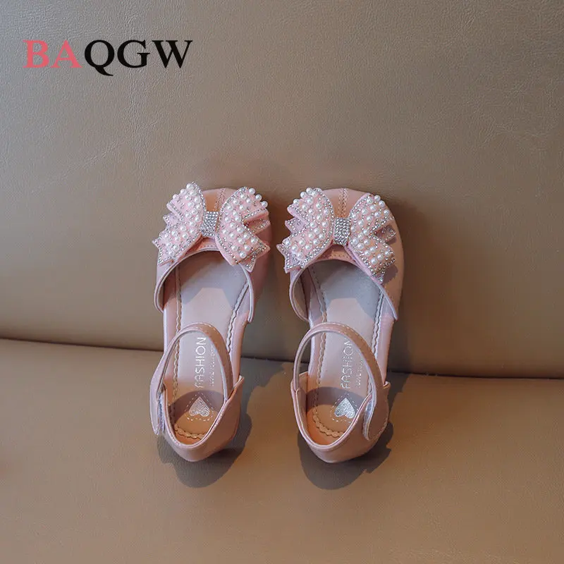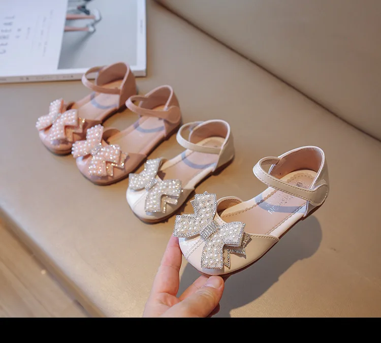 2023 Summer Kids Girl Cute Sandals Princess Pearl Bowknot Fashion Children’s Girl Shoes Hook&loop Round Toe Lightweight Slides