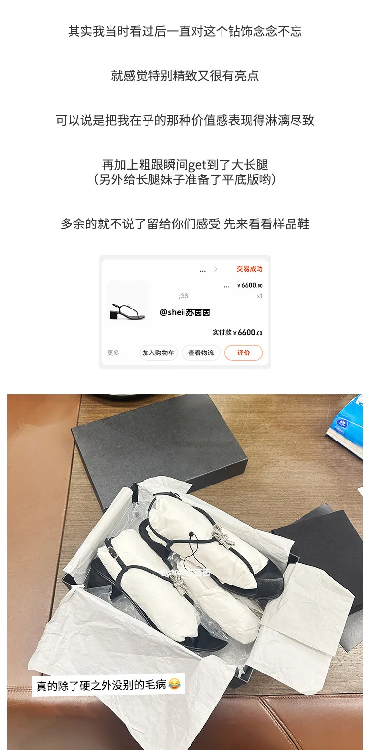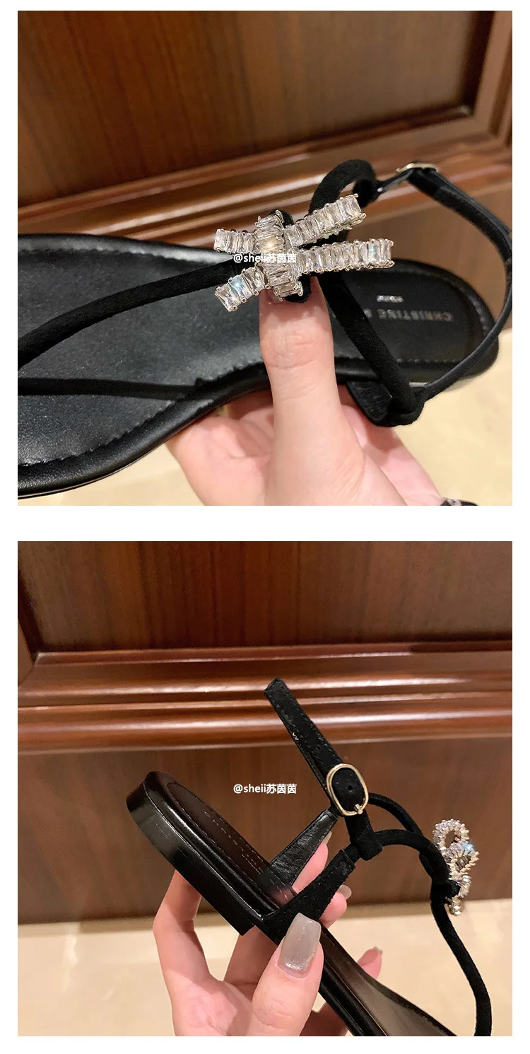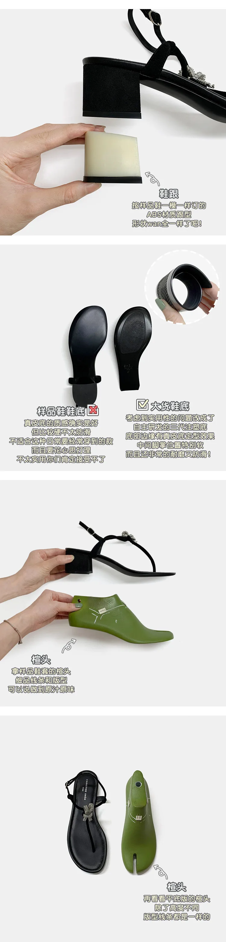 2023 Summer New Sparkling Star River T Belt Rhinestone Buckle Real Leather Clip Toe Thick Heel Sandals for Women
