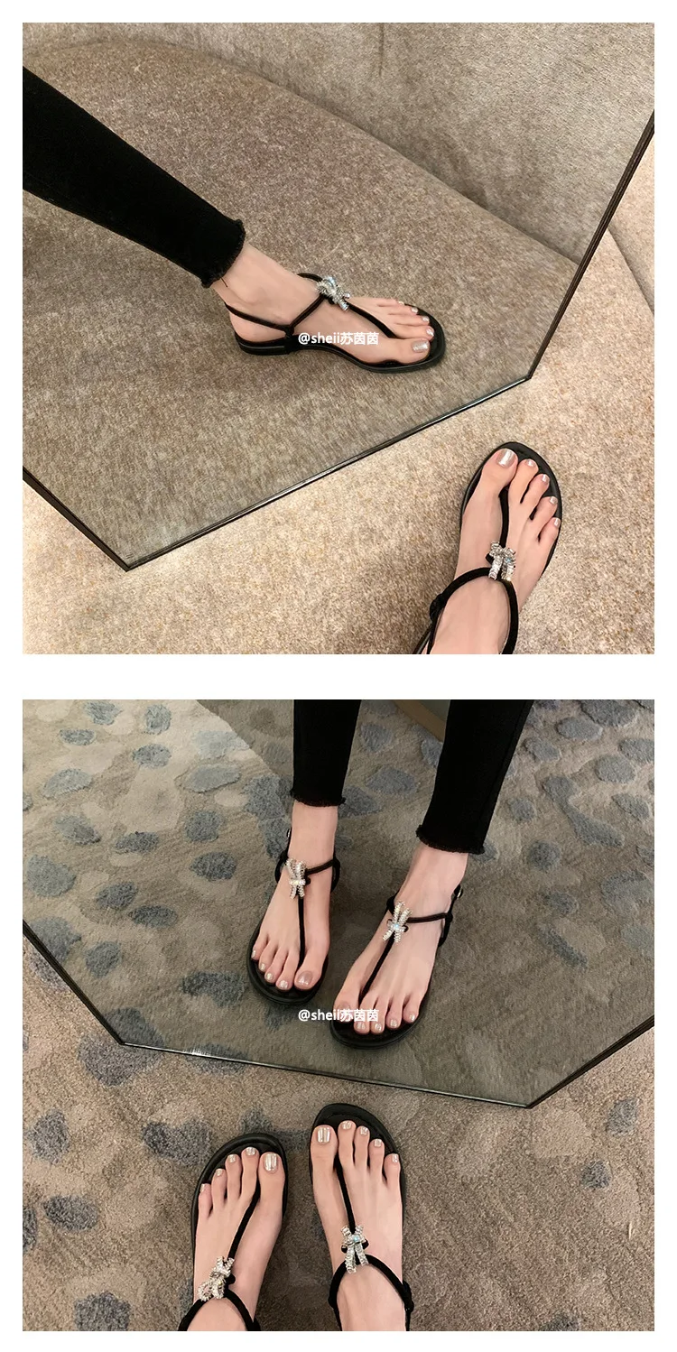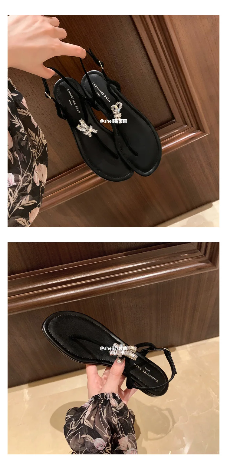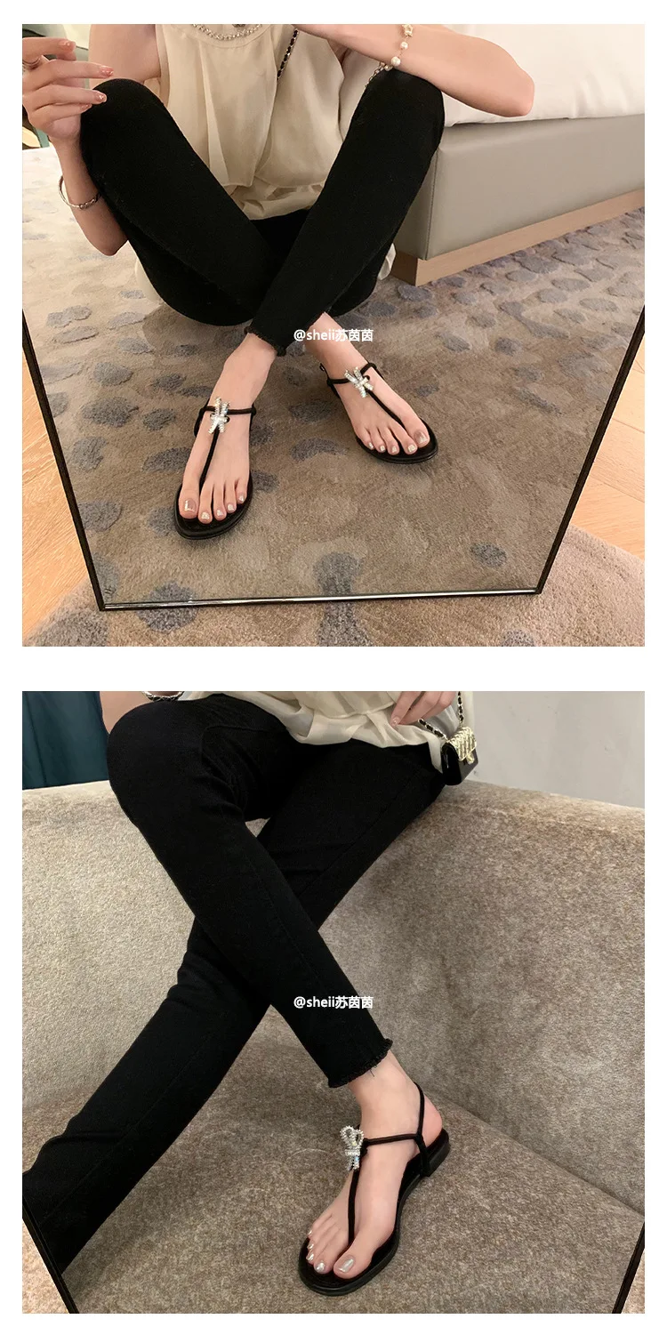 2023 Summer New Sparkling Star River T Belt Rhinestone Buckle Real Leather Clip Toe Thick Heel Sandals for Women
