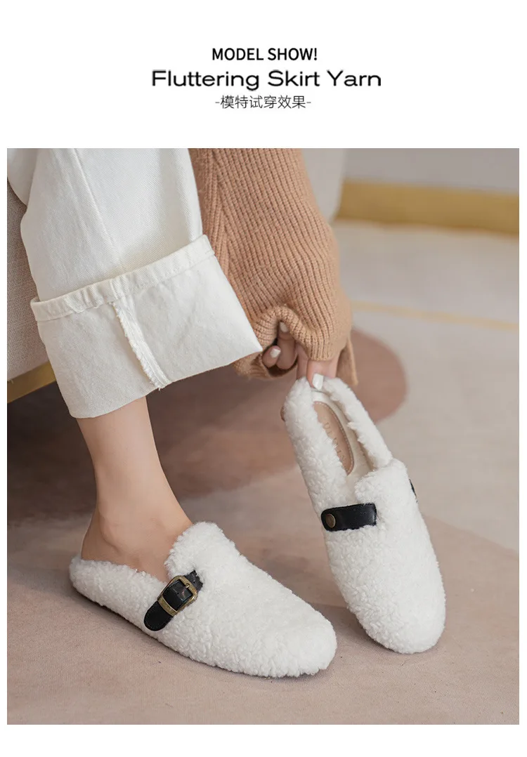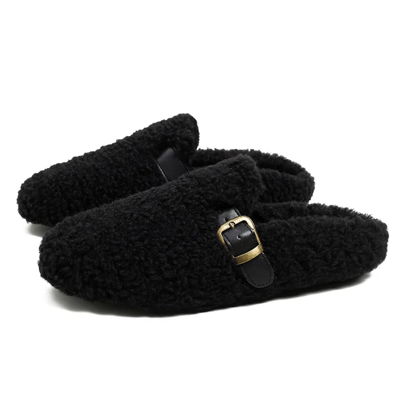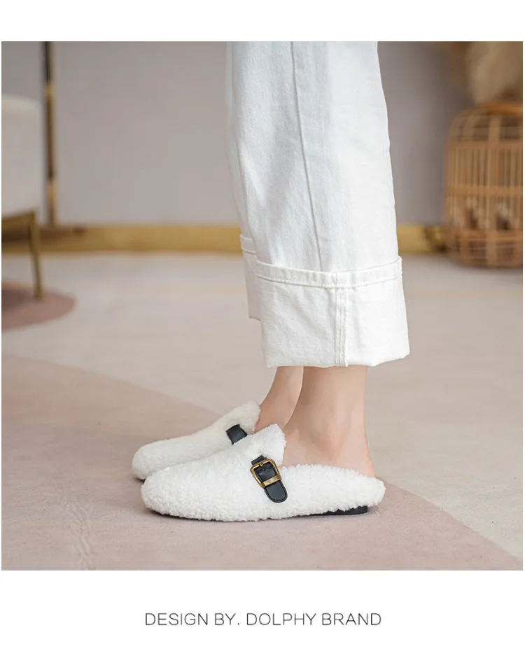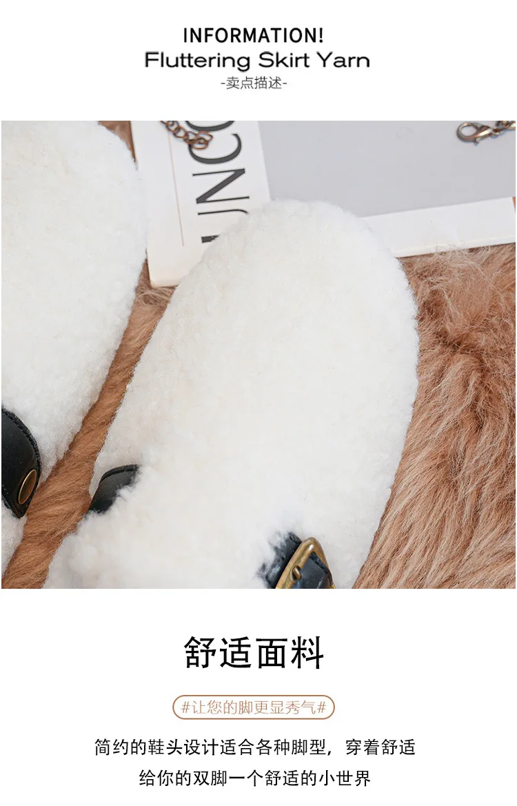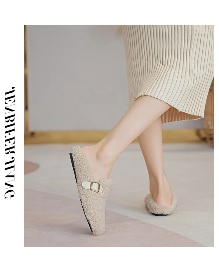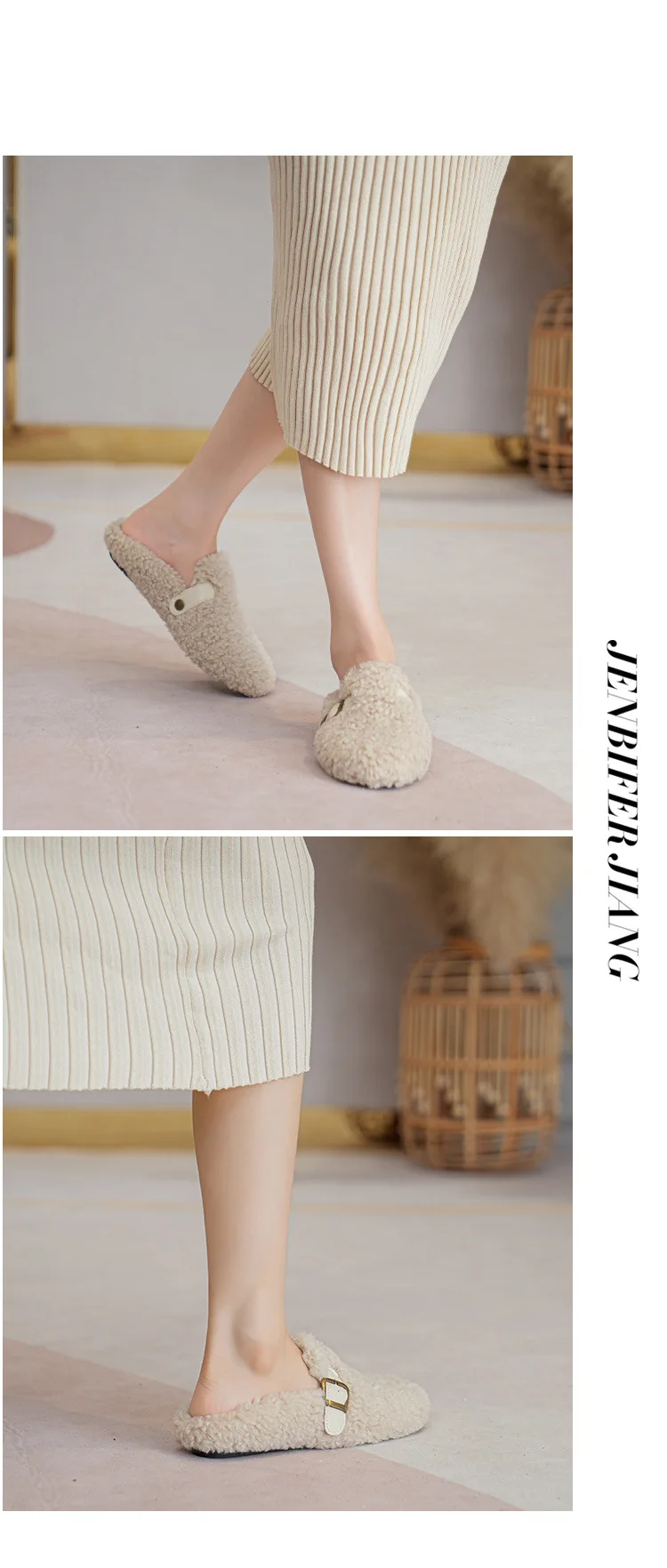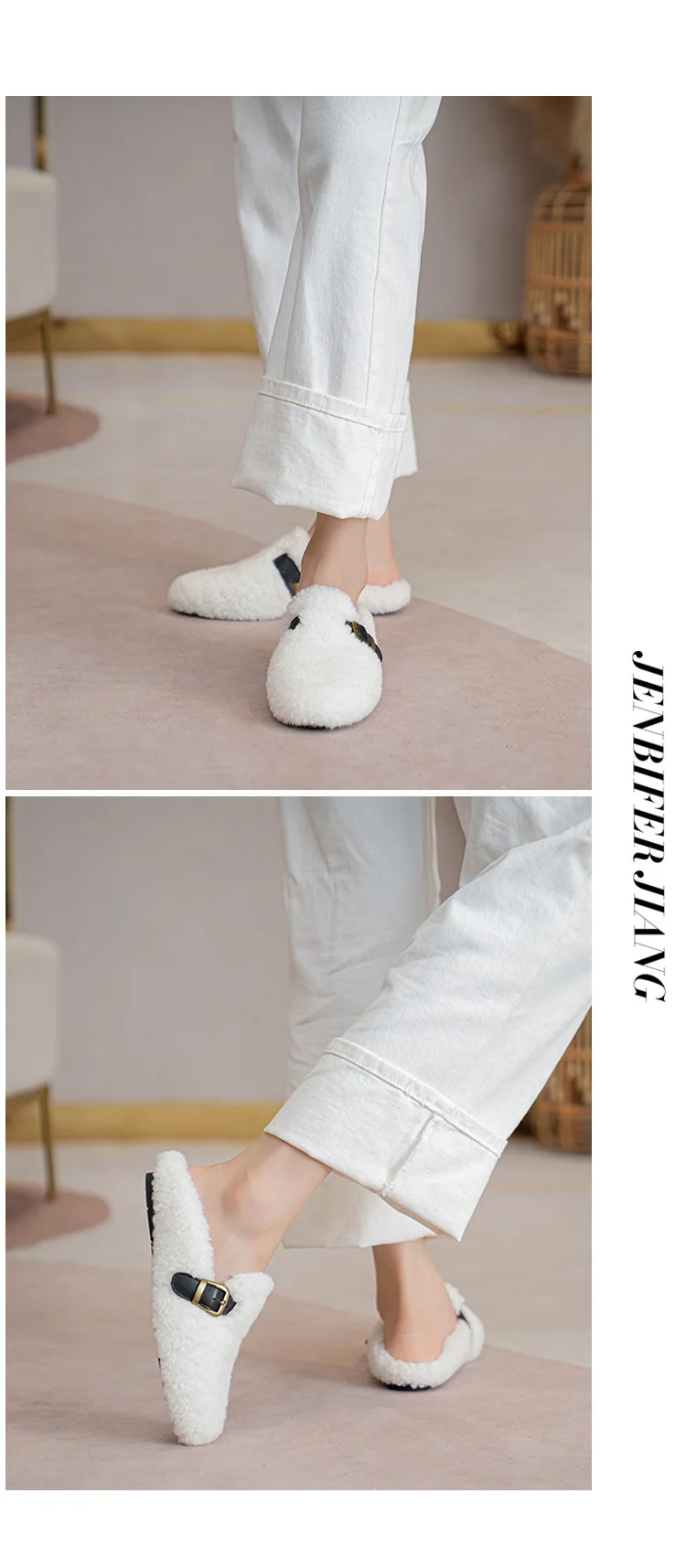 2023 Women Belt Buckle Wool Pantuflas Shoes Flats Slip On Sheep Fur Slippers Ladies Home Slides Femmes Cotton Lambswool Mules
