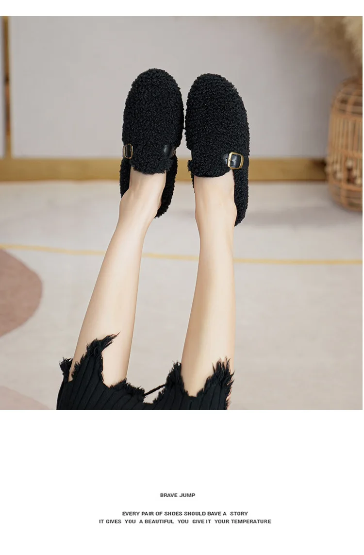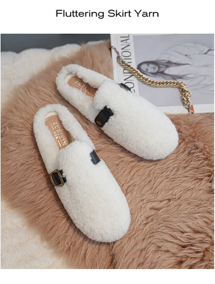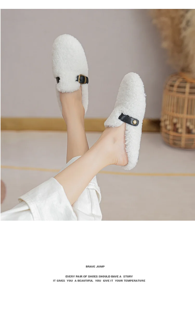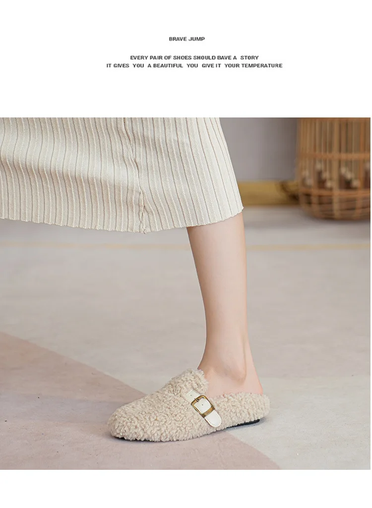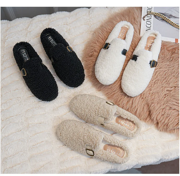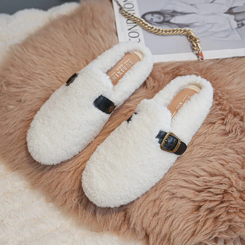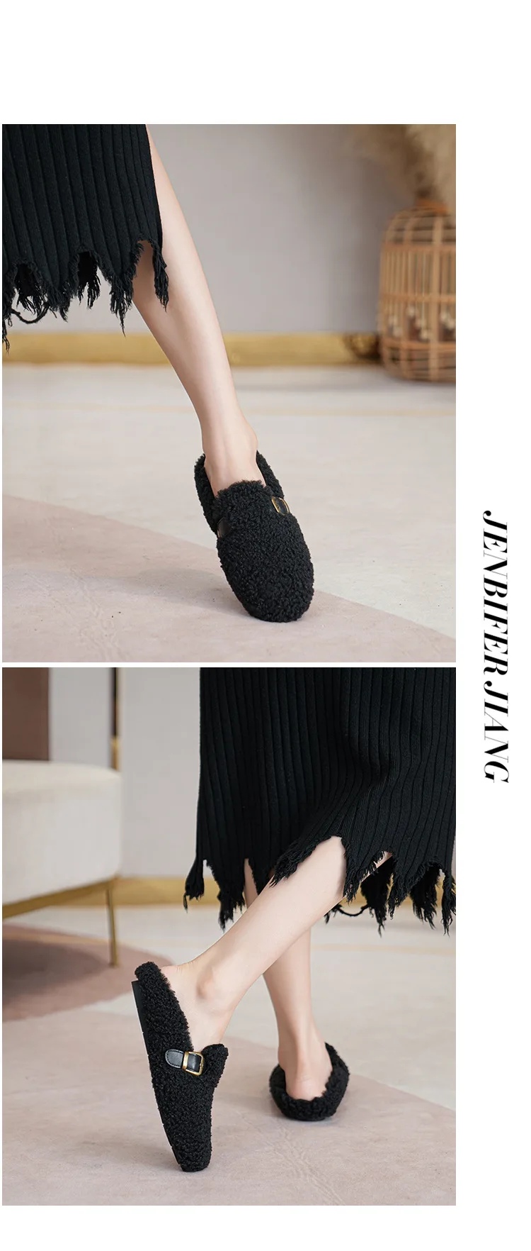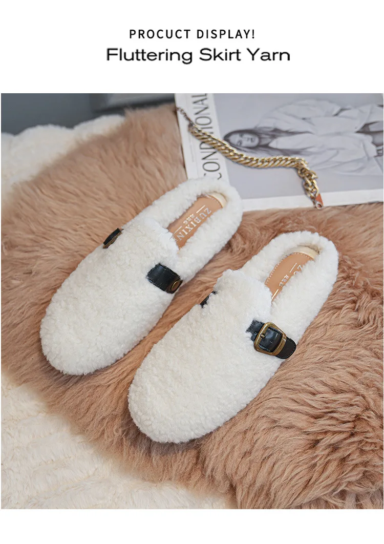 2023 Women Belt Buckle Wool Pantuflas Shoes Flats Slip On Sheep Fur Slippers Ladies Home Slides Femmes Cotton Lambswool Mules