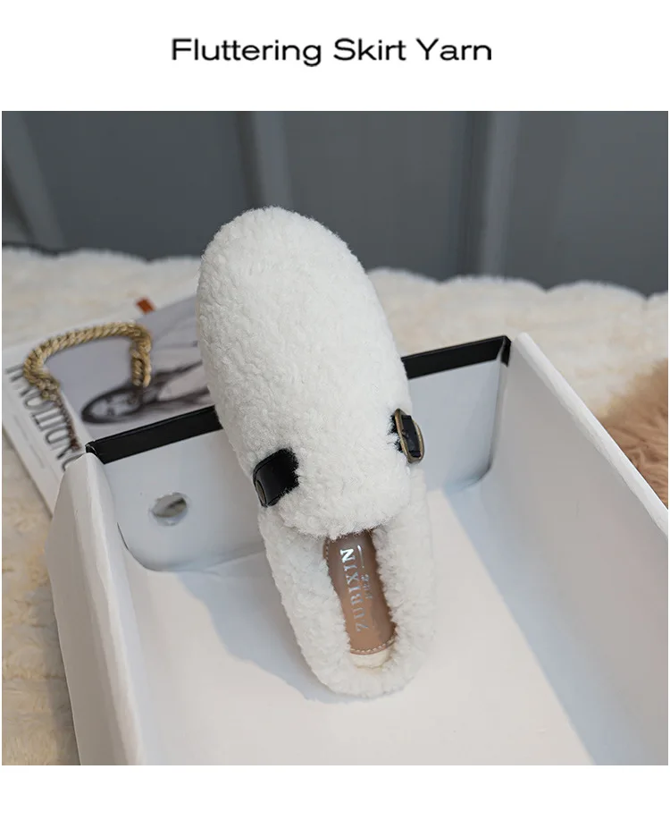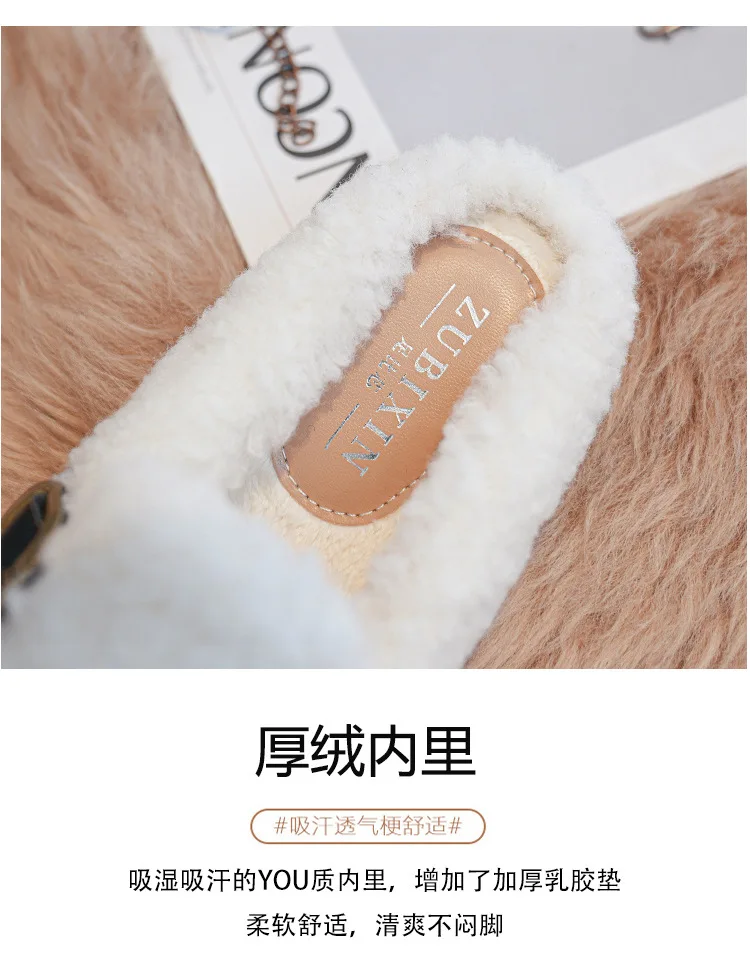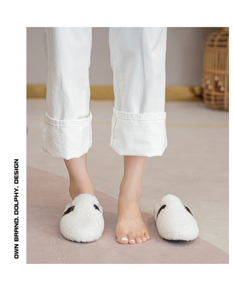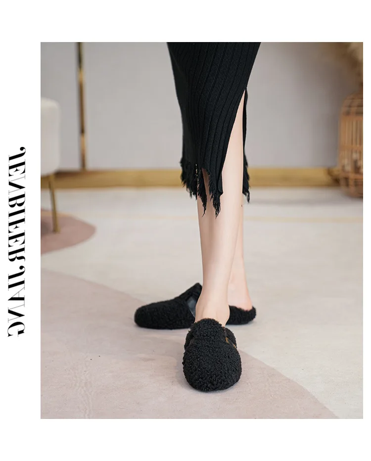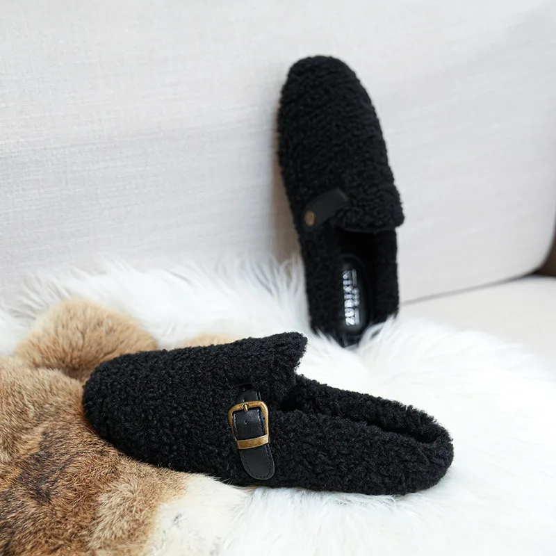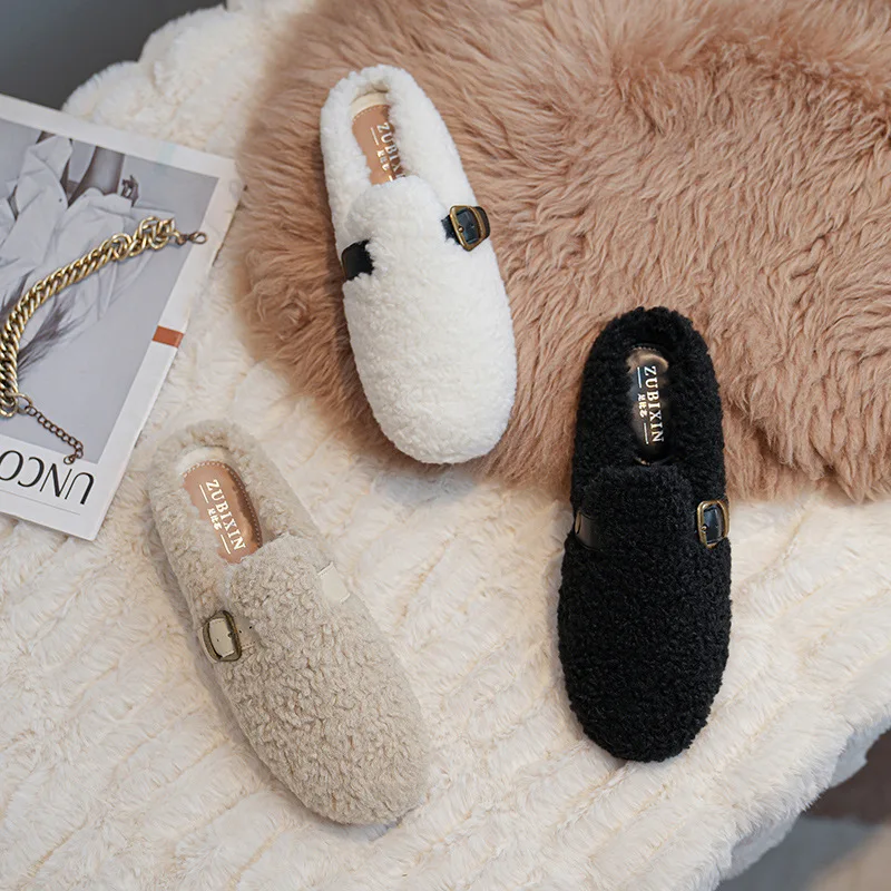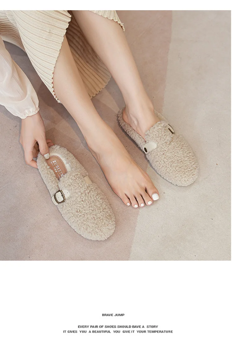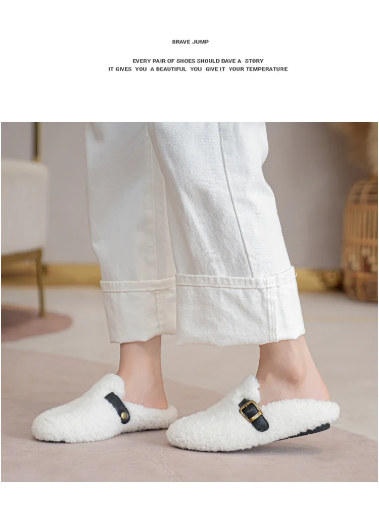 2023 Women Belt Buckle Wool Pantuflas Shoes Flats Slip On Sheep Fur Slippers Ladies Home Slides Femmes Cotton Lambswool Mules