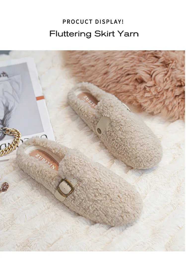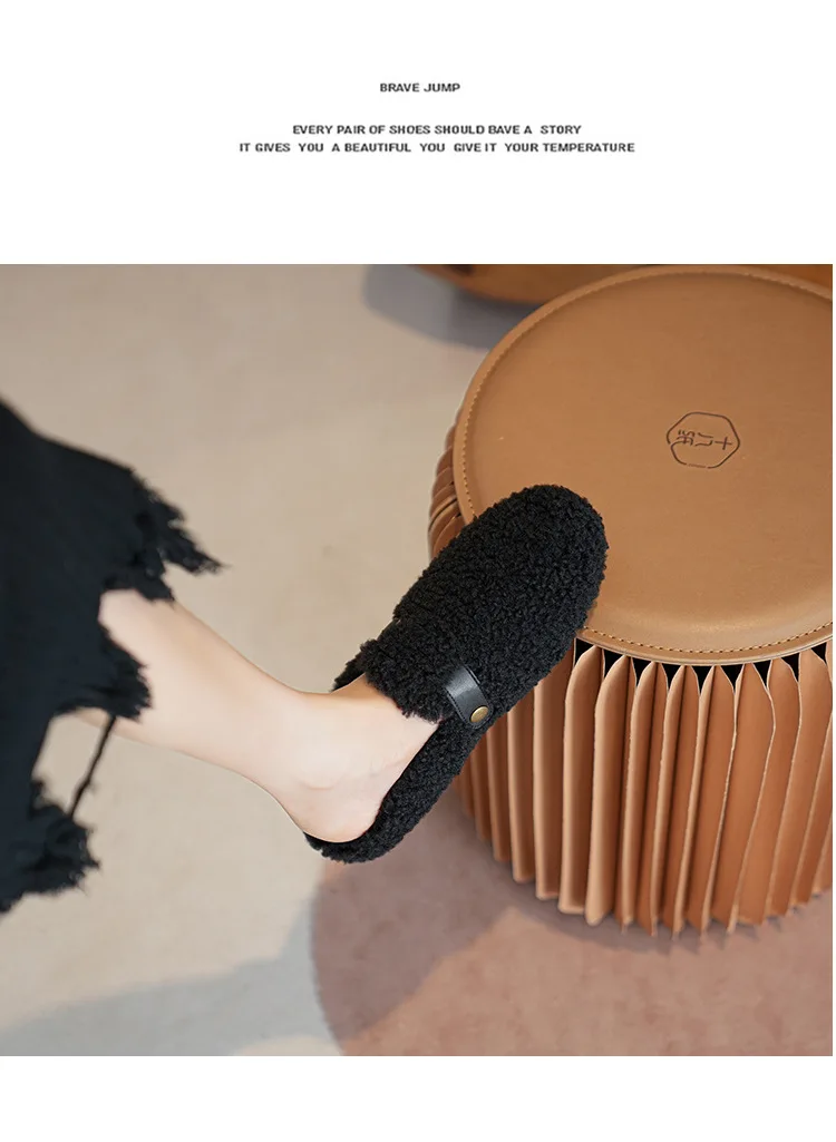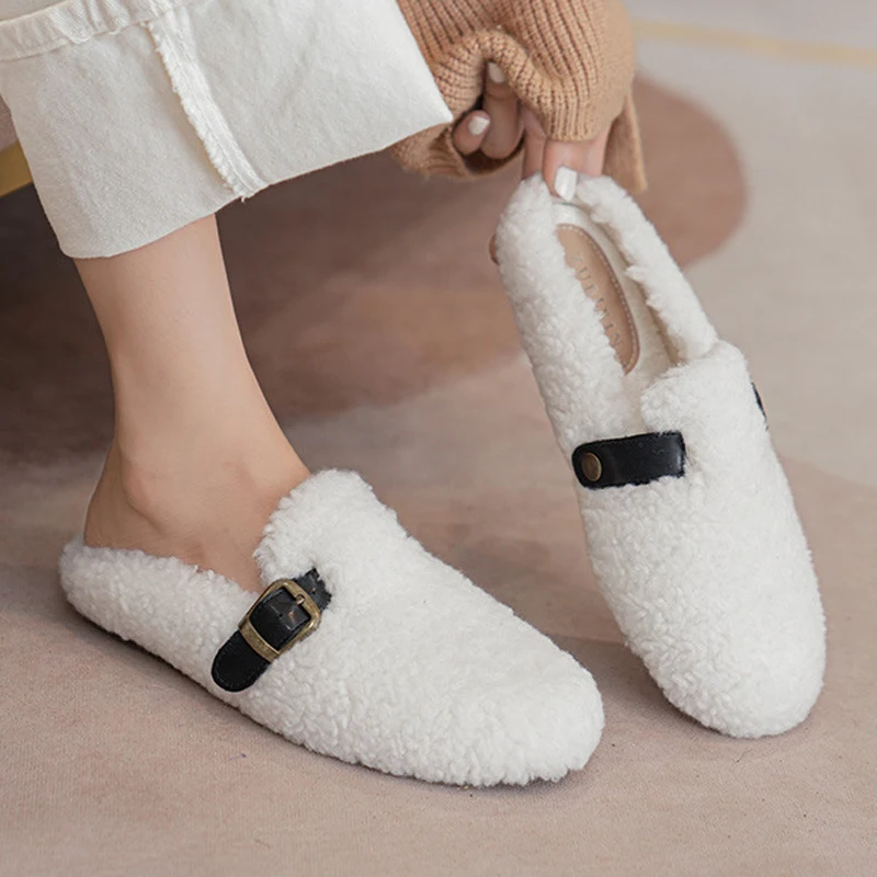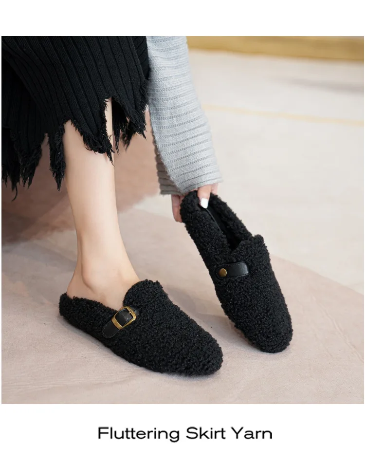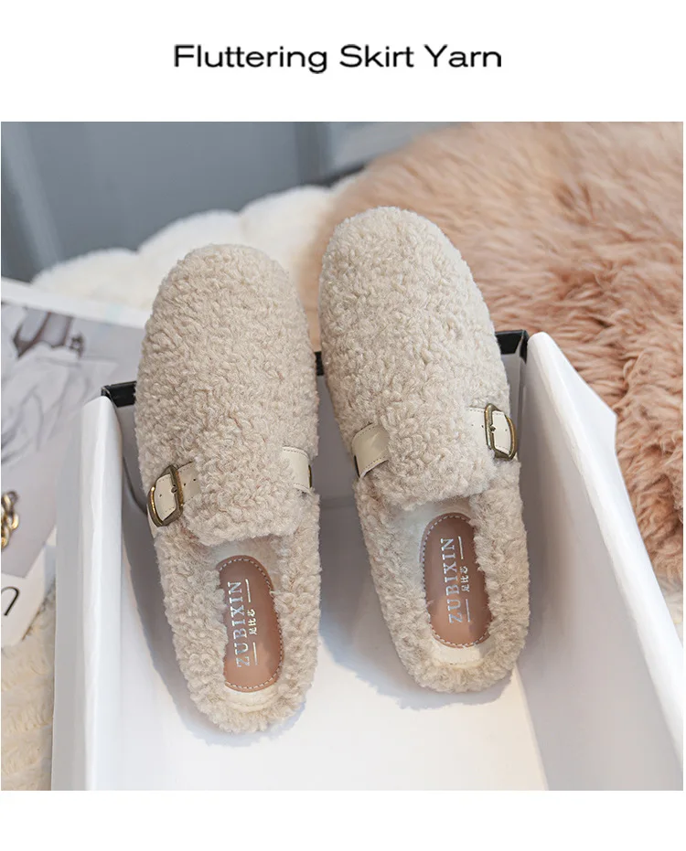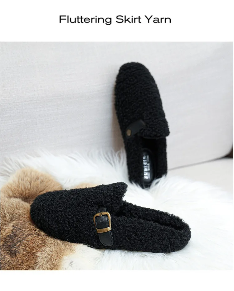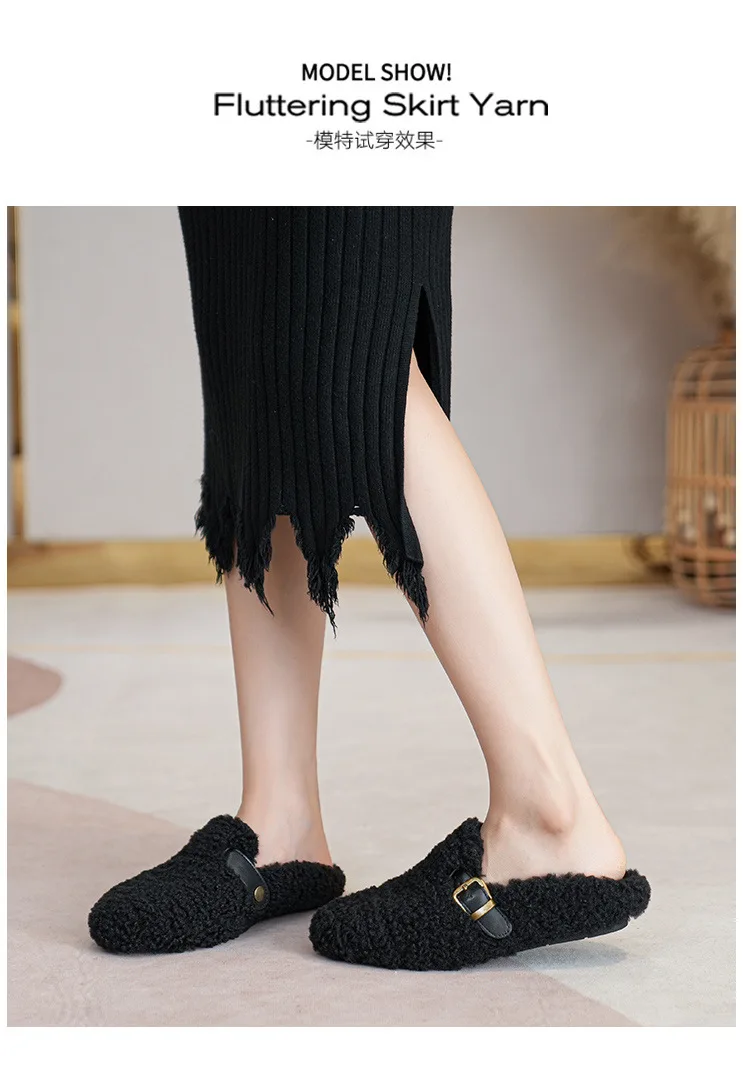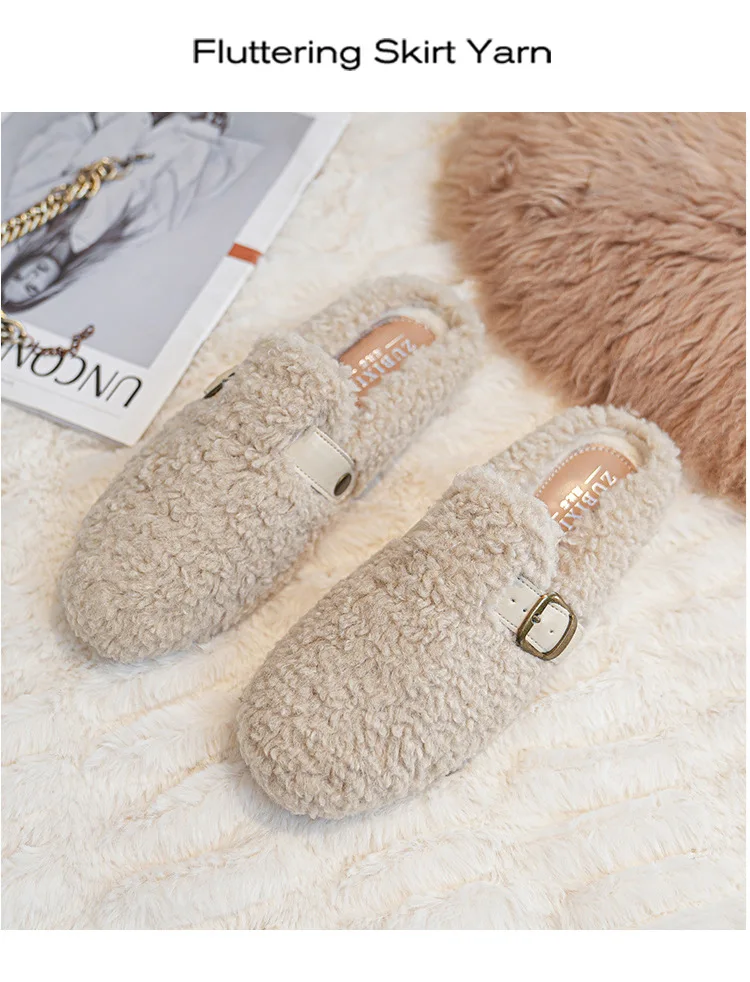 2023 Women Belt Buckle Wool Pantuflas Shoes Flats Slip On Sheep Fur Slippers Ladies Home Slides Femmes Cotton Lambswool Mules