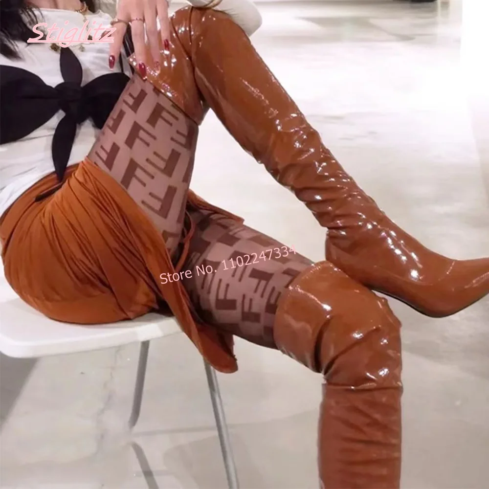 2024 Brown Stretch Thigh Boots Women’s Luxury Pointed Toe Sexy footwear Patent Leather Thin High Heel Party Fashion Shoes