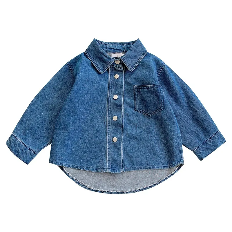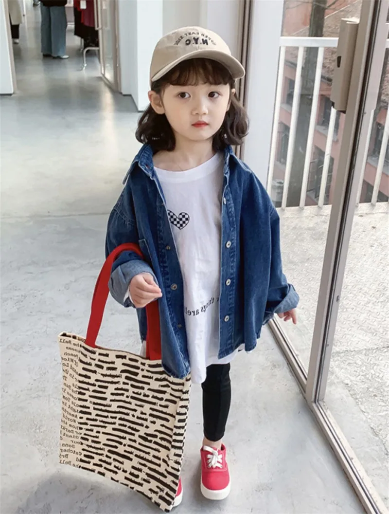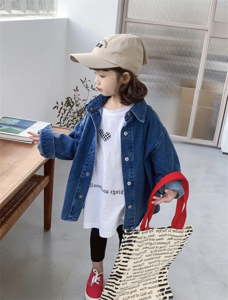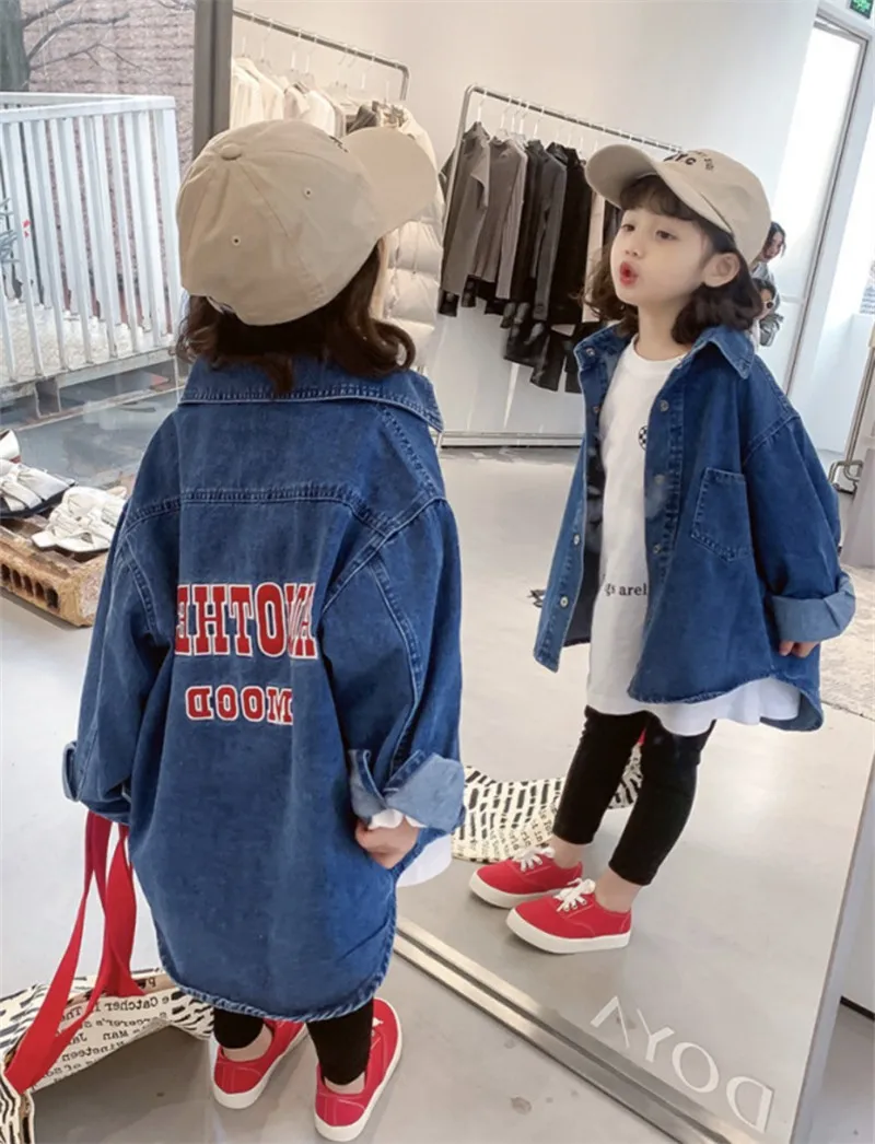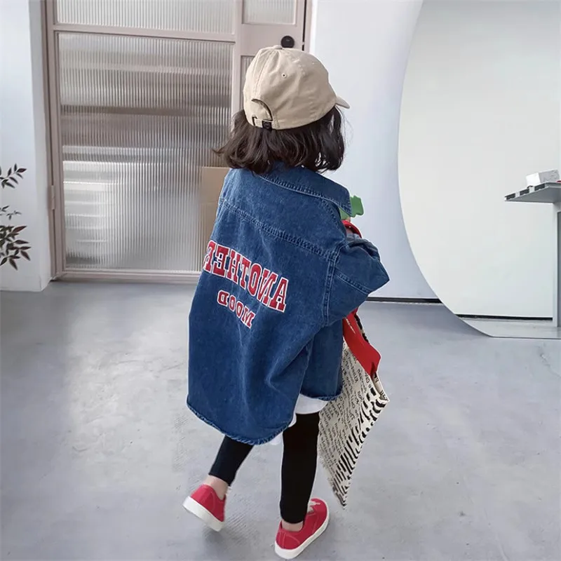 2024 New Girls Medium Length Denim Jacket Spring Autumn Fashion Casual Children Long Sleeve Shirt Top Coat Baby