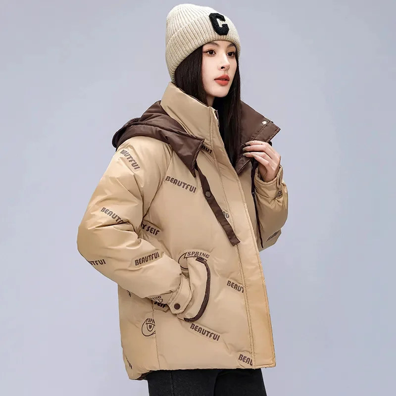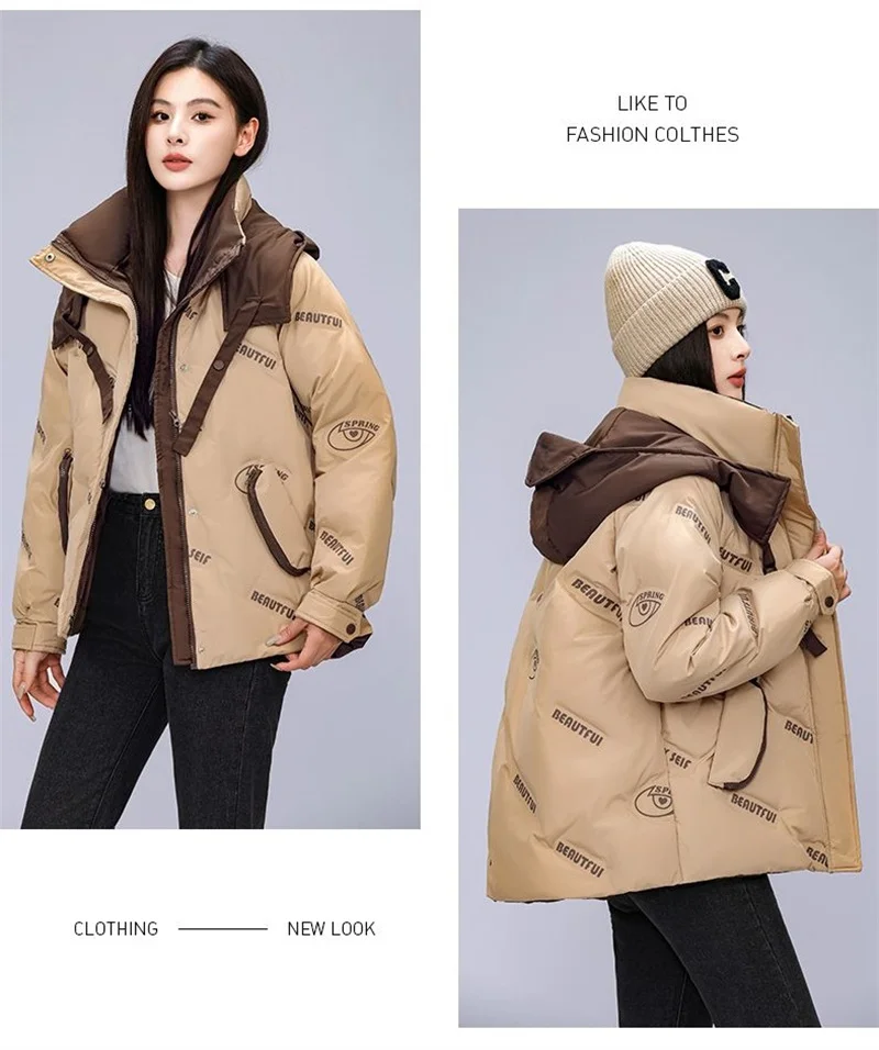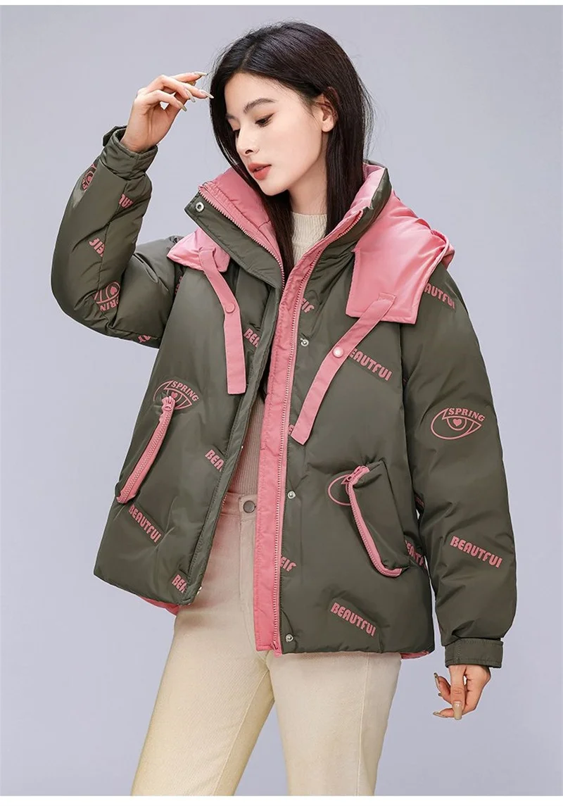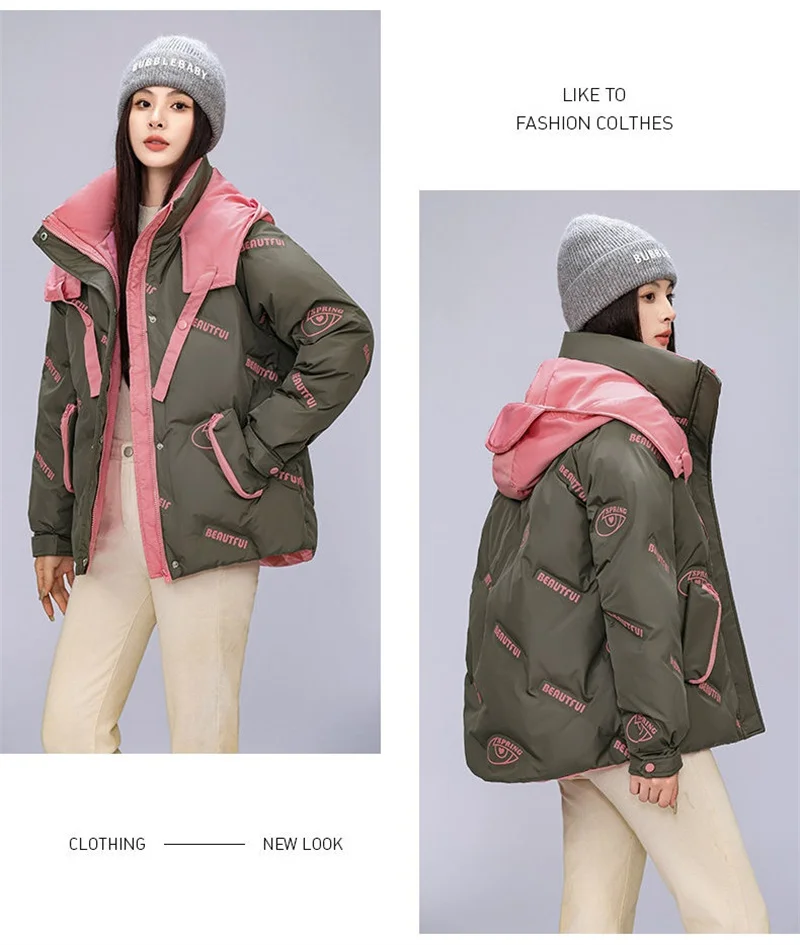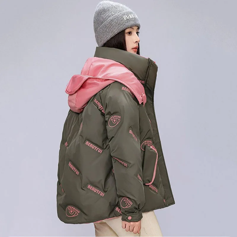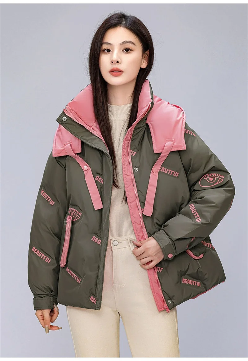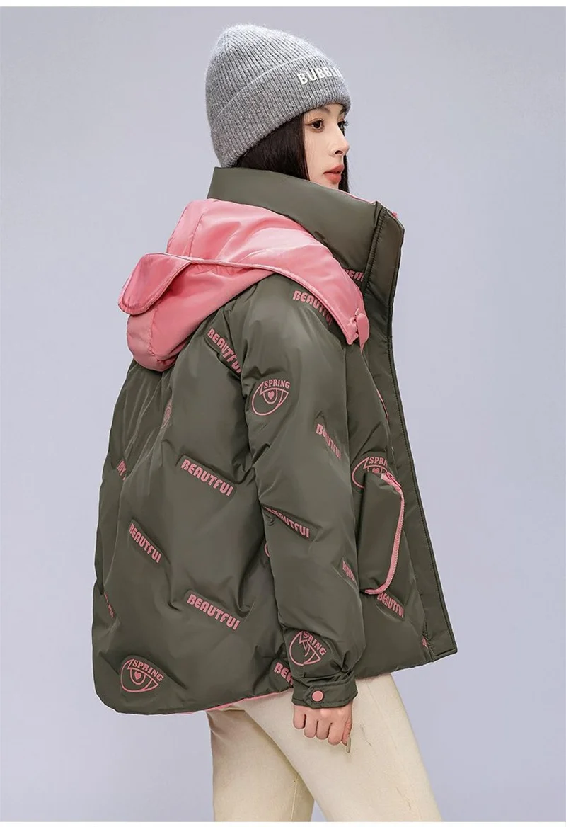 2024 New Winter Printed letters Down Cotton Padded Jacket Women Loose Warm Thicken Bread Coat Hooded Jacket Women Parkas Tops