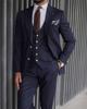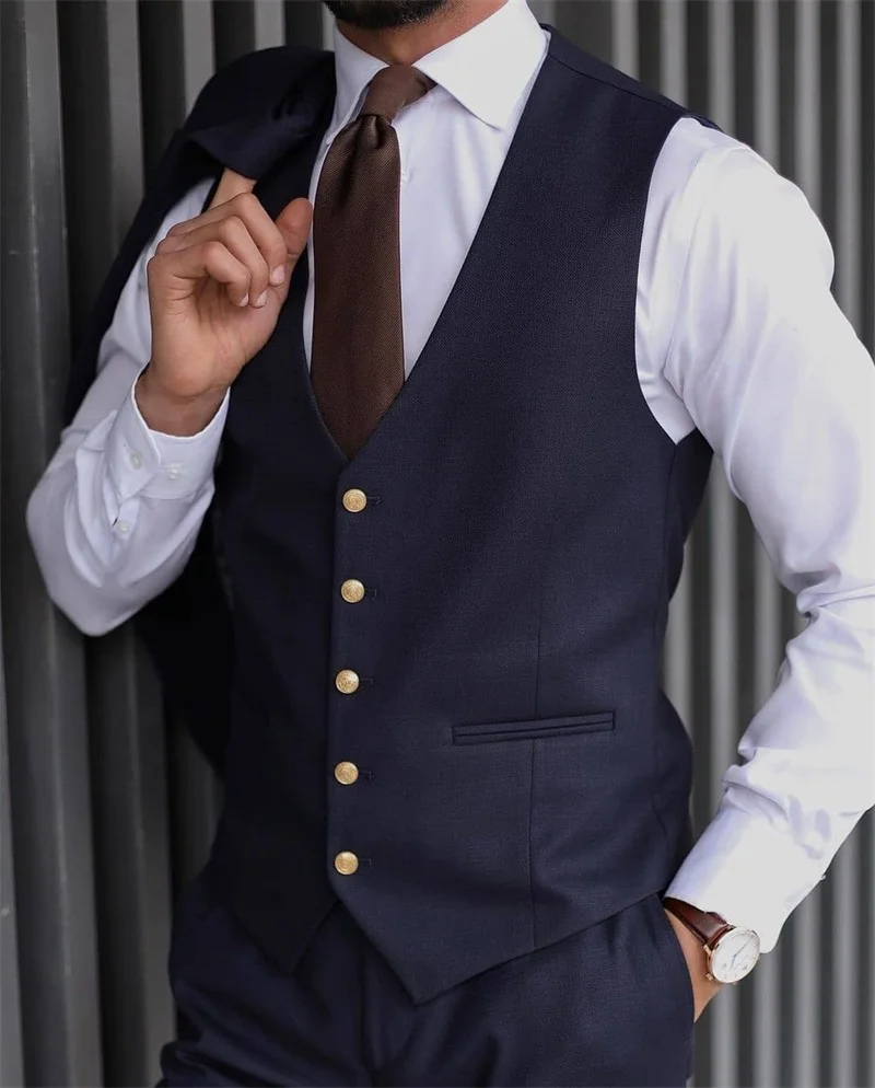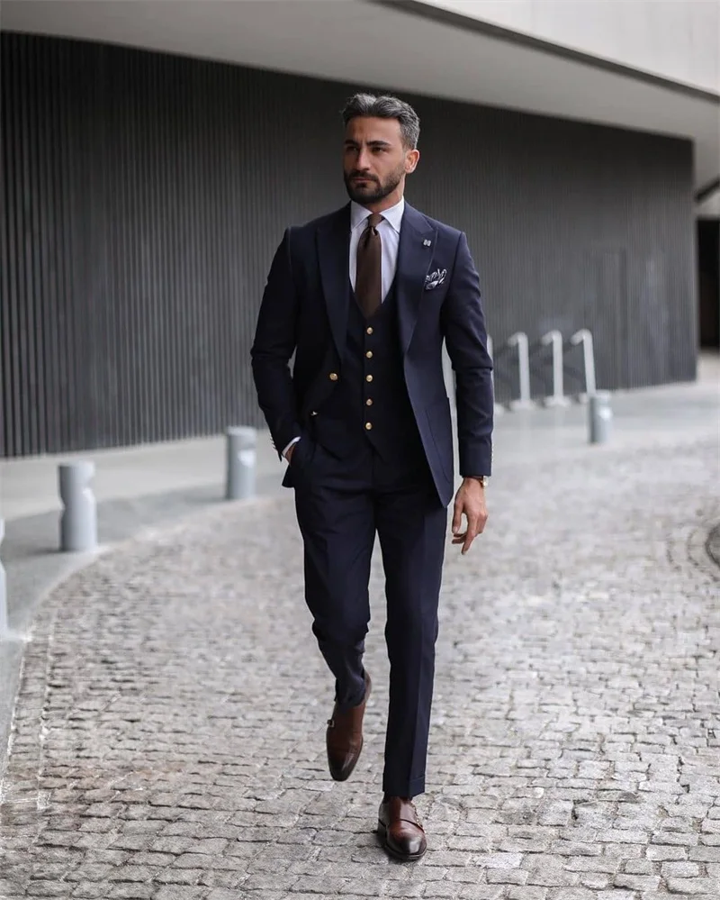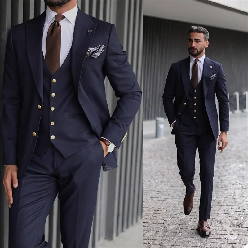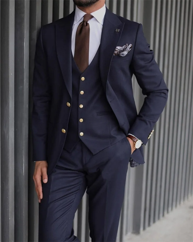 3 Pieces Formal Men Suits High Quality Navy Business Suits Gold Button Custom Made Tuxedos Peak Lapel Blazer Coat+Pant+Vest