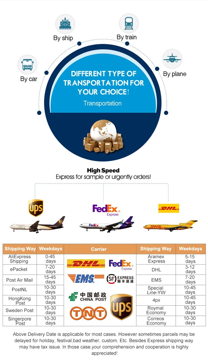 Packages from our warehouse in China will be shipped by ePacket or EMS depending on the weight and size of the product. Packages shipped from our US warehouse are shipped through USPS.