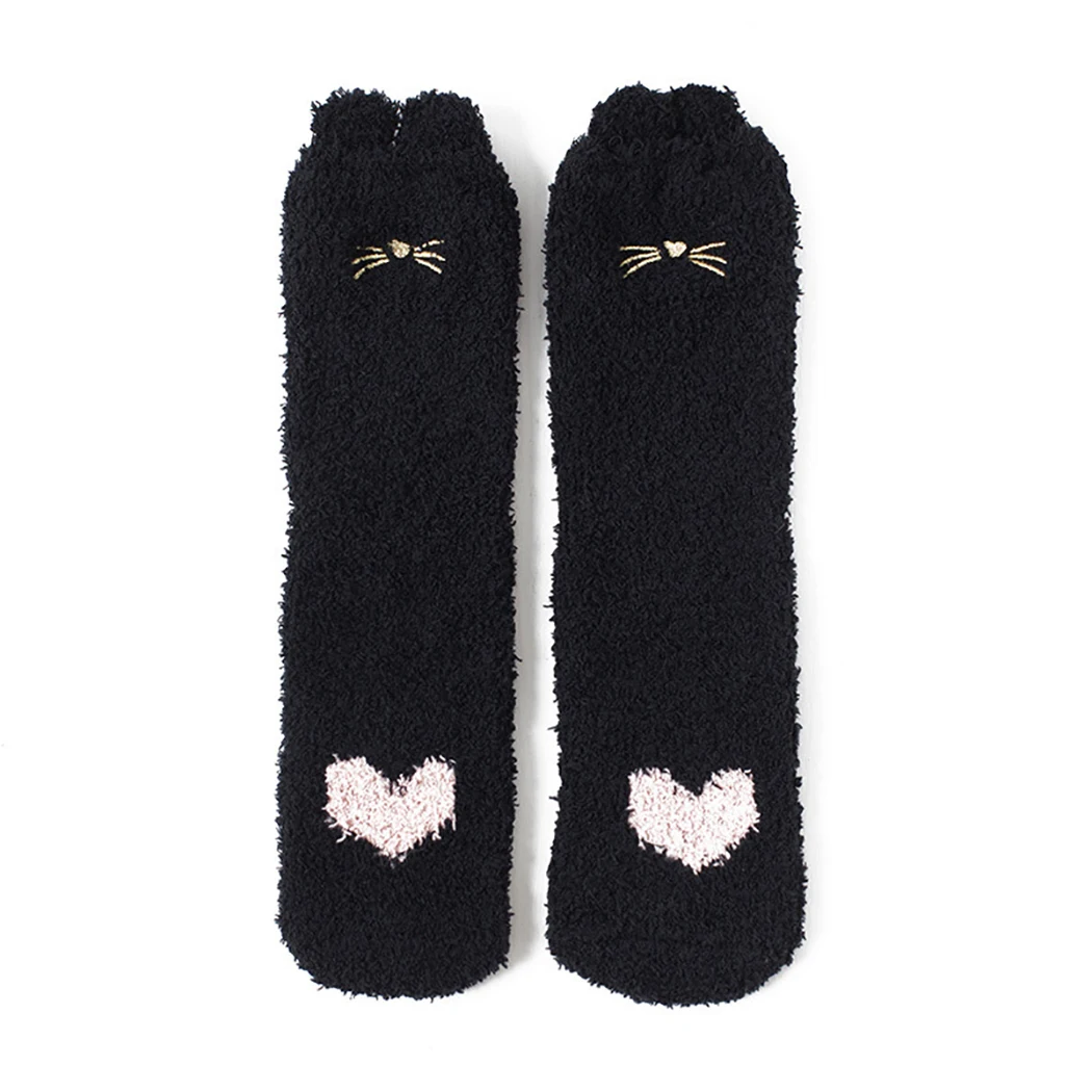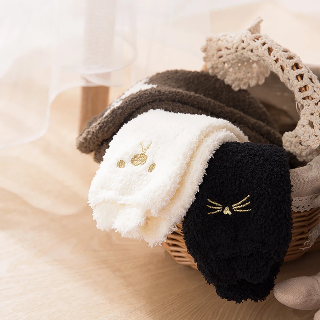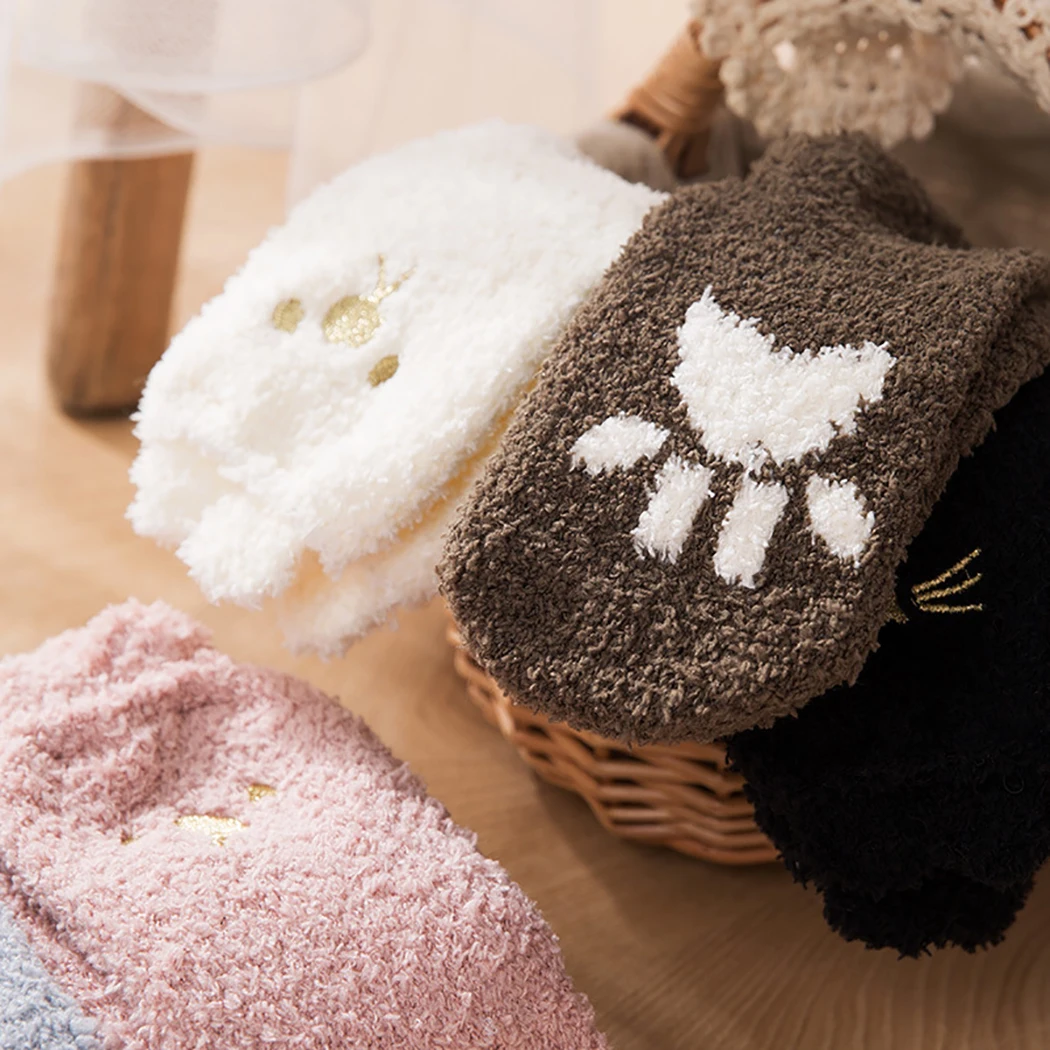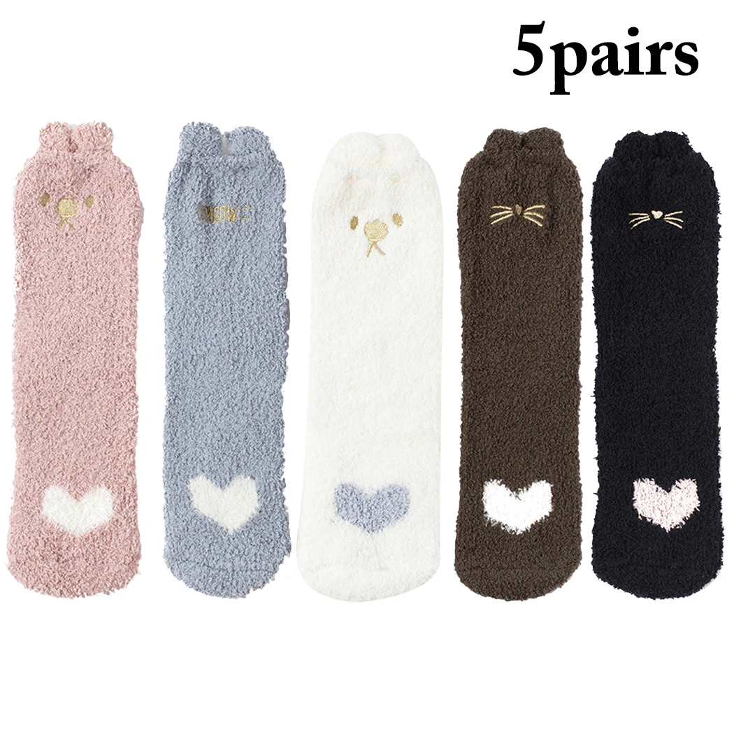 5pcs Fuzzy Fluffy Terry Warm Socks Cat Coral Velvet Socks Winter Kawaii Thick Socks Striped Cartoon Women Short Cute Socks