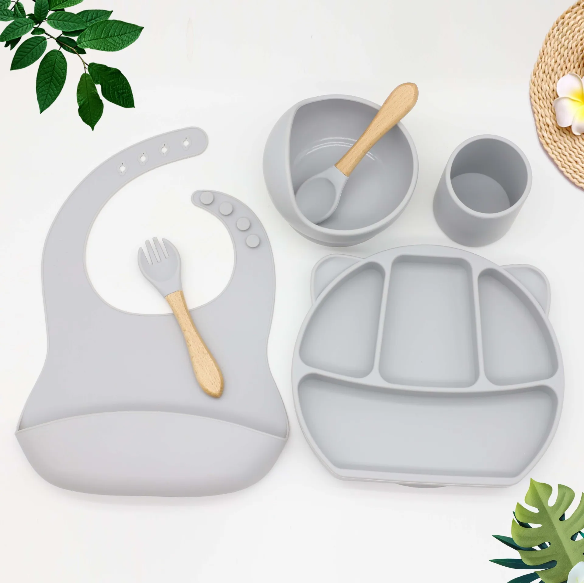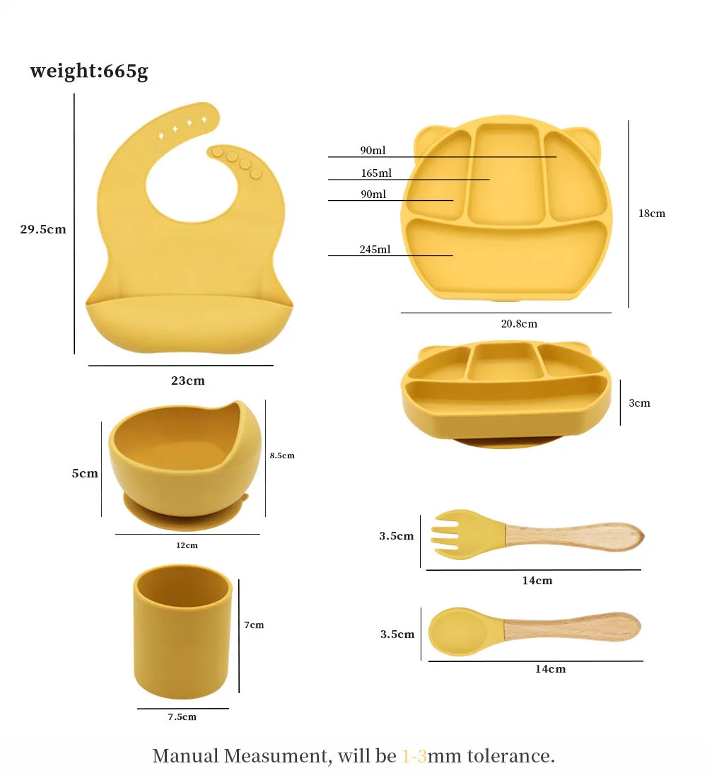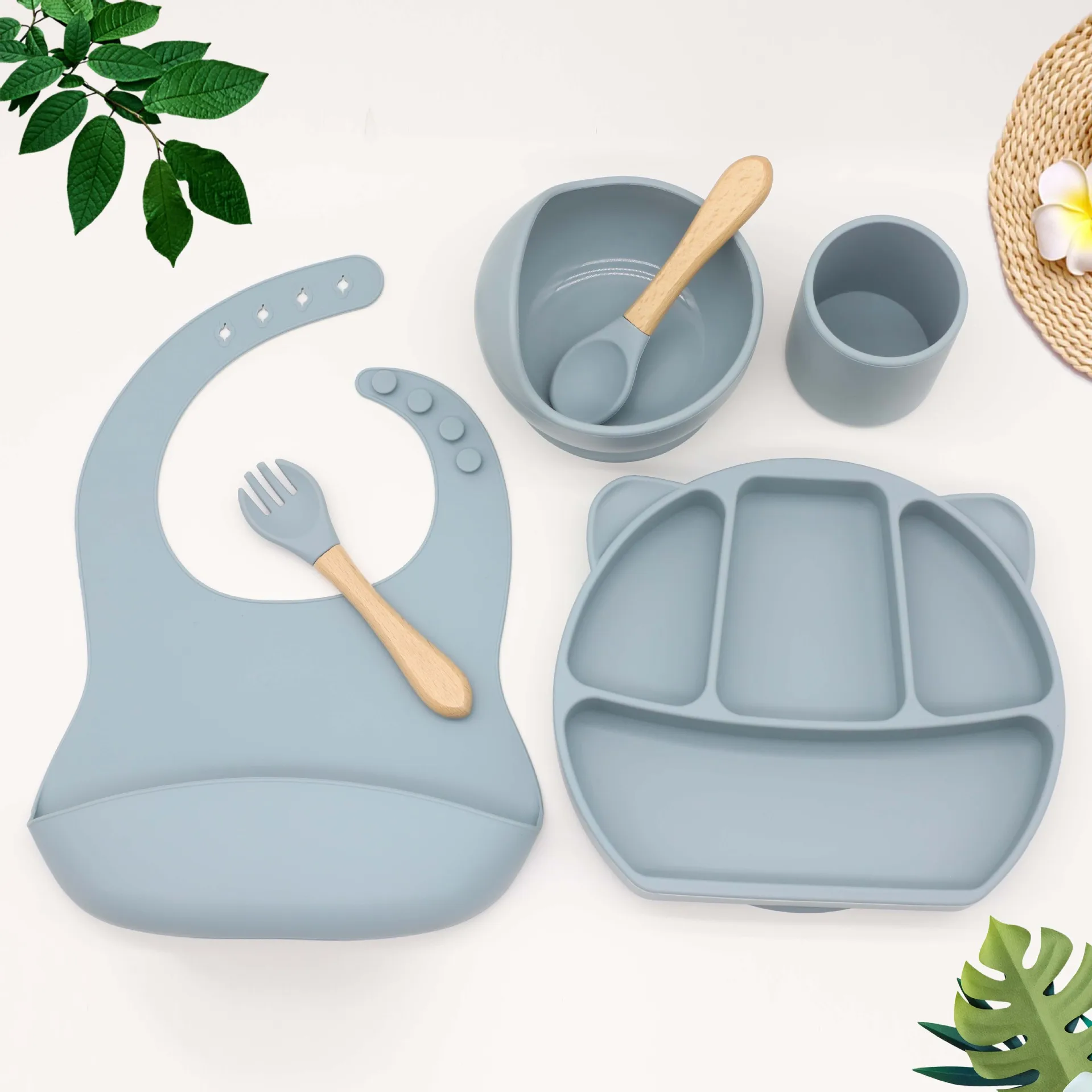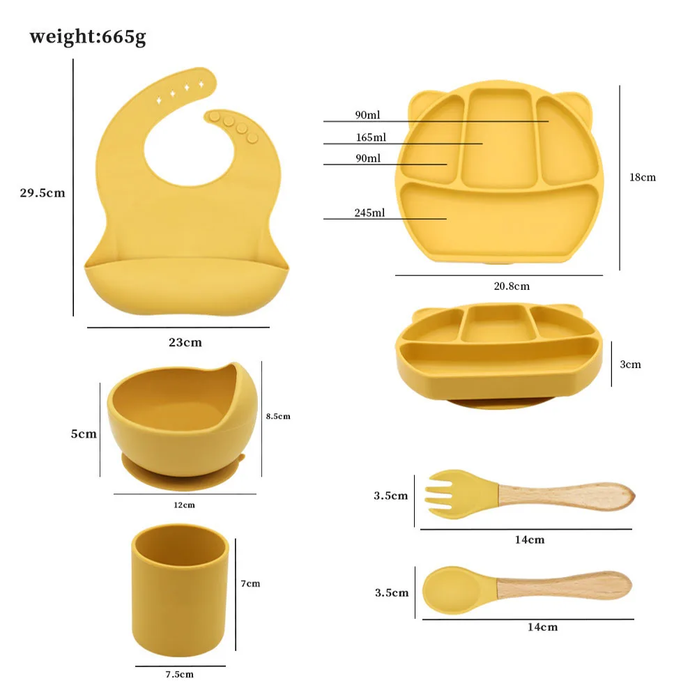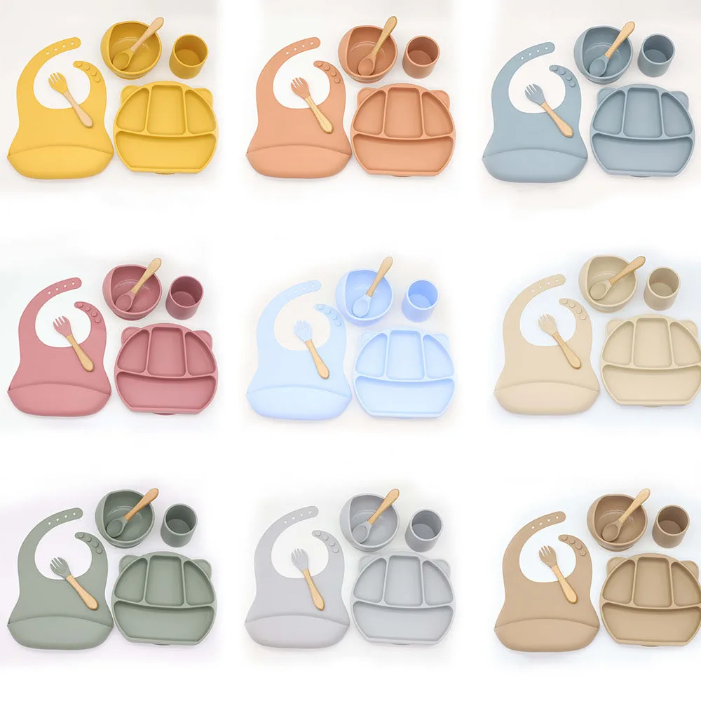 6PCS/Set Baby Silicone Sucker Plate Bowl Cup Bibs Spoon Fork Sets BPA Free Non-slip Children Feeding Tableware Dishes Kids Gift