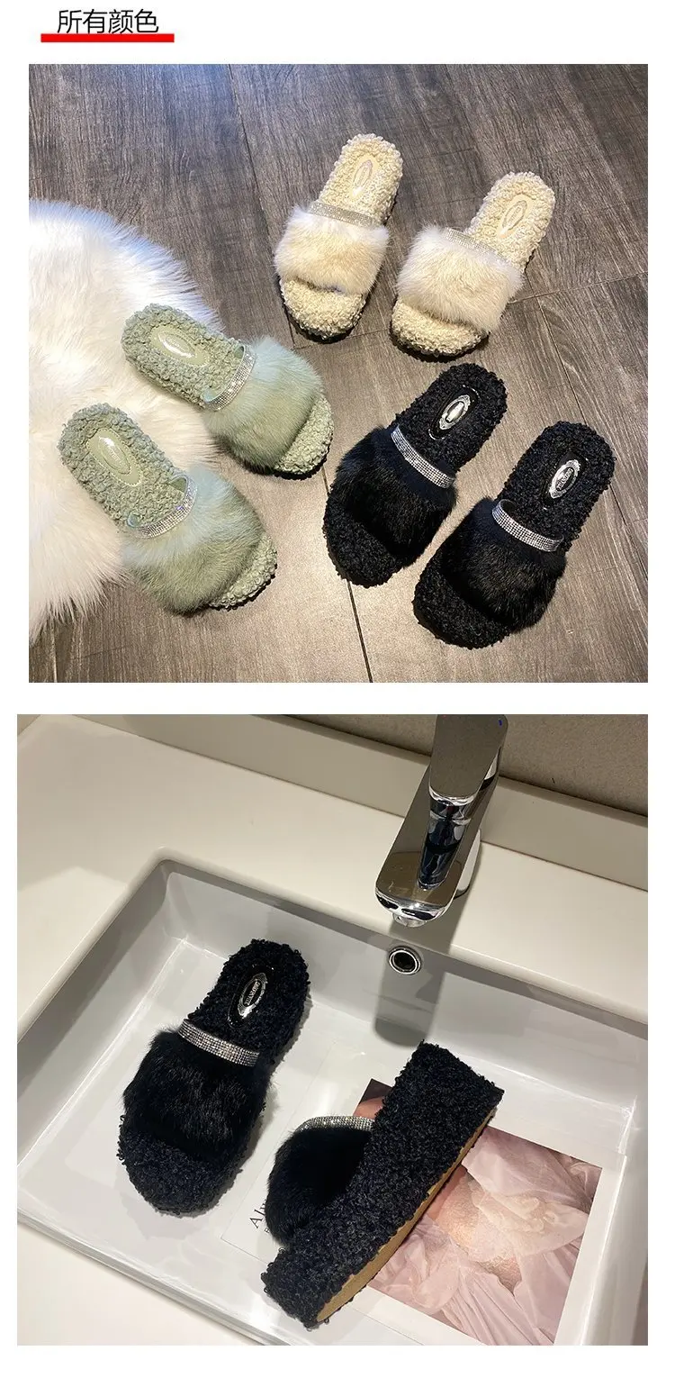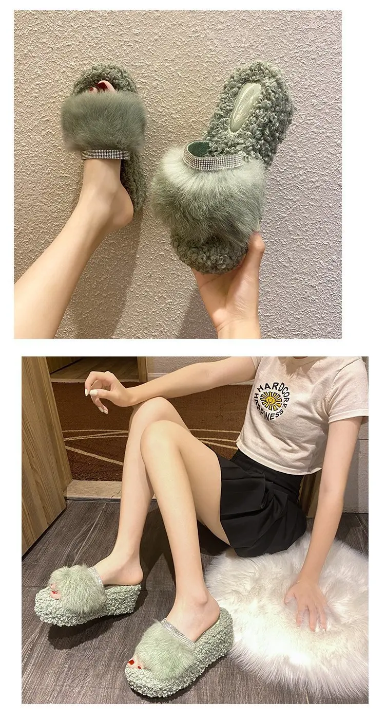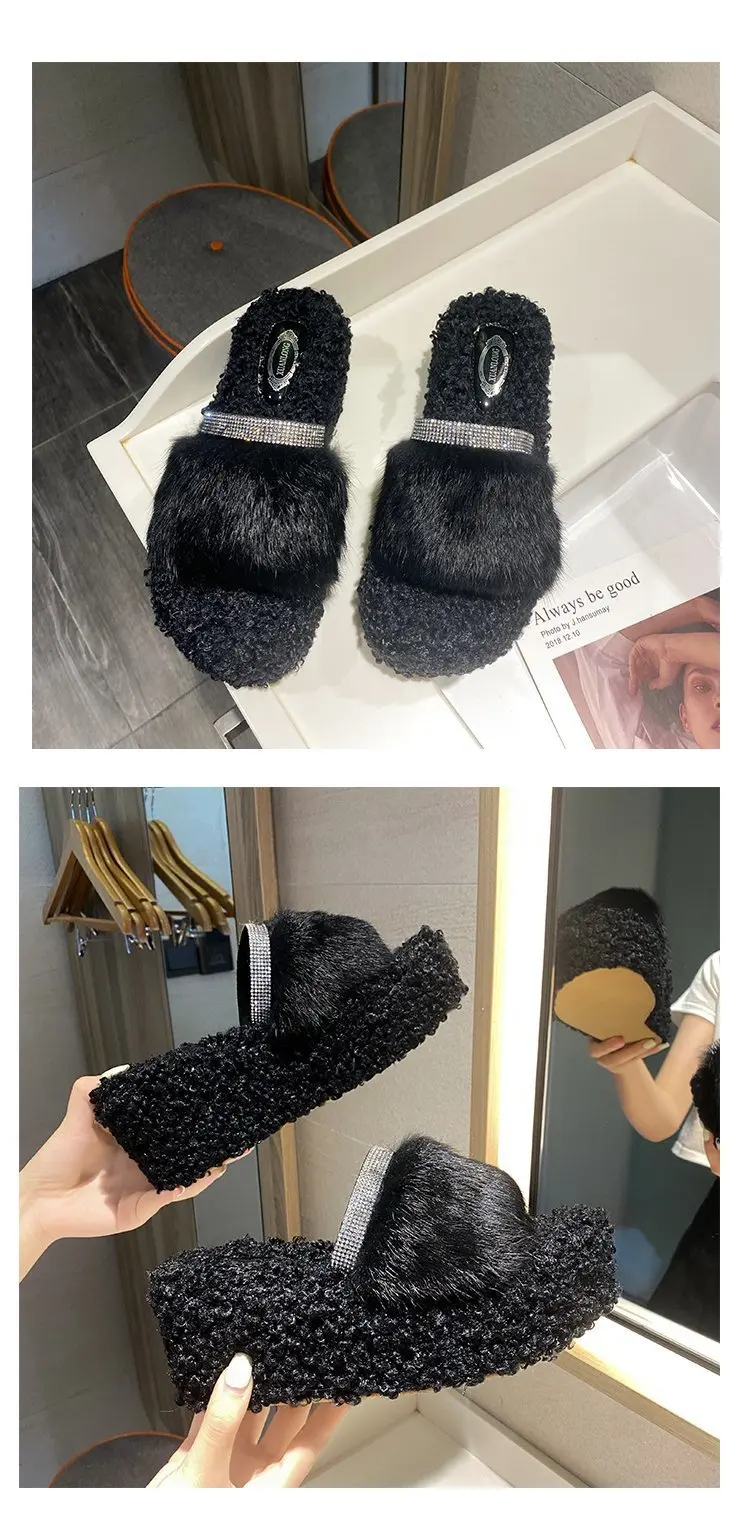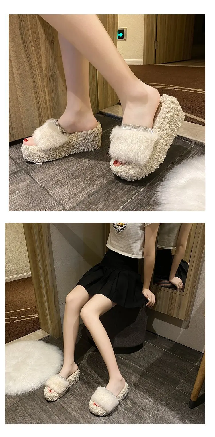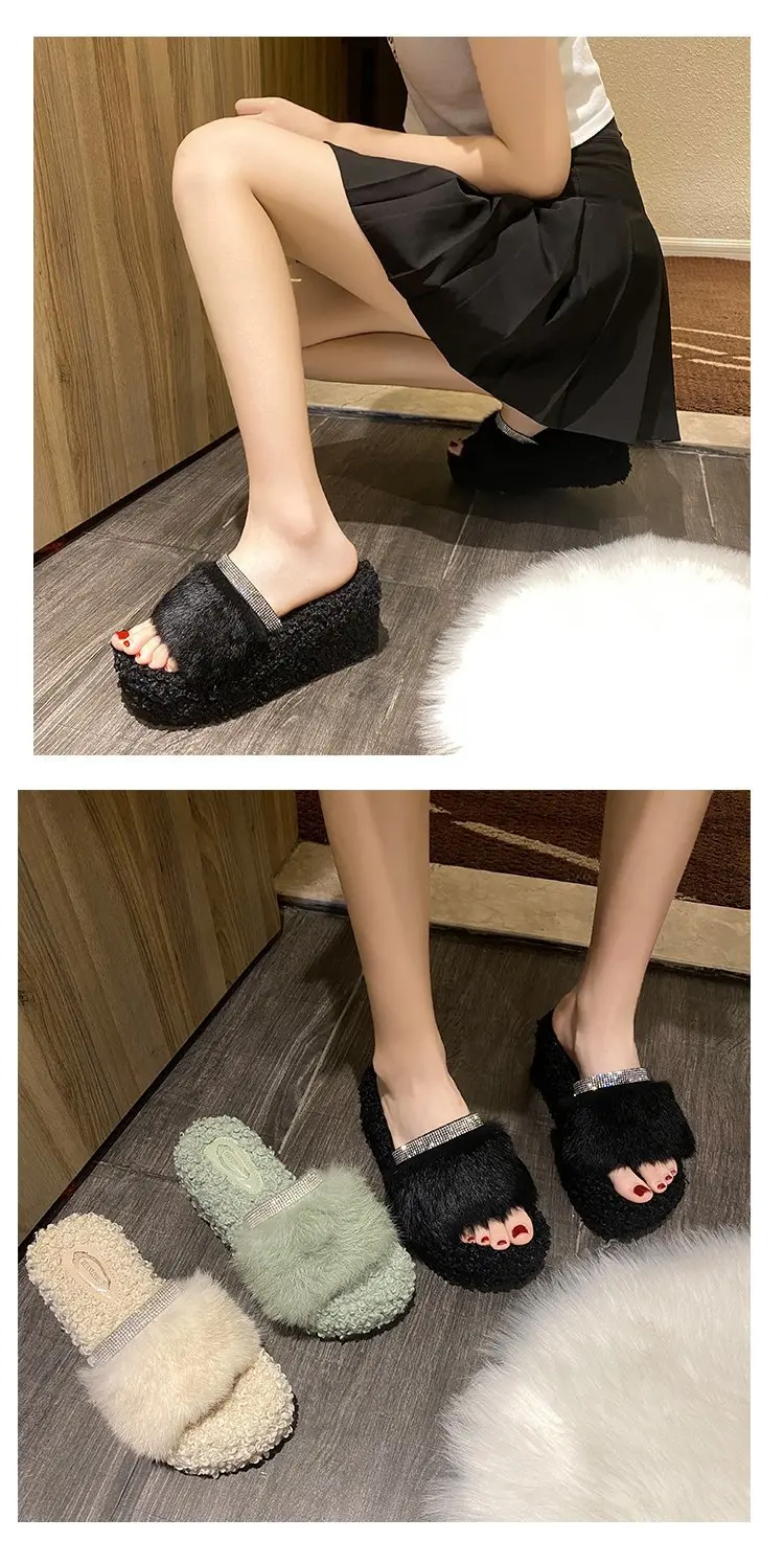 8cm high heels fur slippers women crystal band furry wedges slides open toe wool fur platform slippers female winter homes shoes