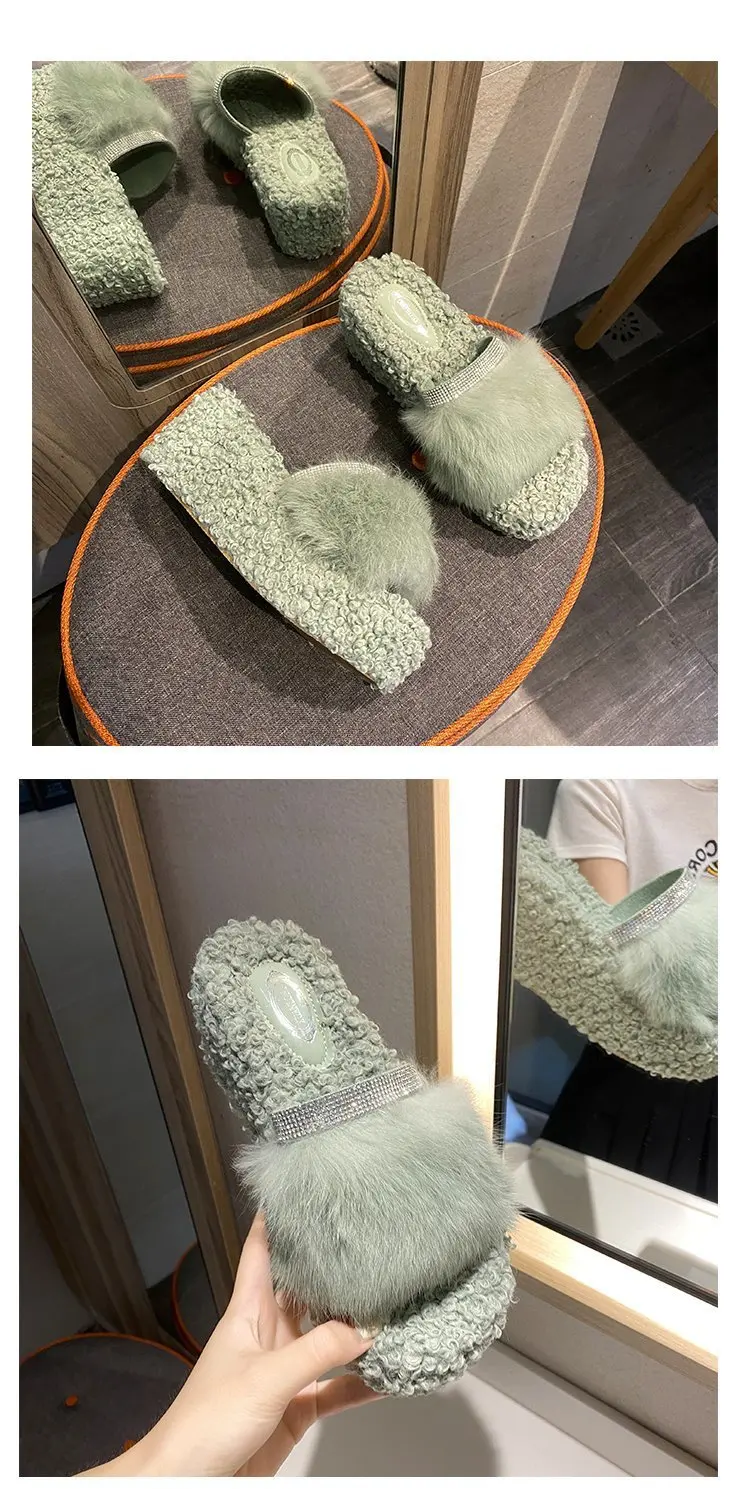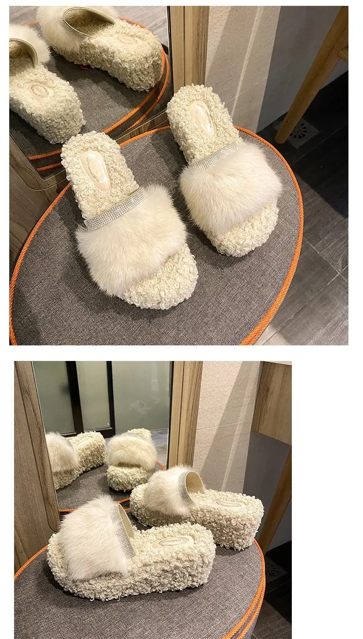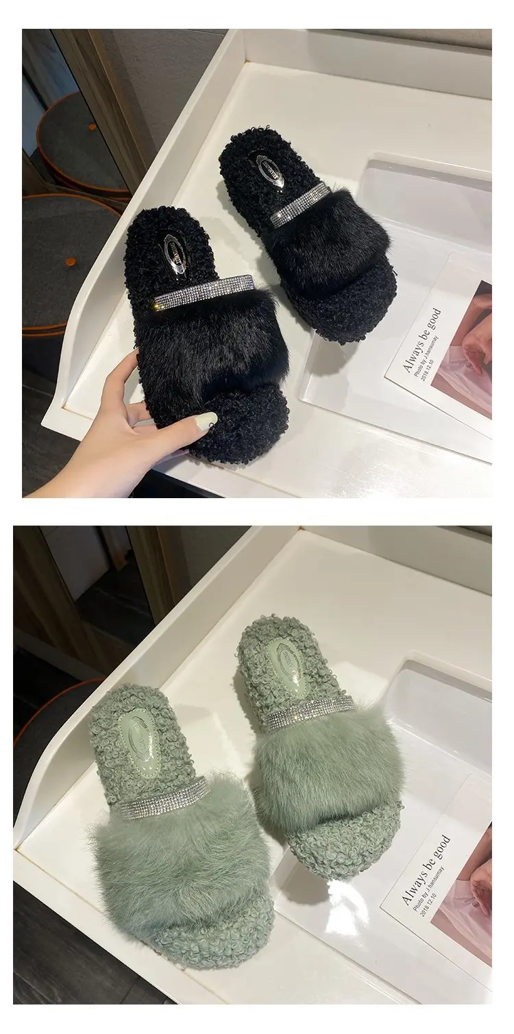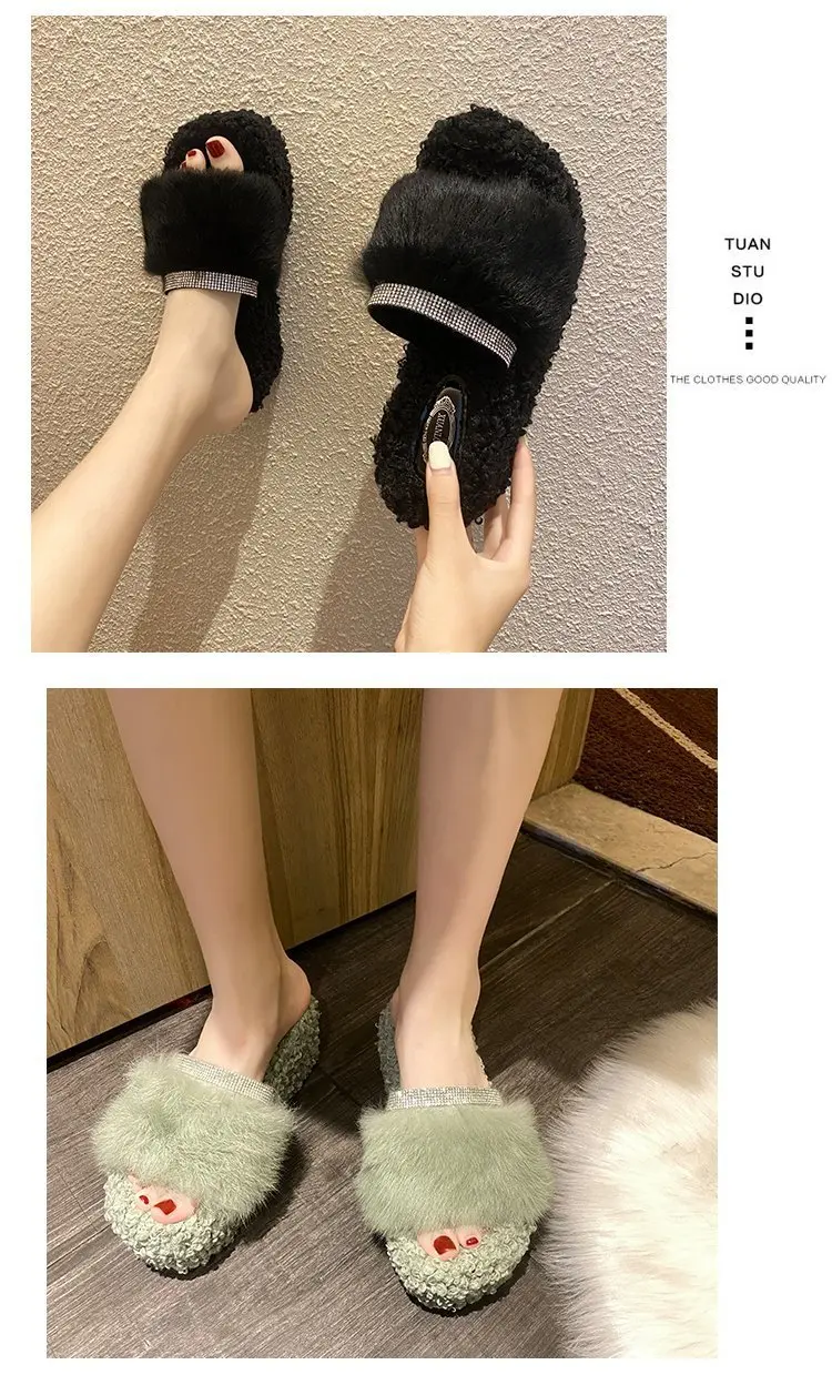 8cm high heels fur slippers women crystal band furry wedges slides open toe wool fur platform slippers female winter homes shoes