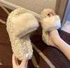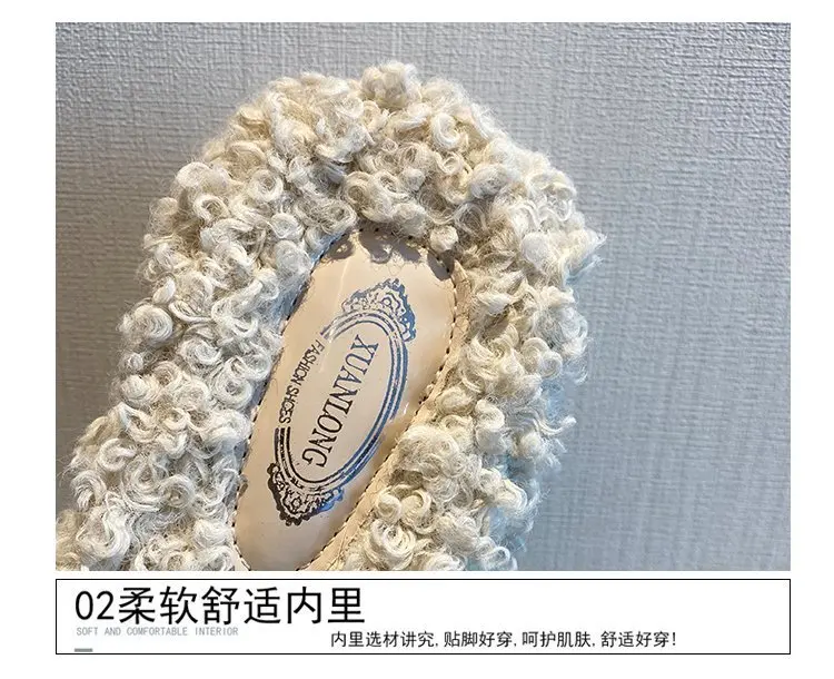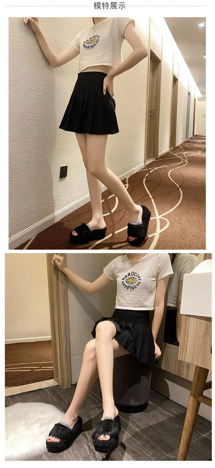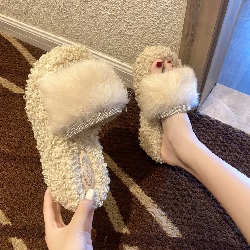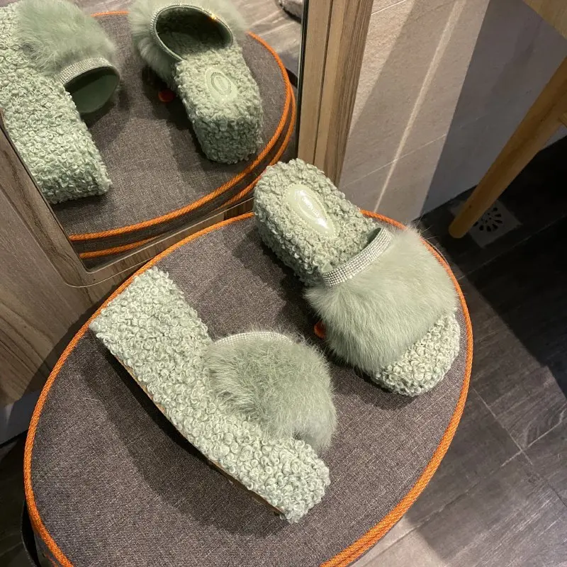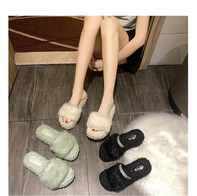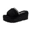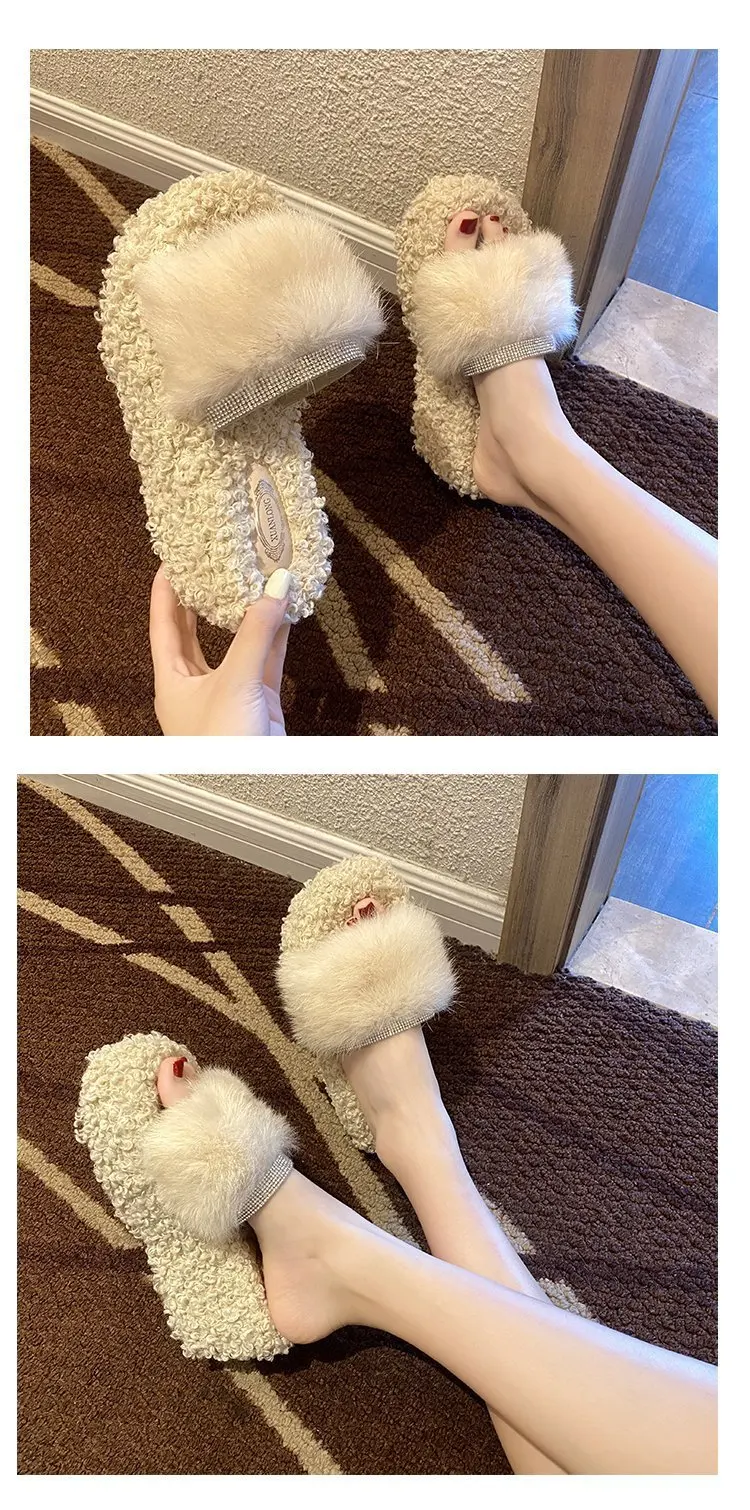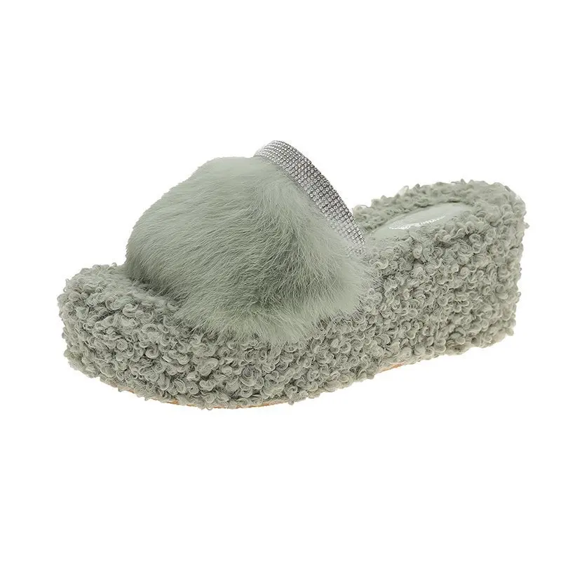 8cm high heels fur slippers women crystal band furry wedges slides open toe wool fur platform slippers female winter homes shoes