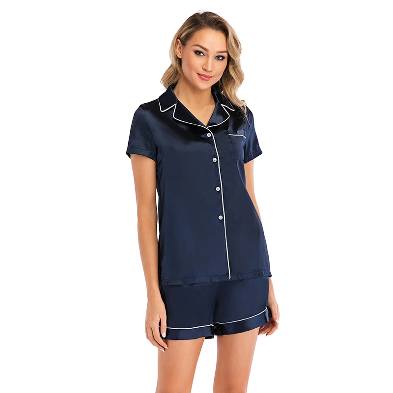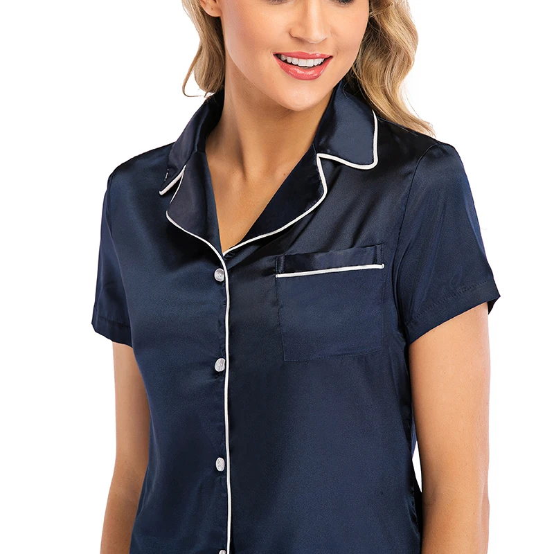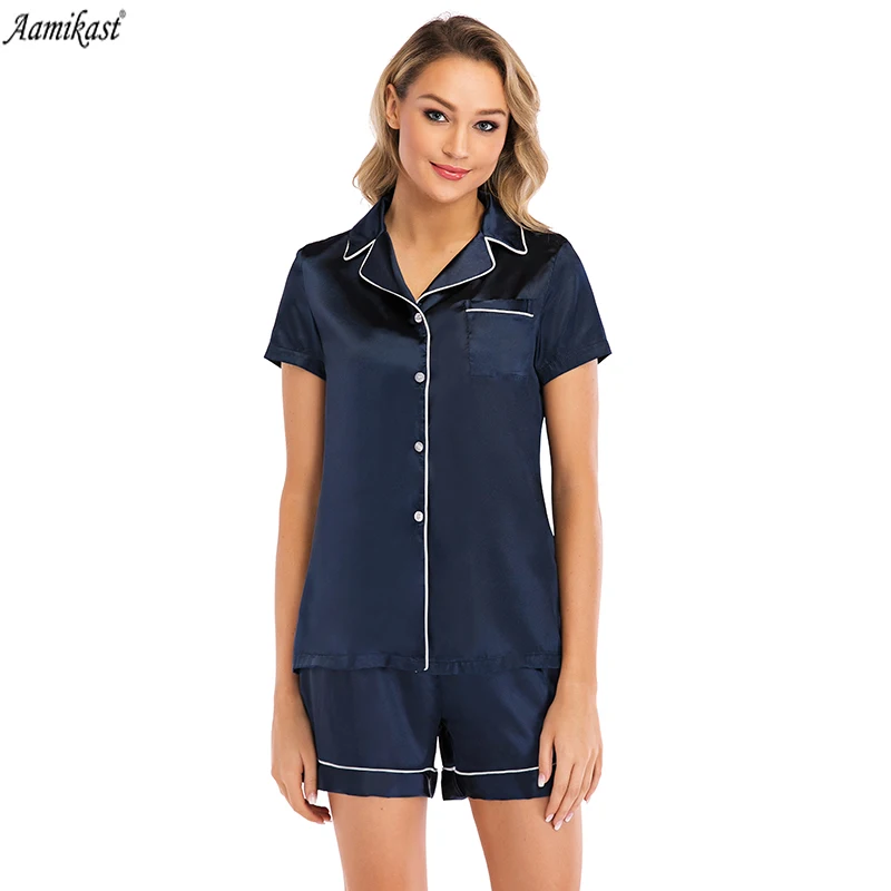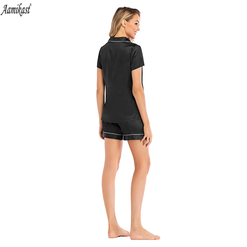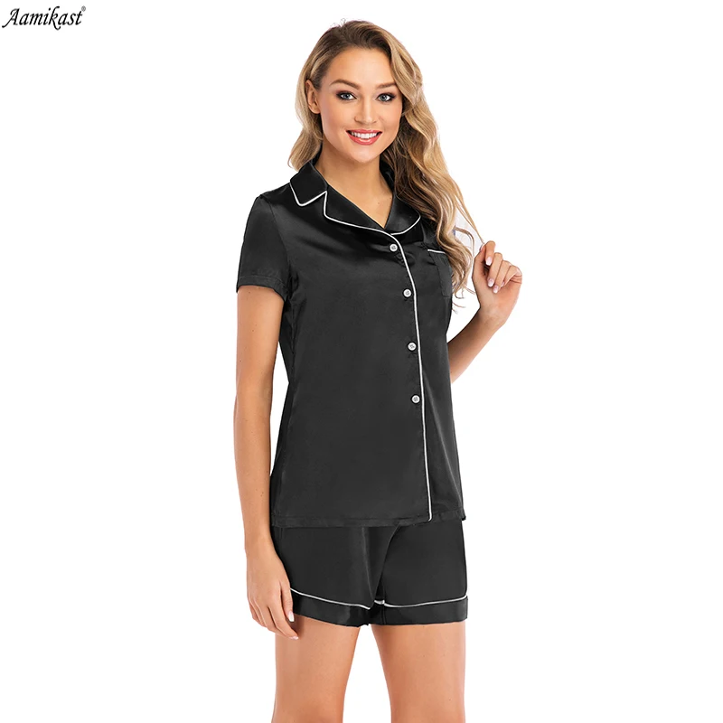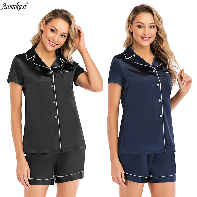 Aamikast 2019 Summer Pajamas for Women Satin Pj Sets Button Sleepwear Short Sleeve Silky Pyjama