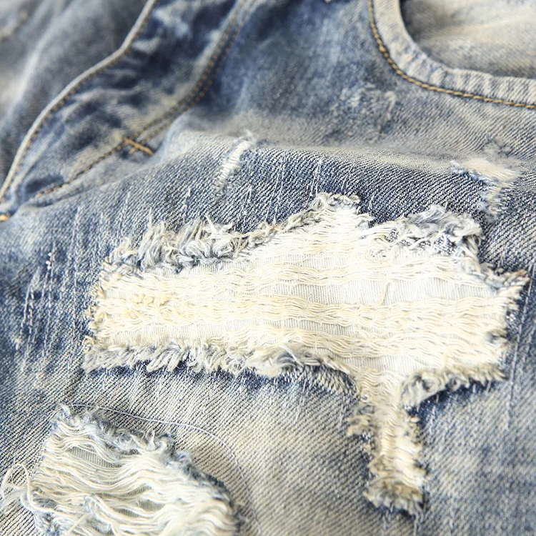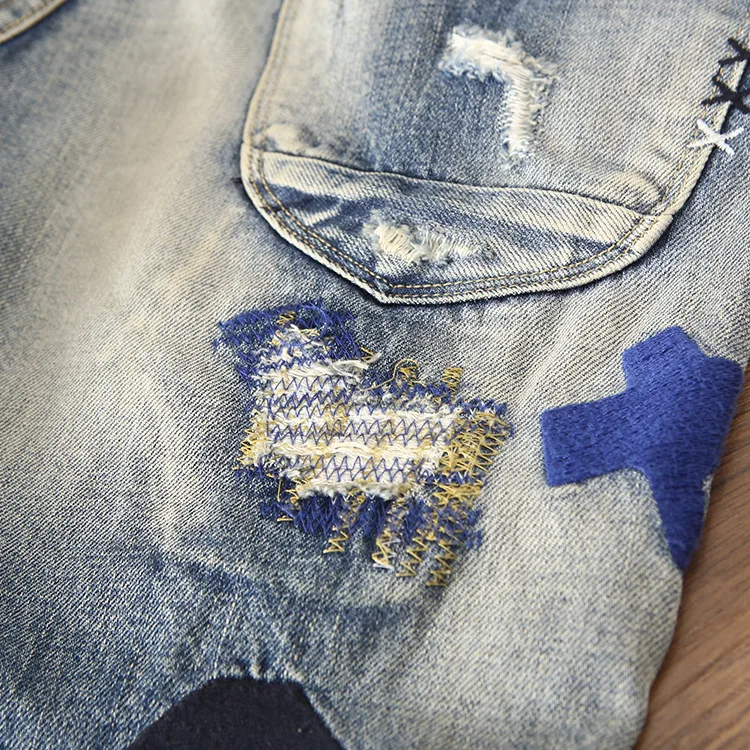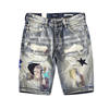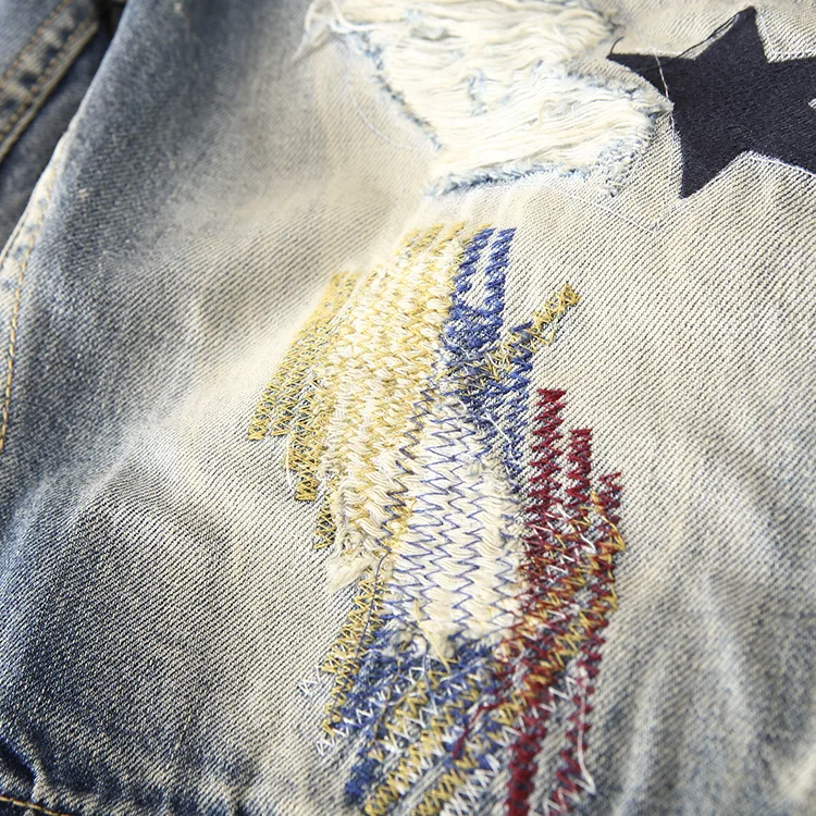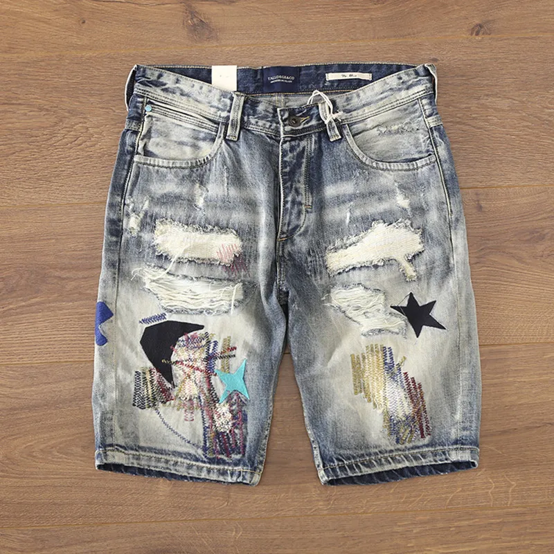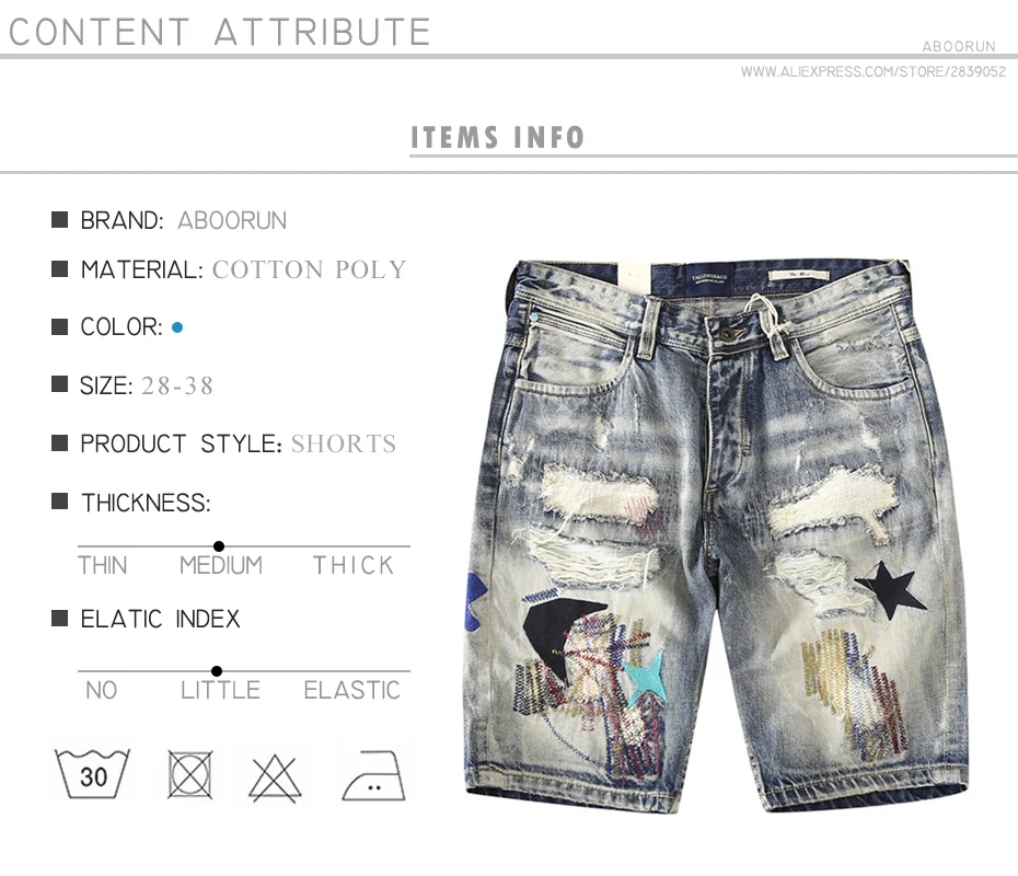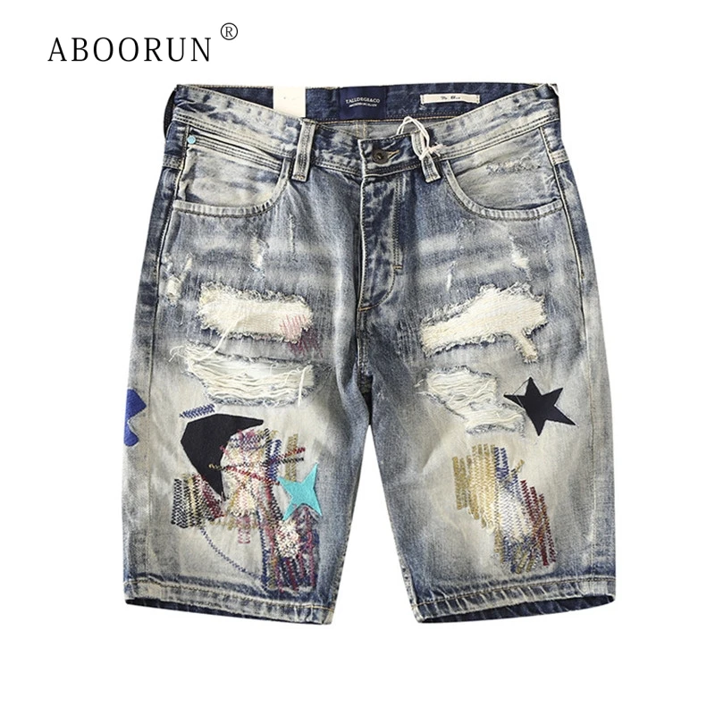 ABOORUN Hi Street Men’s Ripped Denim Shorts Distressed Pentagram Embroidery Jeans Shorts Summer Knee Length Shorts for Male R323