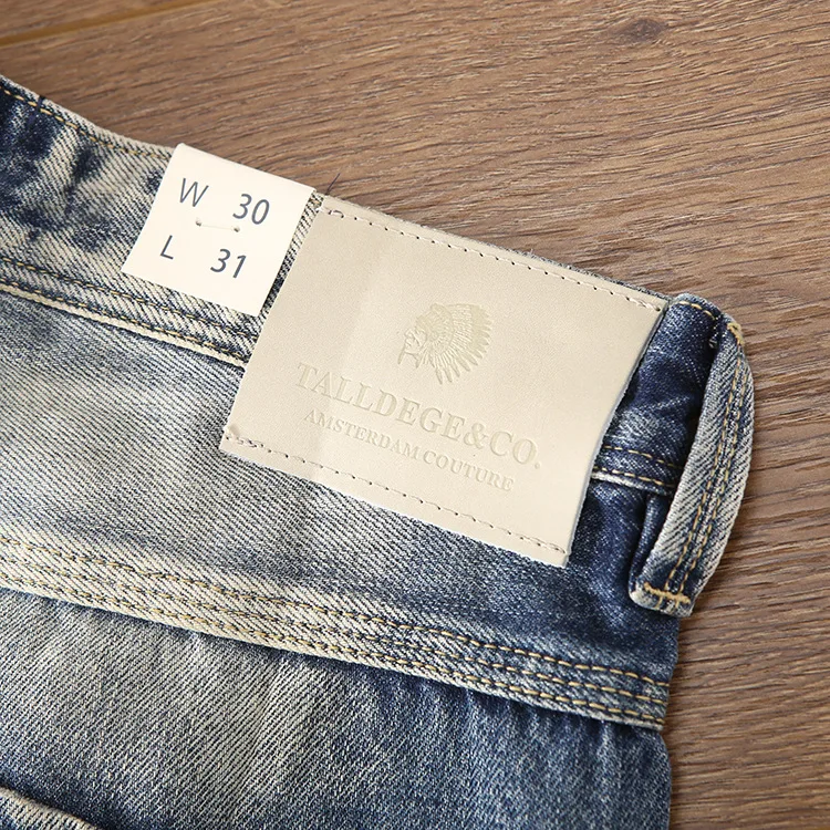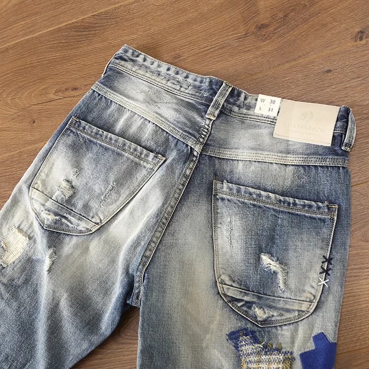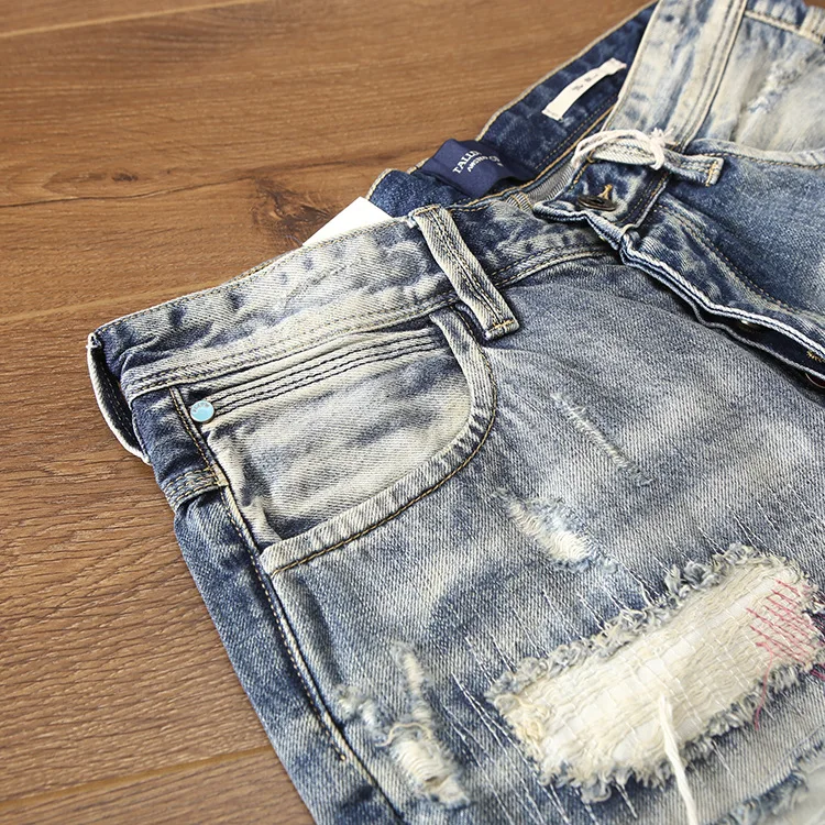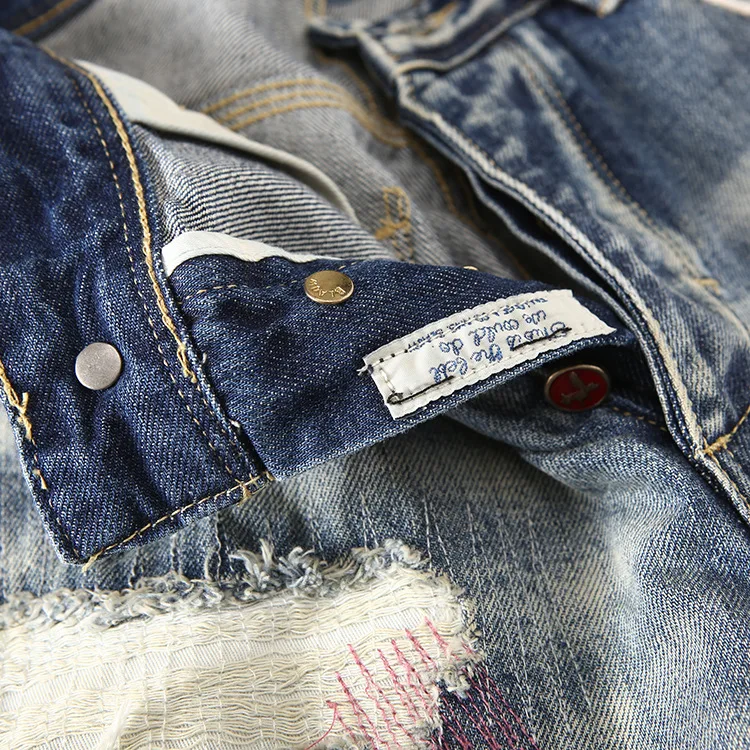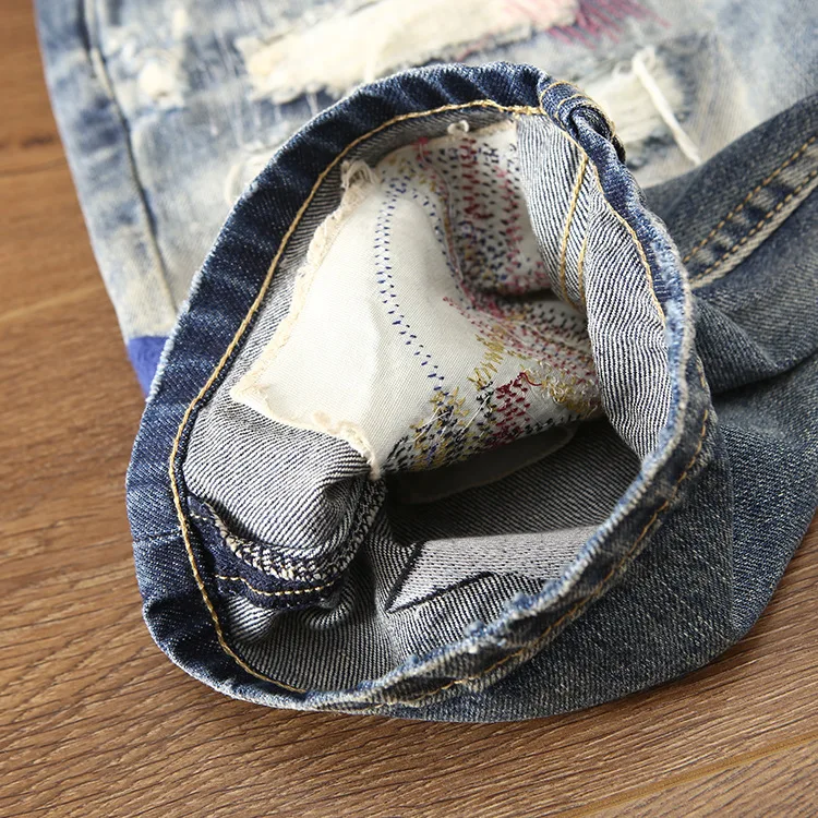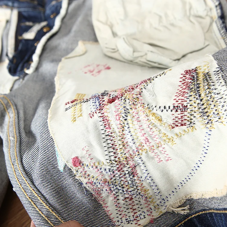 ABOORUN Hi Street Men’s Ripped Denim Shorts Distressed Pentagram Embroidery Jeans Shorts Summer Knee Length Shorts for Male R323