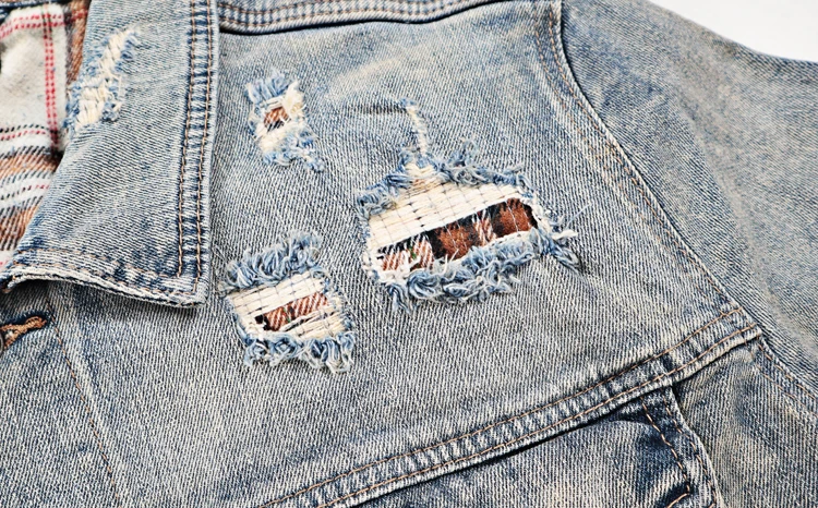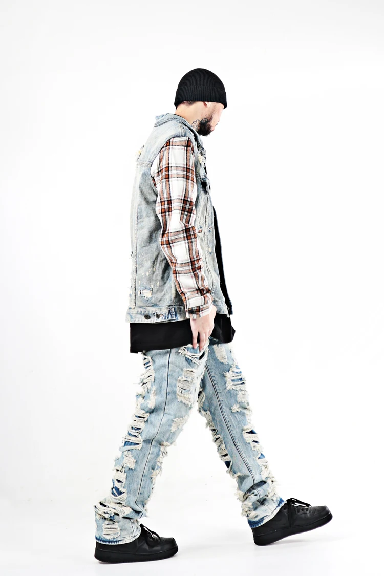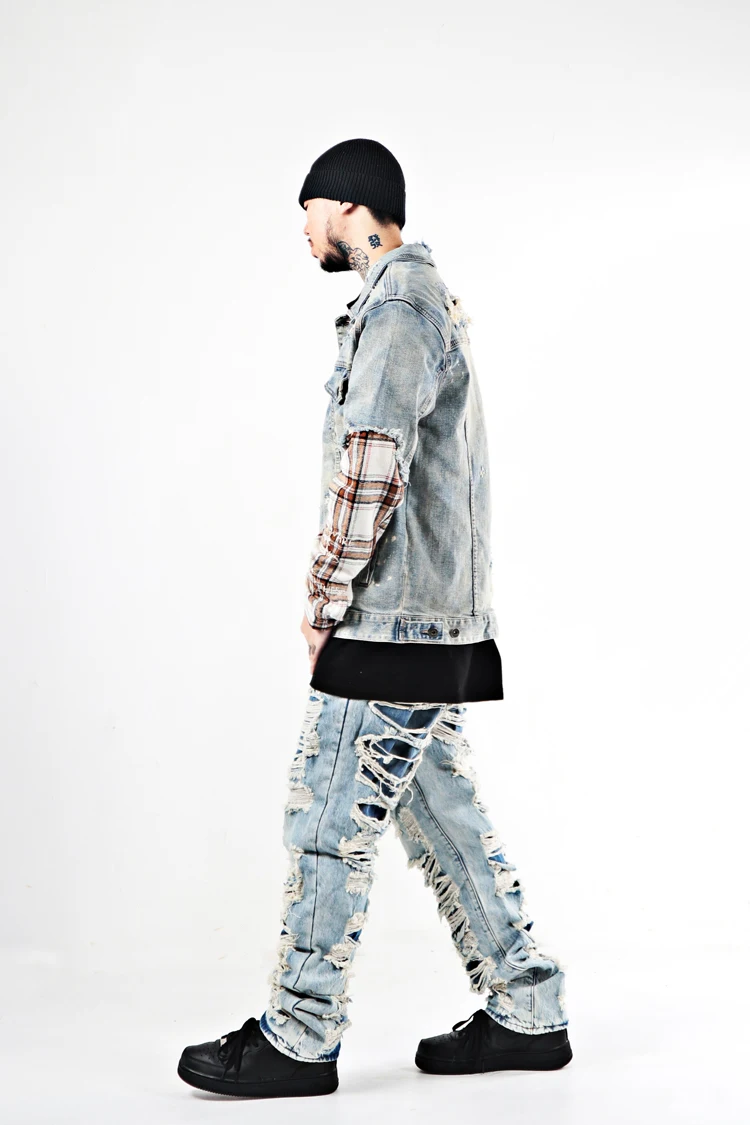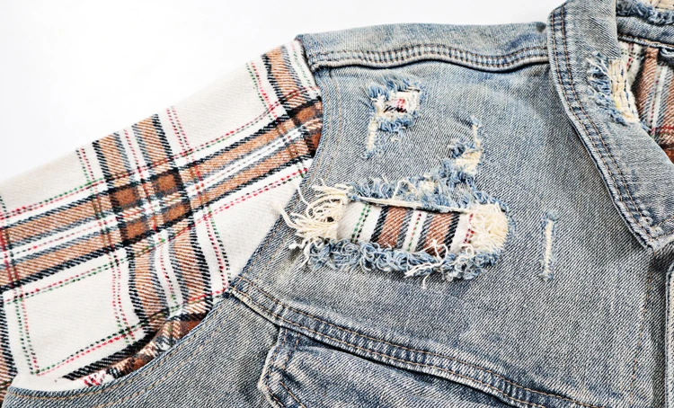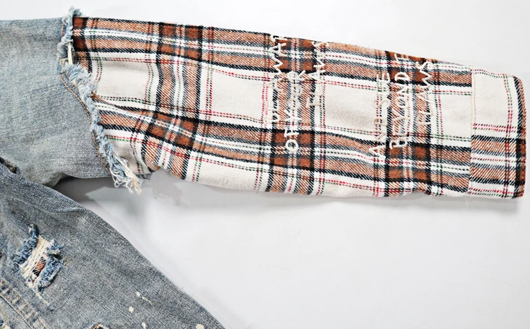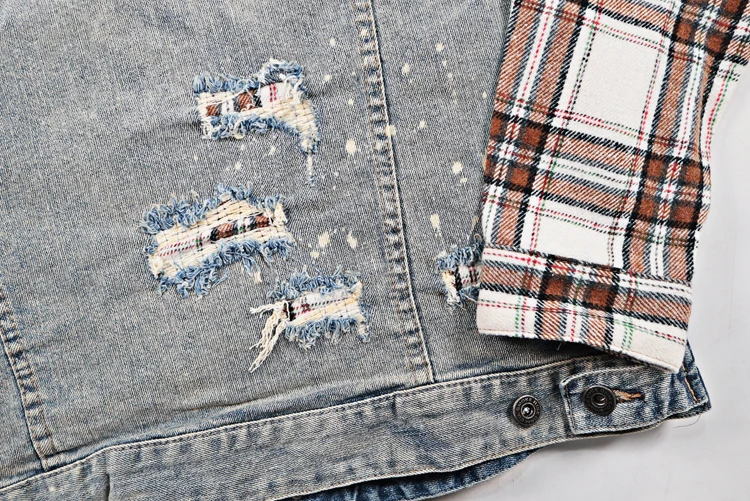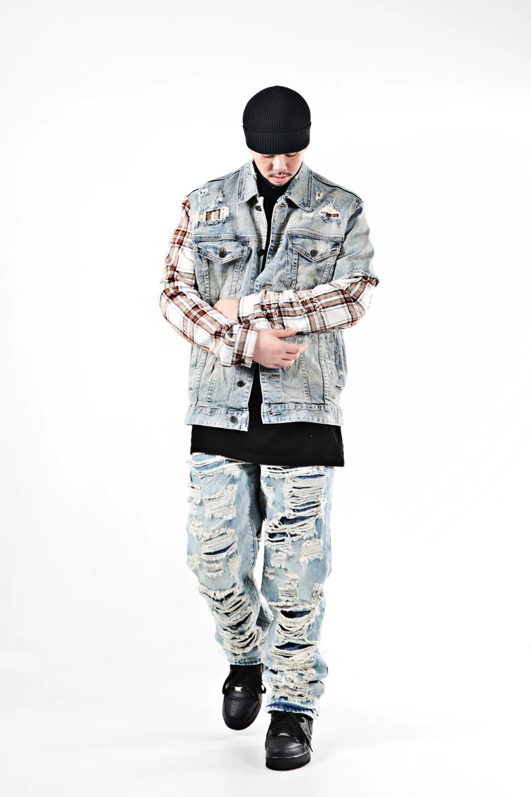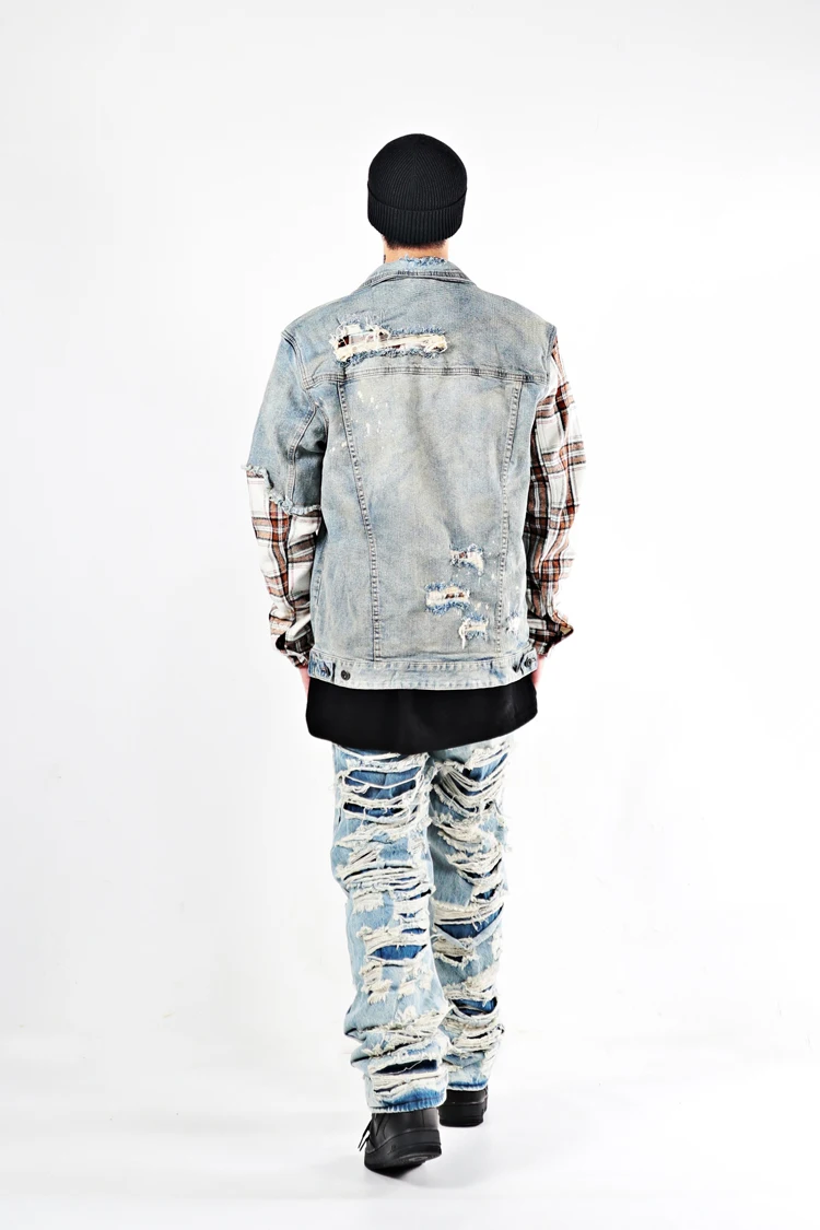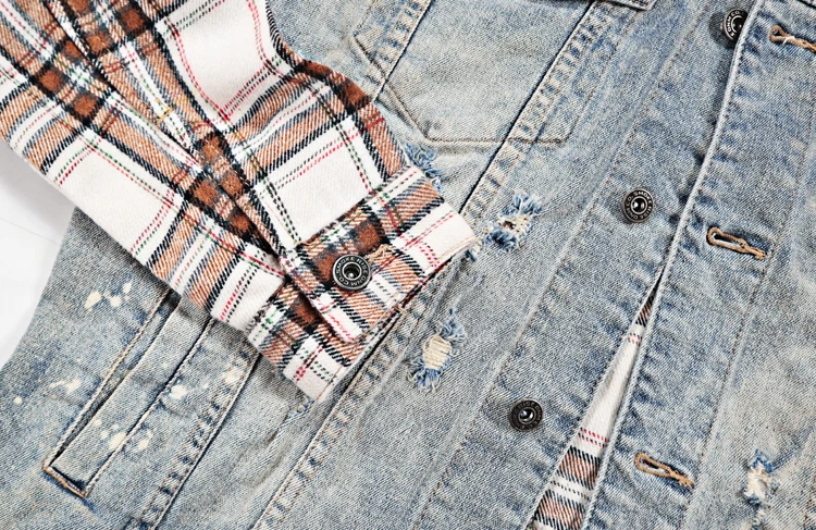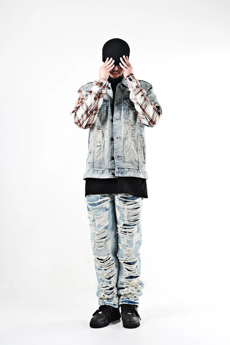 ABOORUN Men Hi Street Denim Jackets Plaid Patchwork Coats Streetwear Oversize Coat for Male