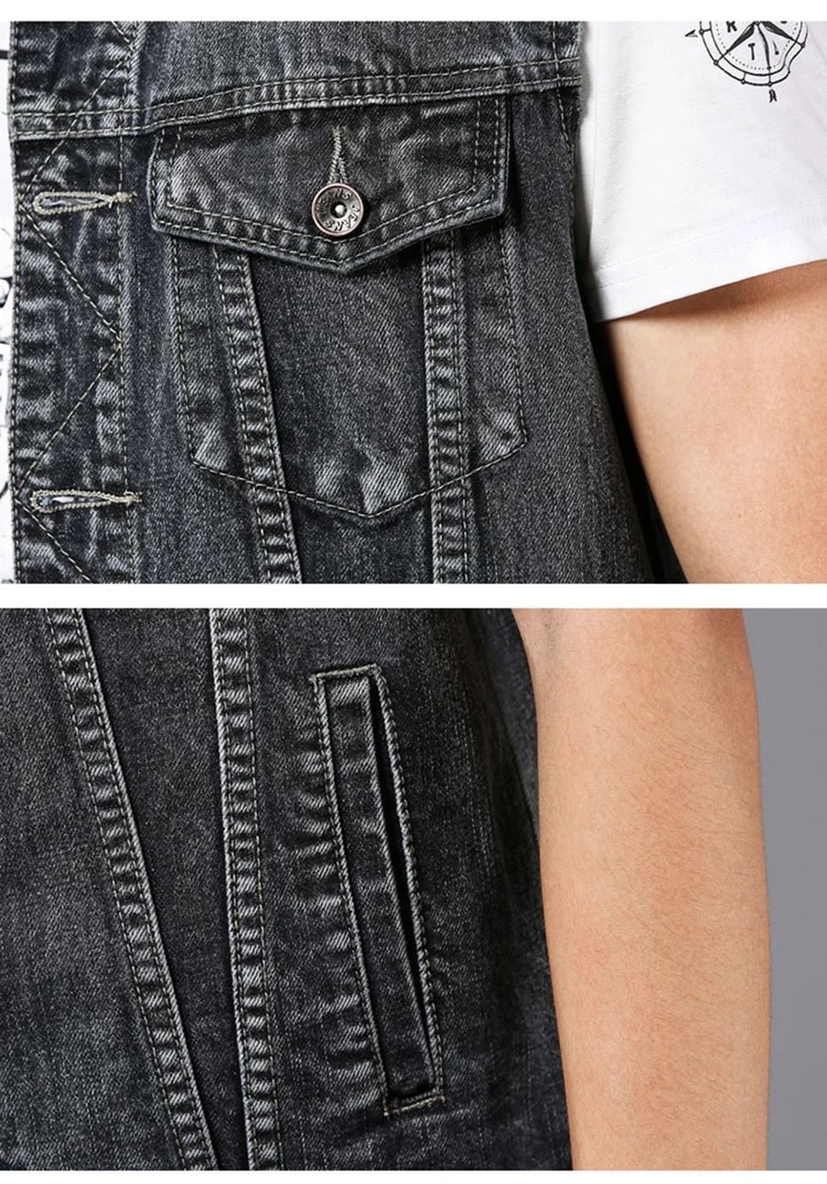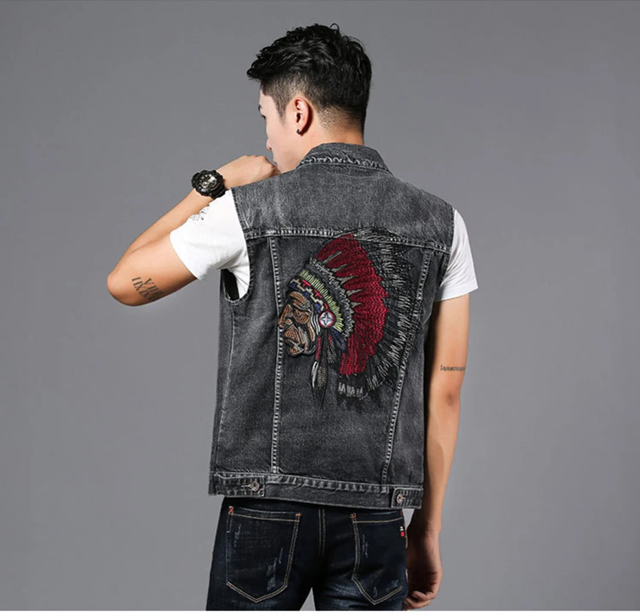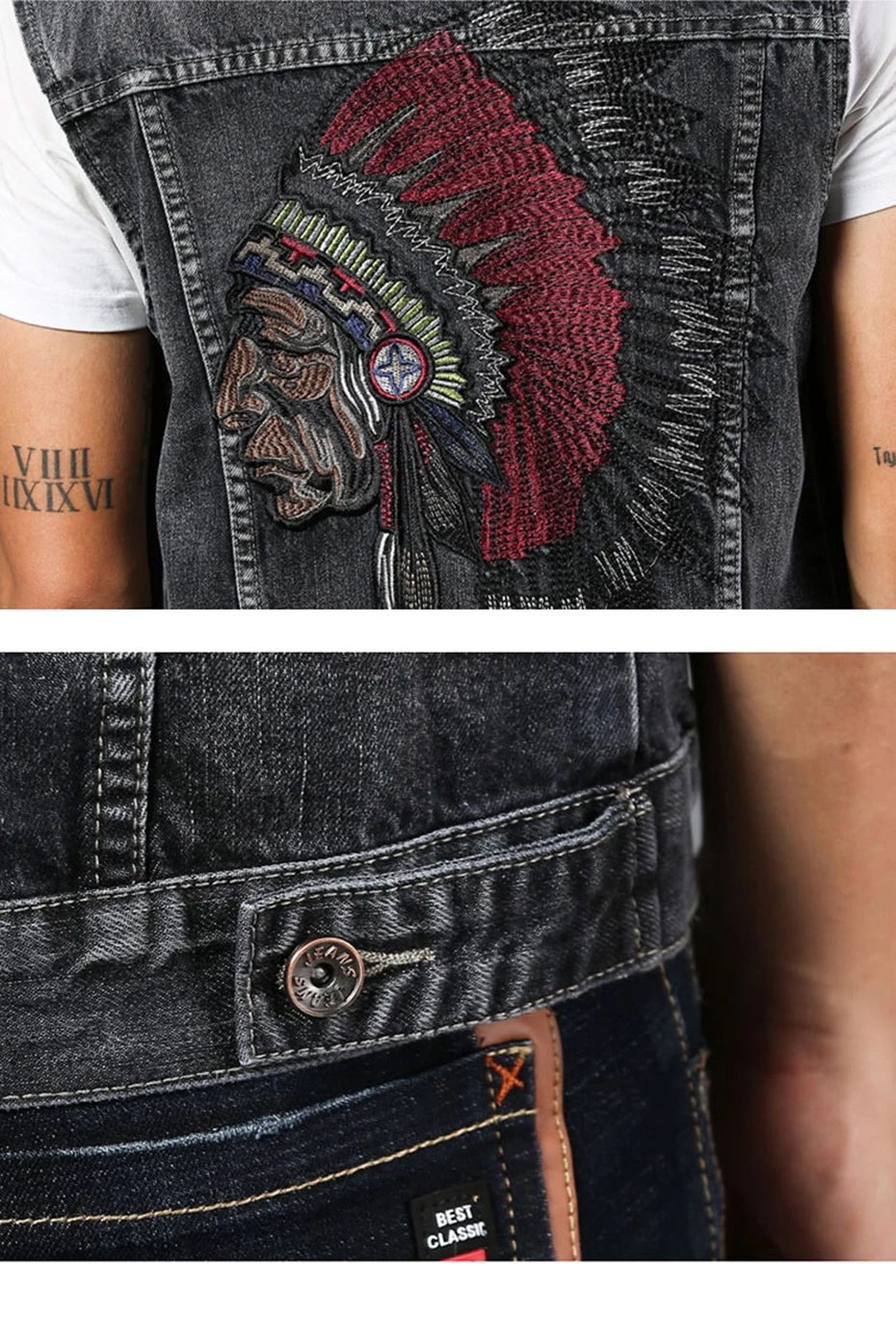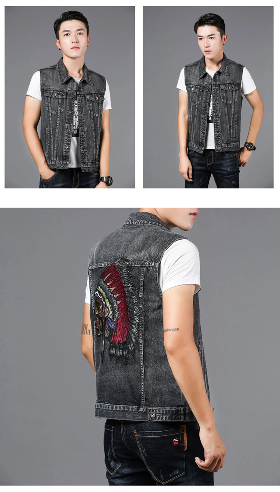 ABOORUN Men’s Fashion Denim Vest Black Embroidery Slim fit Jean Waistcoat Spring Autumn Sleeveless Jacket for Male x1855