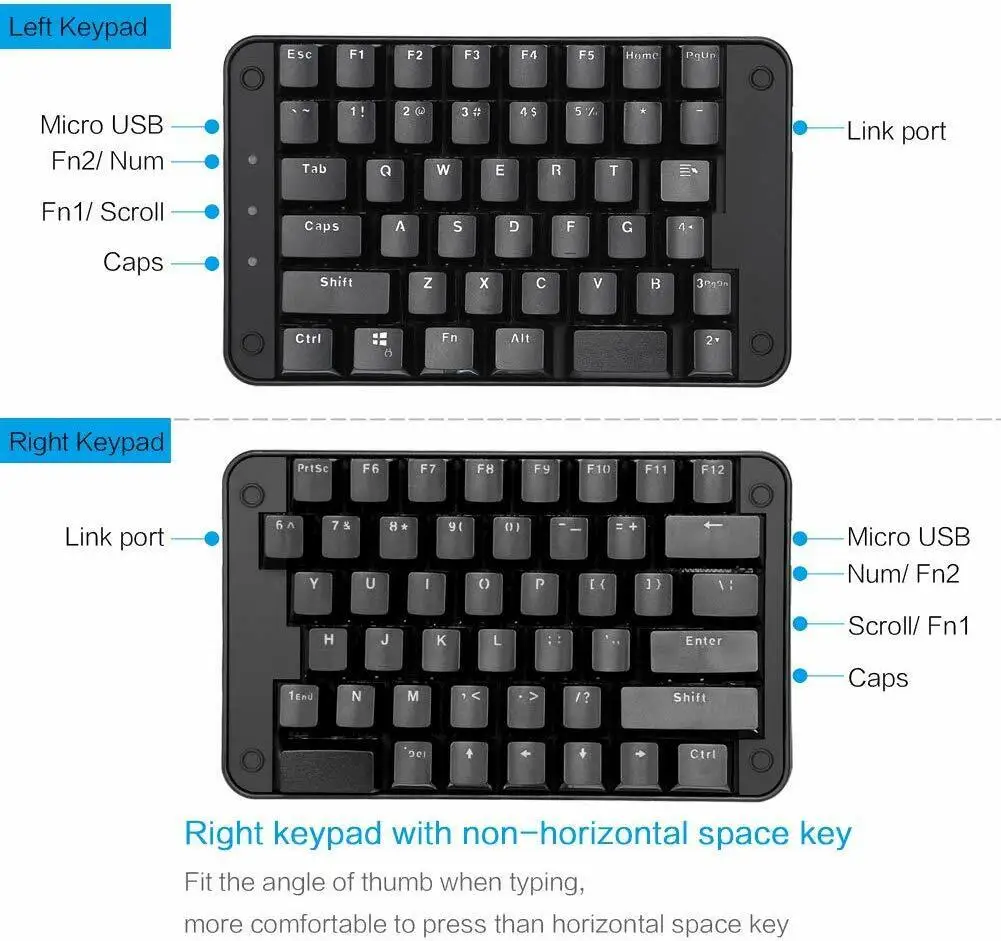 Right keypad with non-horizontal space key: fit the angle of thumb when typing, more comfortable to press than horizontal space key