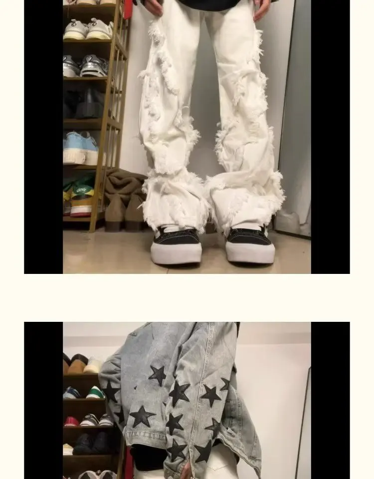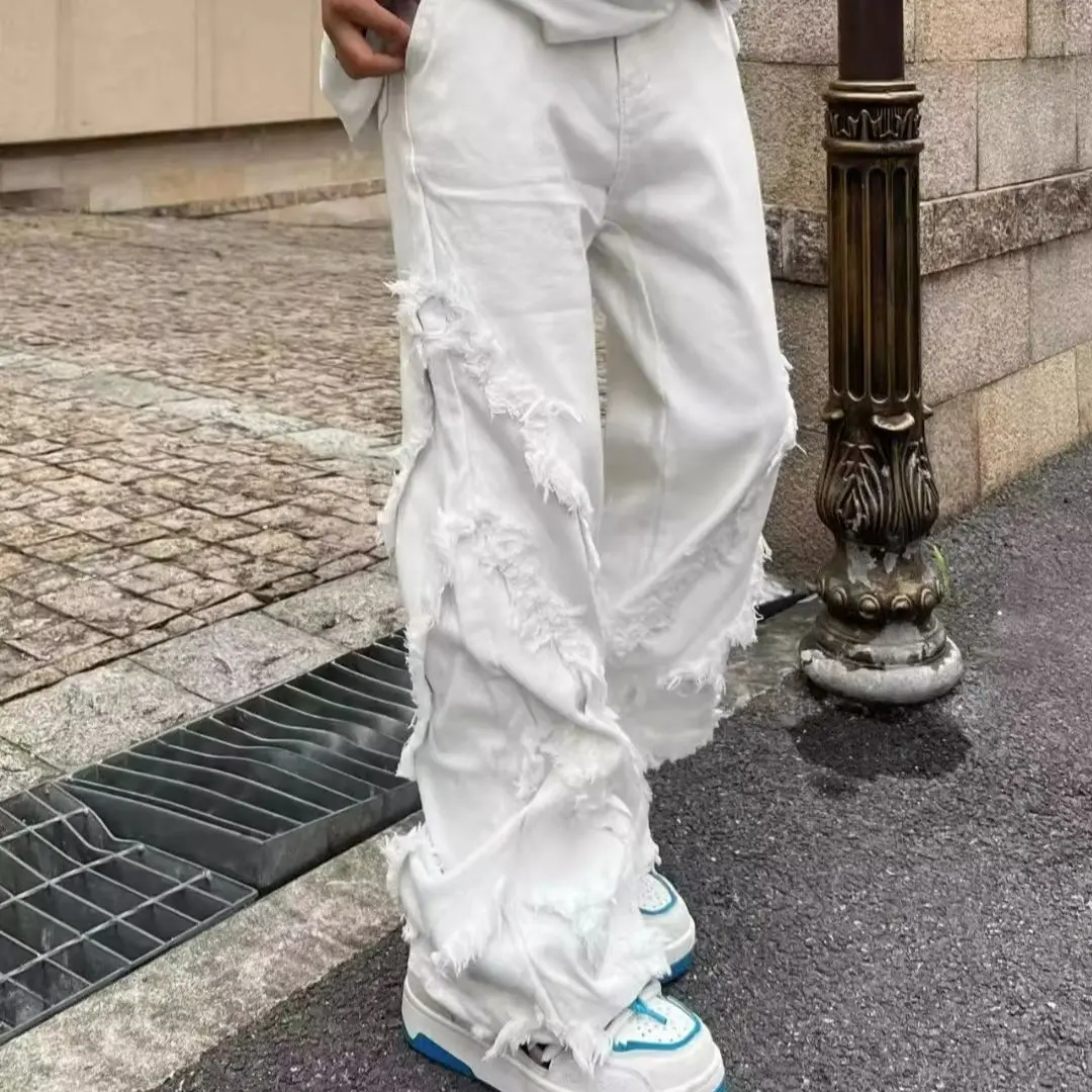 American Style Erosion Damage Raw Edge Street Jeans Men’s Harajuku Style Hip-hop Dance Straight White Jeans Women’s Y2k Clothing