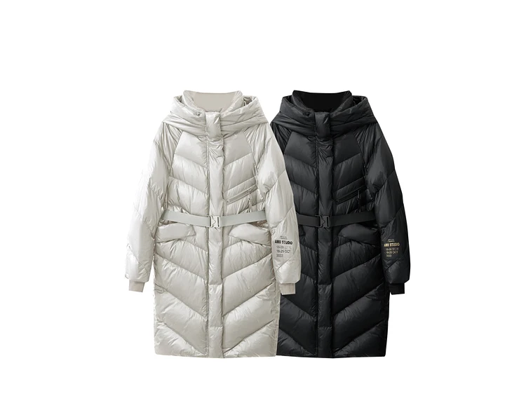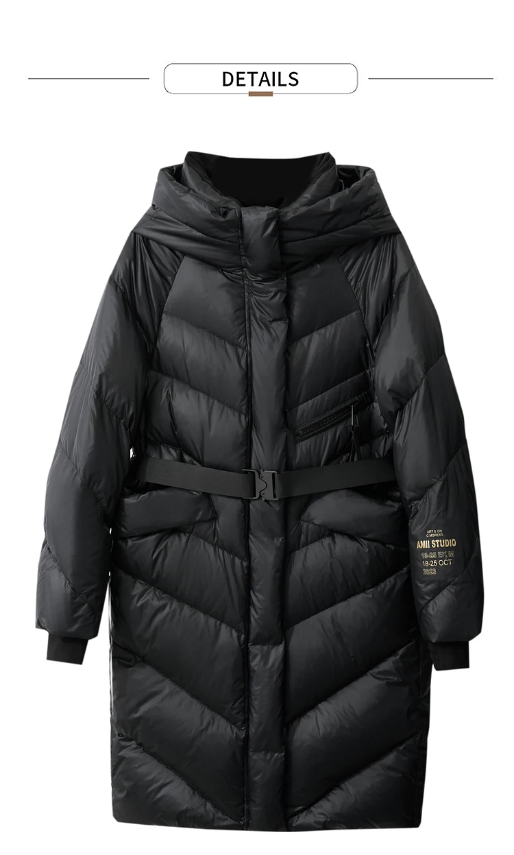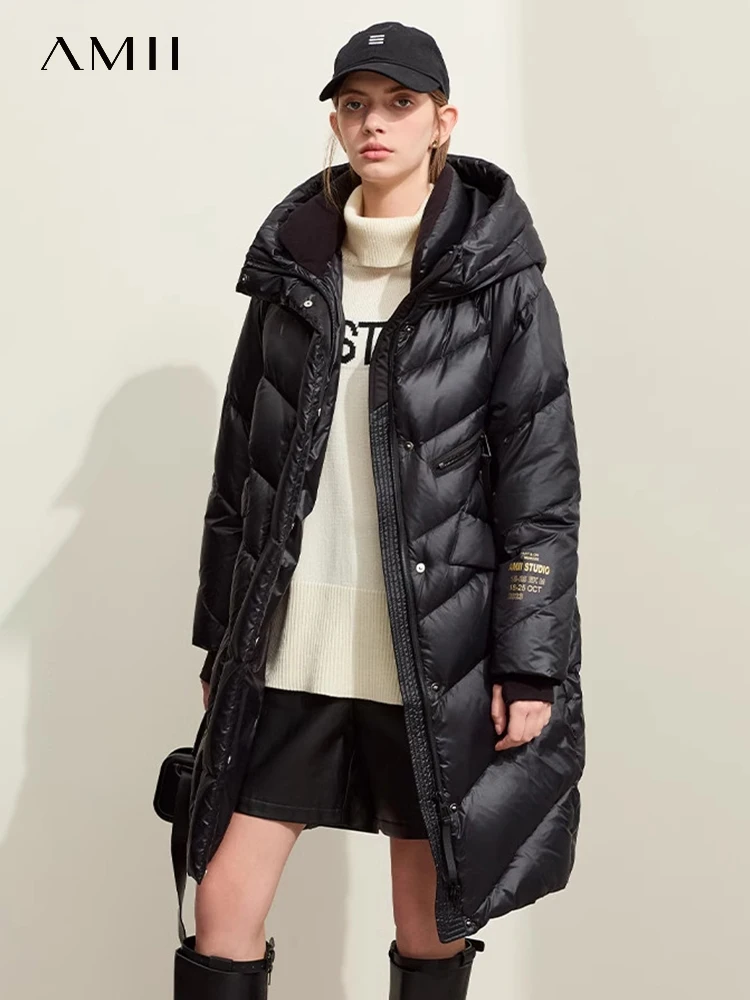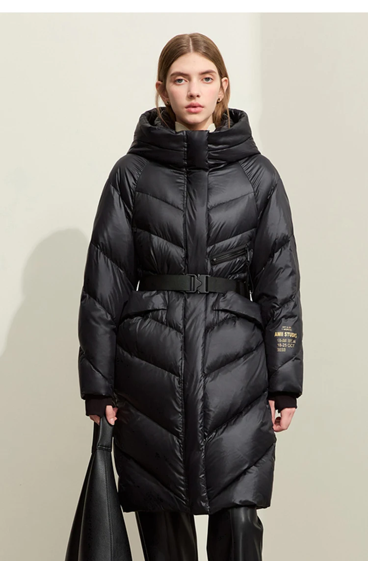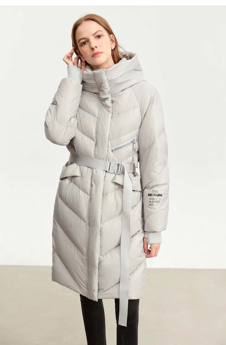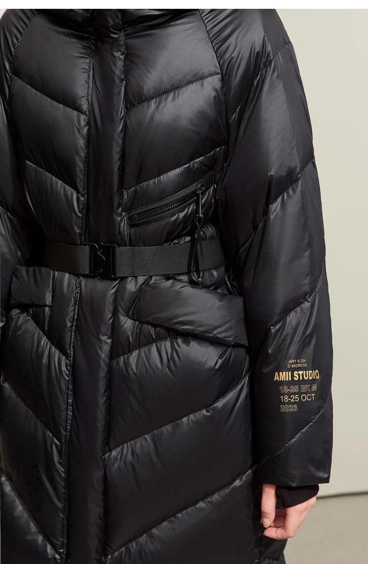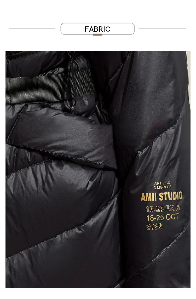 AMII Minimalist 2023 Winter Down Puffer Coat For Women New Warm Hooded With Belt Outerwear Female Letter Print Top 12324011